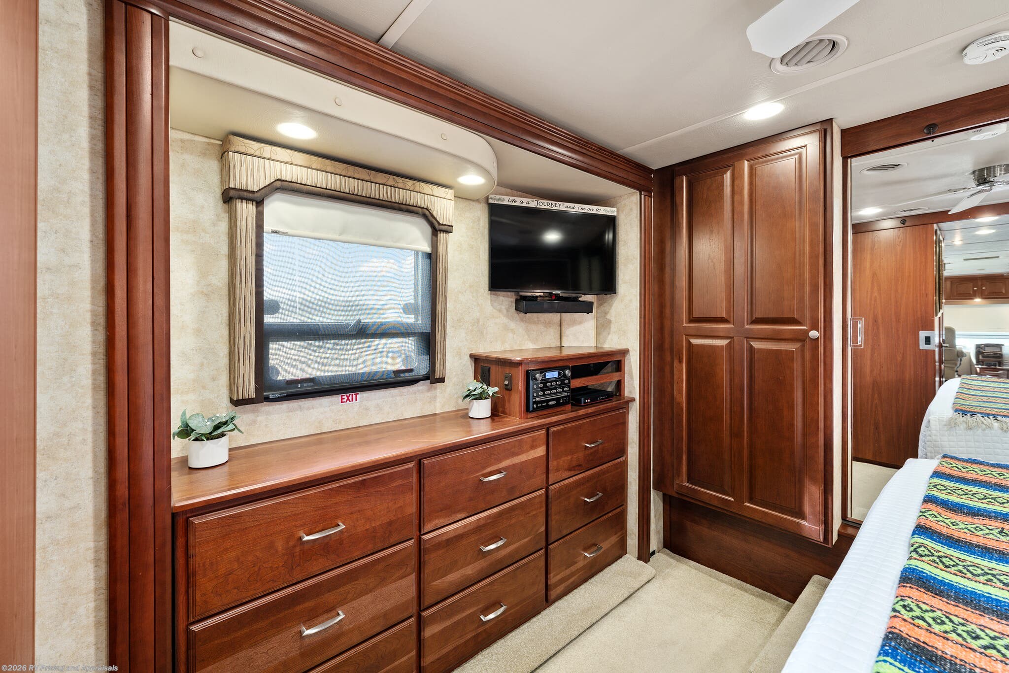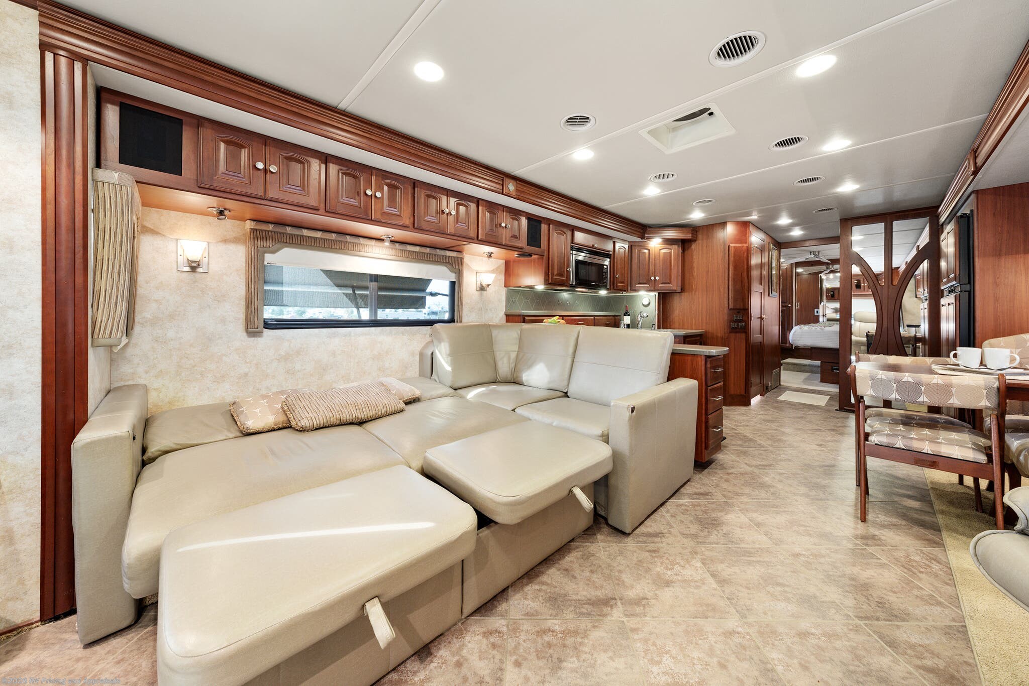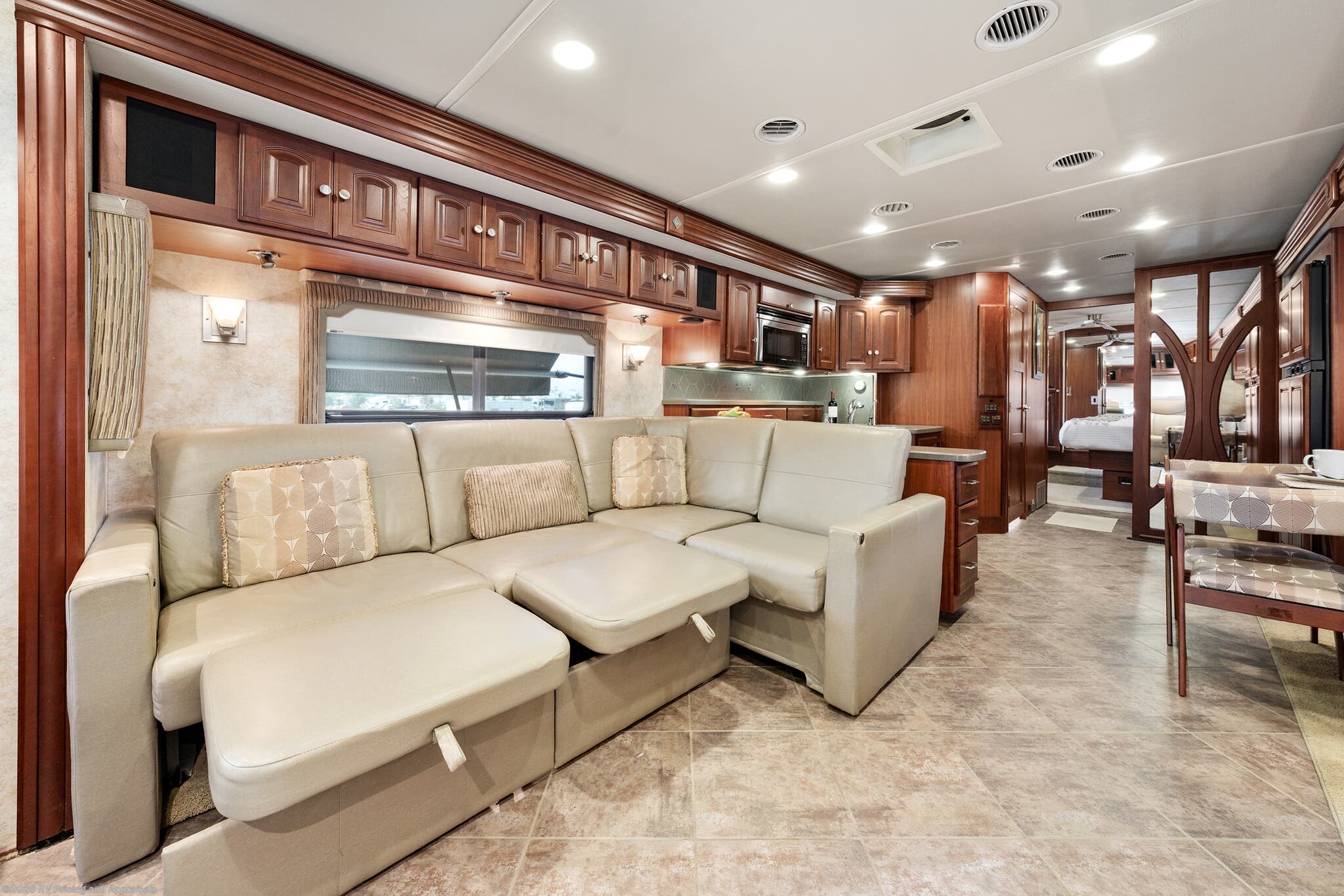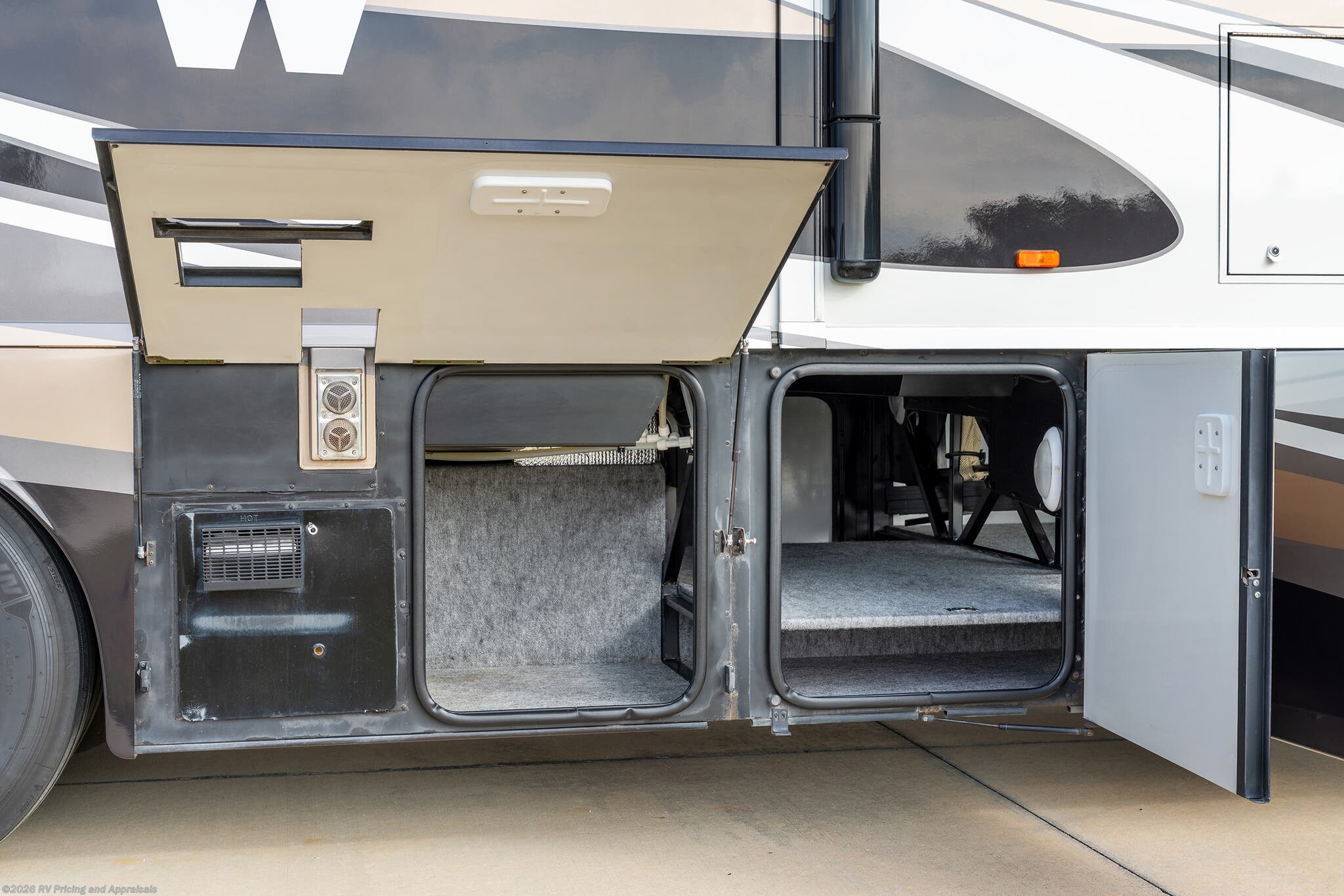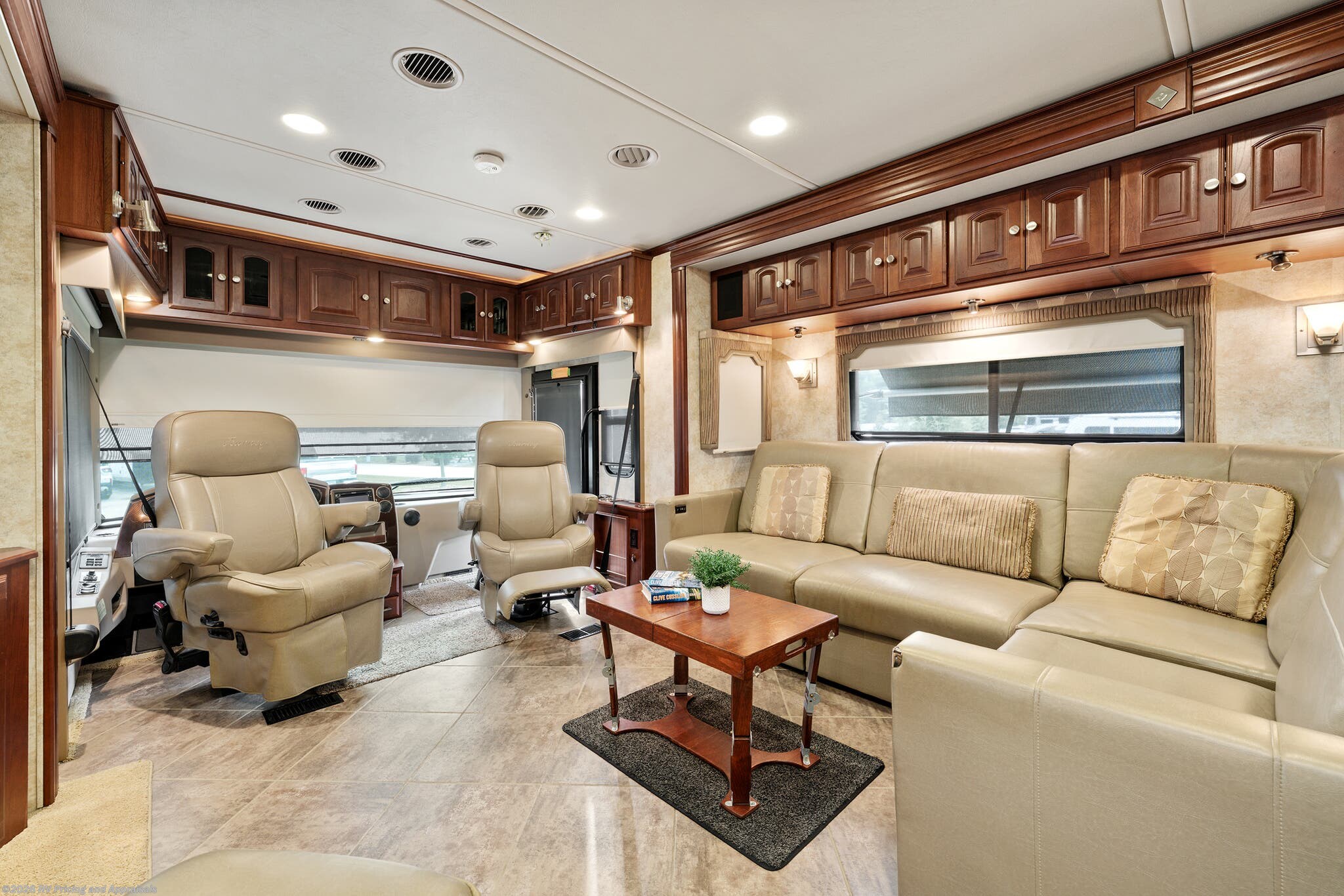 •Entertainment: Exterior TV/DVD/radio combo plus two interior upgraded 4K Smart TVs with Blu-Ray and home theater surround sound for cinematic experiences. Satellite radio capable.