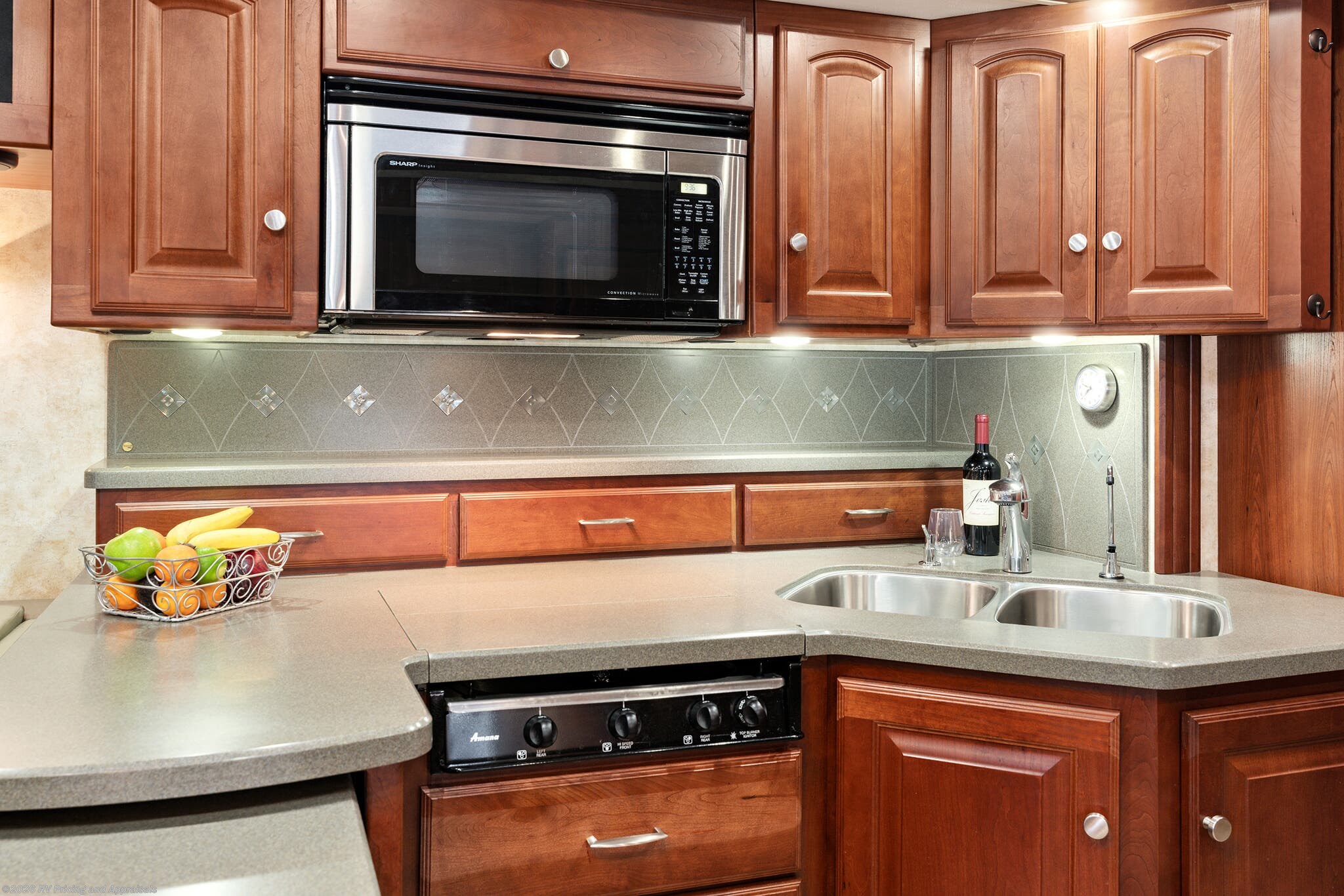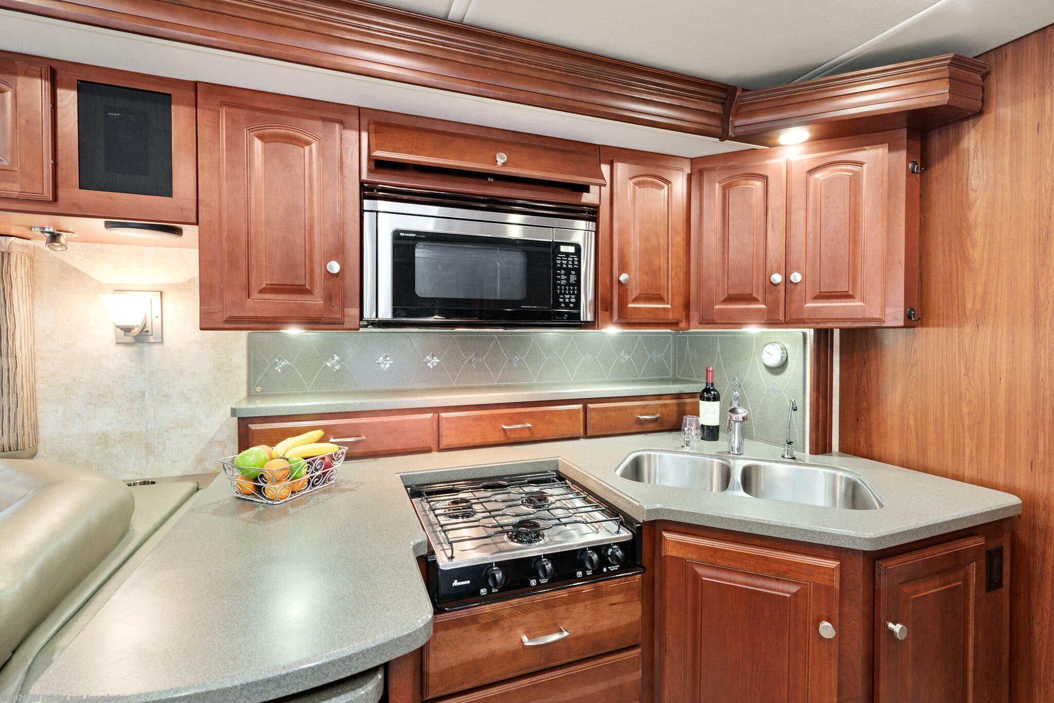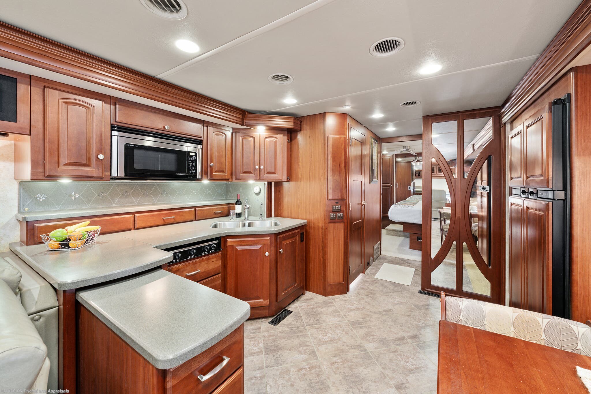•Kitchen features Corian Countertops with a pull-out island extension for extra space, pantry, convection microwave with a covered three-burner cooktop, with a double stainless-steel sink, along with the upgraded 120 Volt dual compressor refrigerator/freezer complete with ice maker.