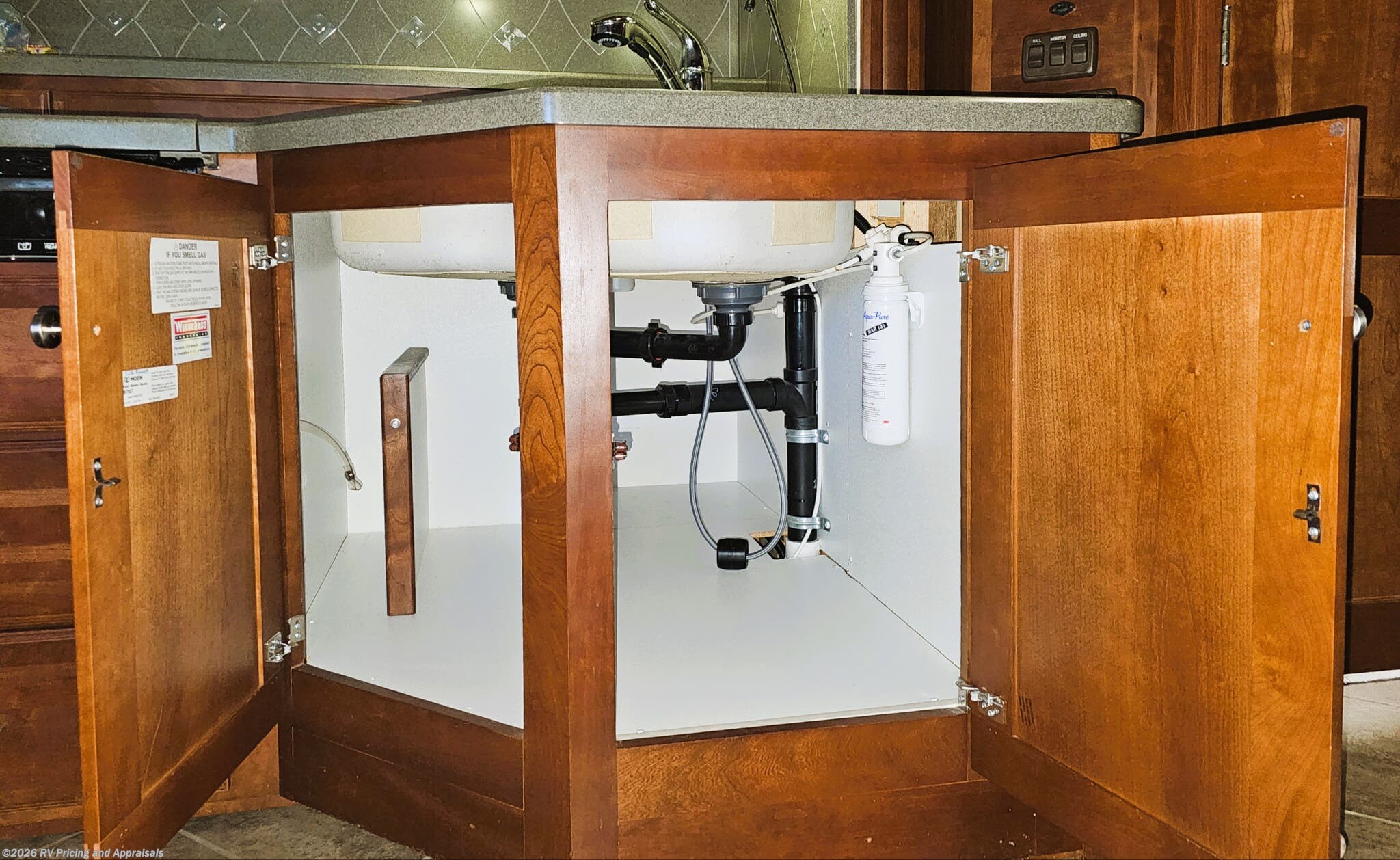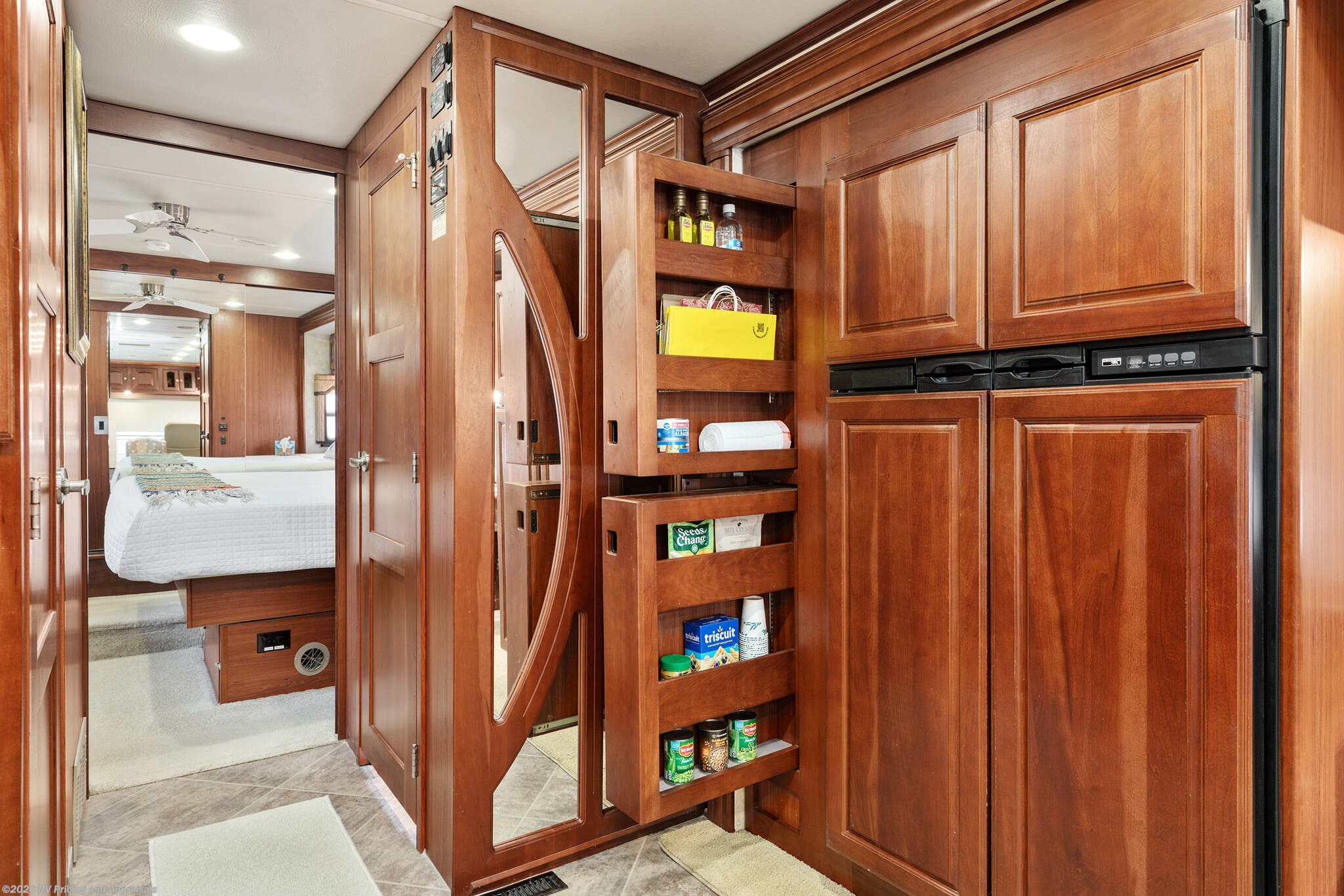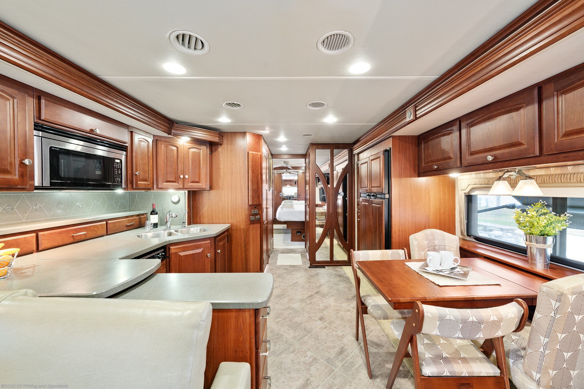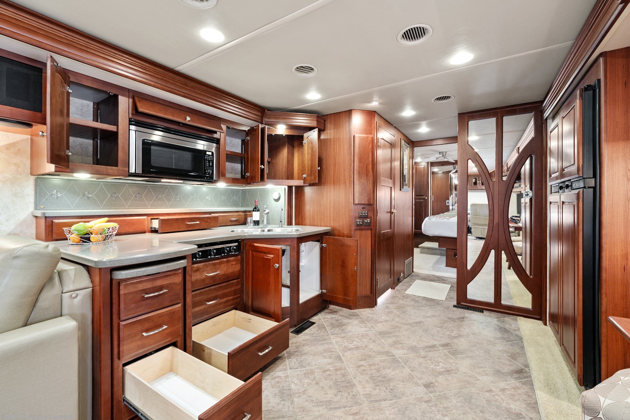 •Kitchen features Corian Countertops with a pull-out island extension for extra space, pantry, convection microwave with a covered three-burner cooktop, with a double stainless-steel sink, along with the upgraded 120 Volt dual compressor refrigerator/freezer complete with ice maker.