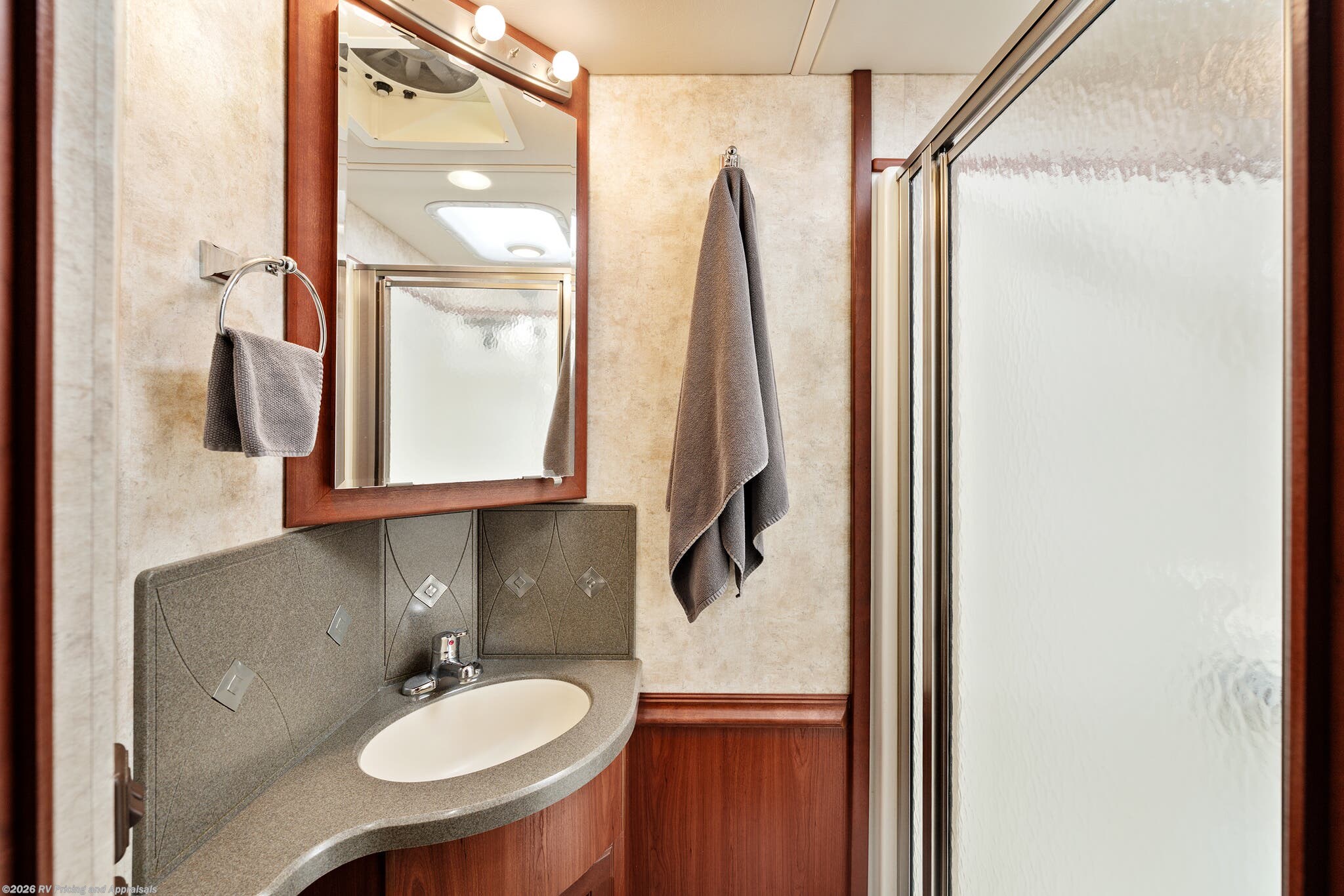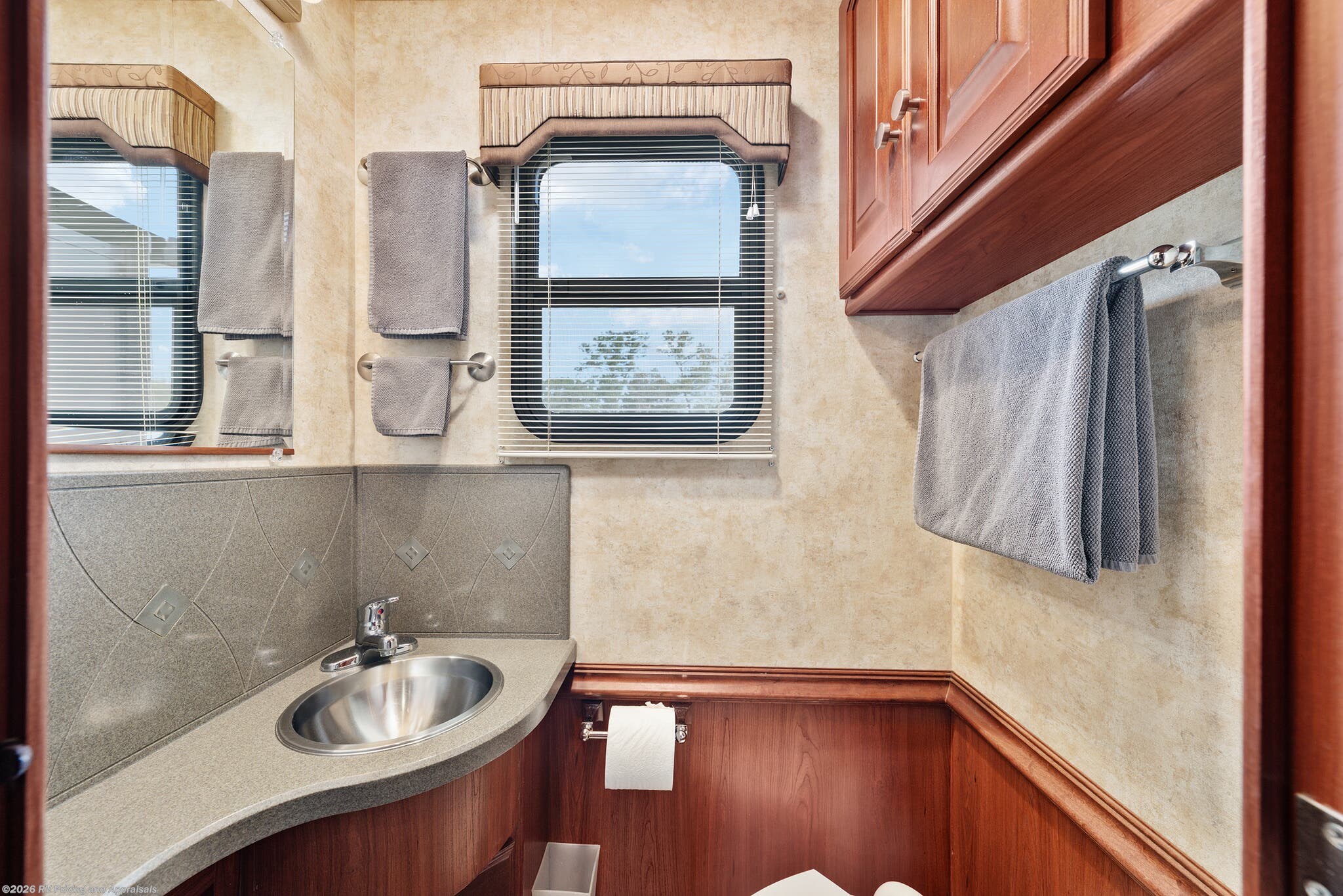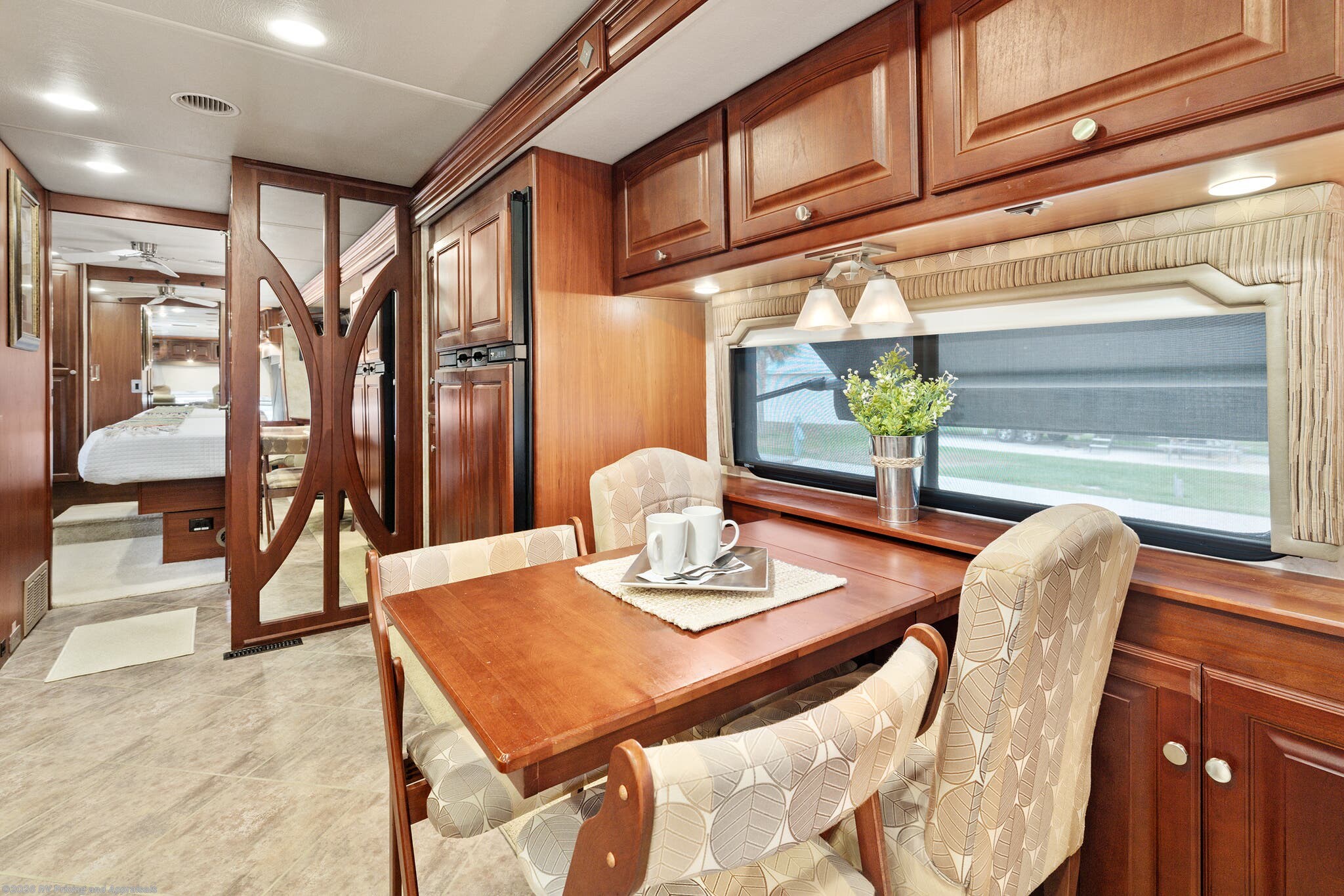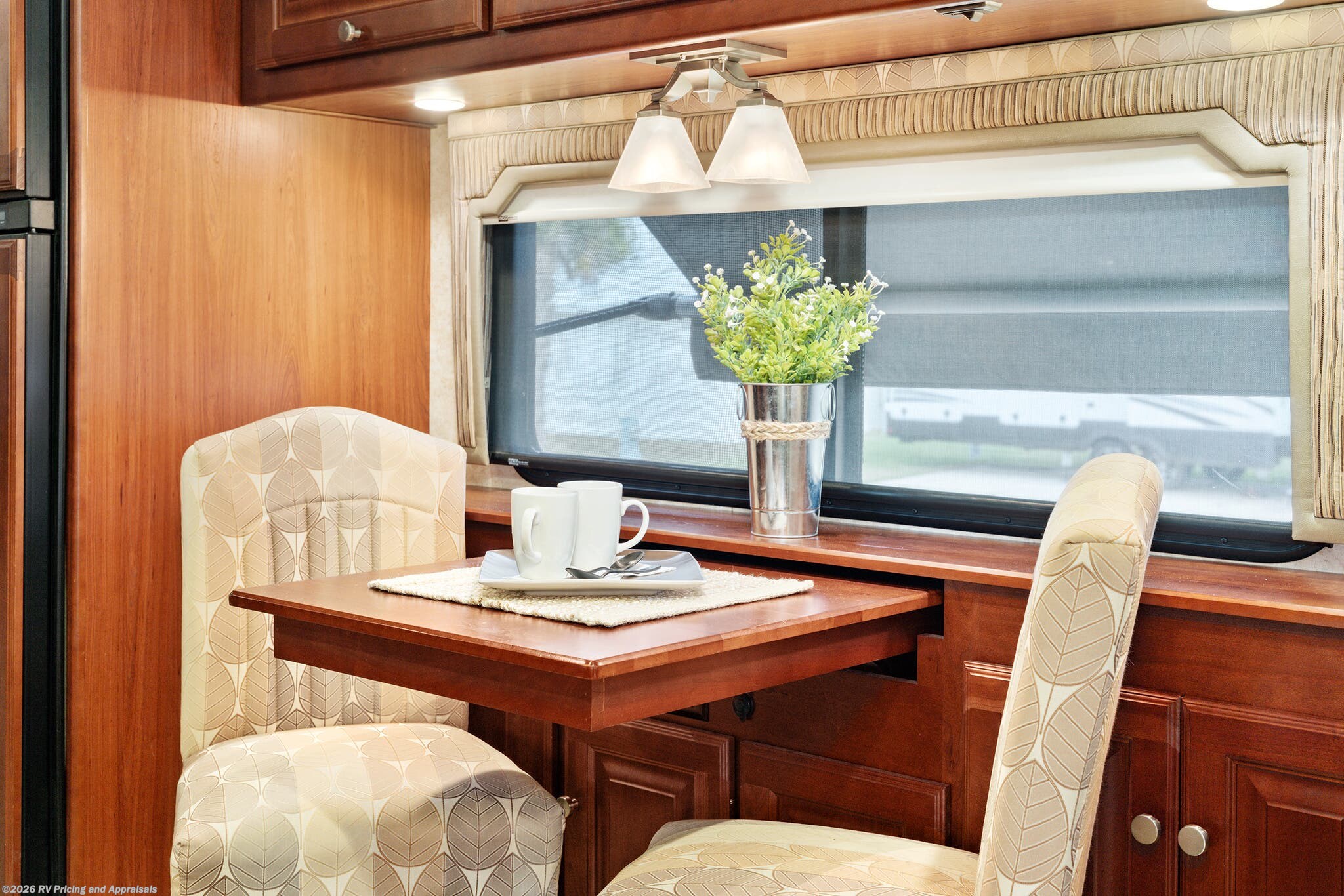 •Interior finishes in Hawthorne/Neutral tones paired with Forest Cherry cabinetry, Corian Countertops with upgraded window valances and MCD day/night shades throughout coach for a timeless look.