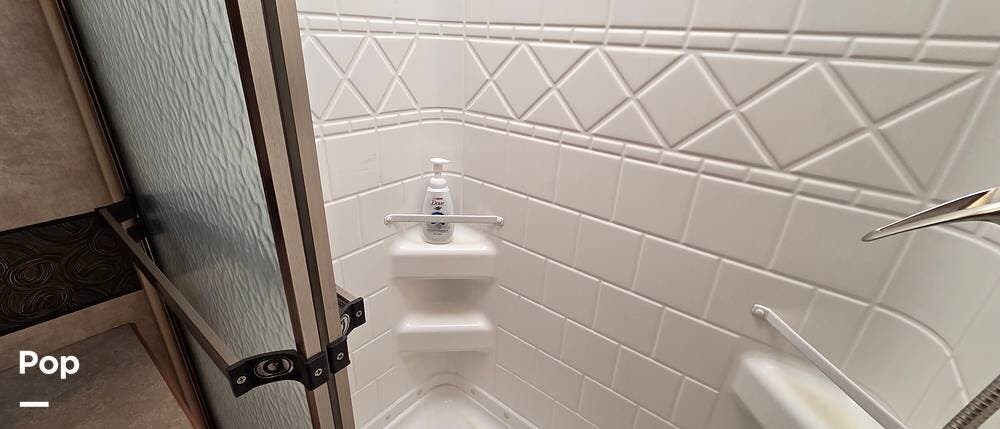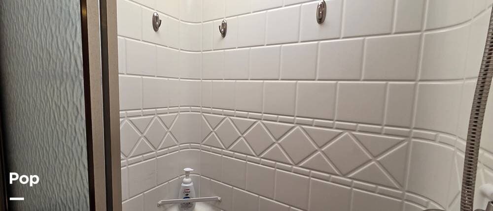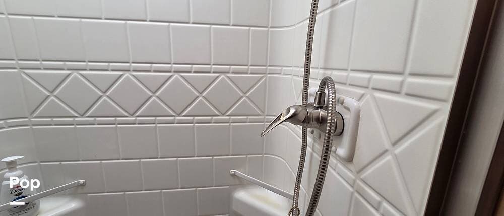 The bath features a toilet, plenty of storage, an oversized shower, and a towel rack on the door. The bathroom also features a dual sliding door for privacy in the rear bedroom.
