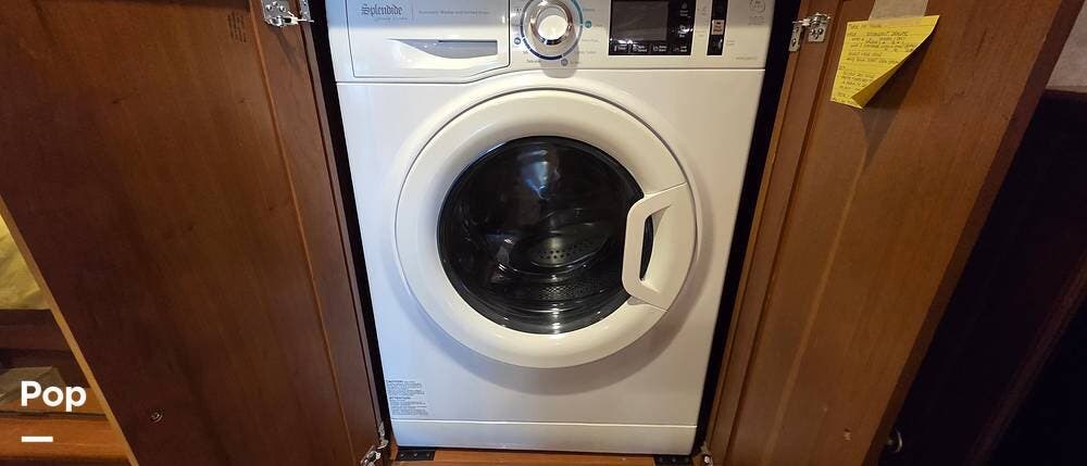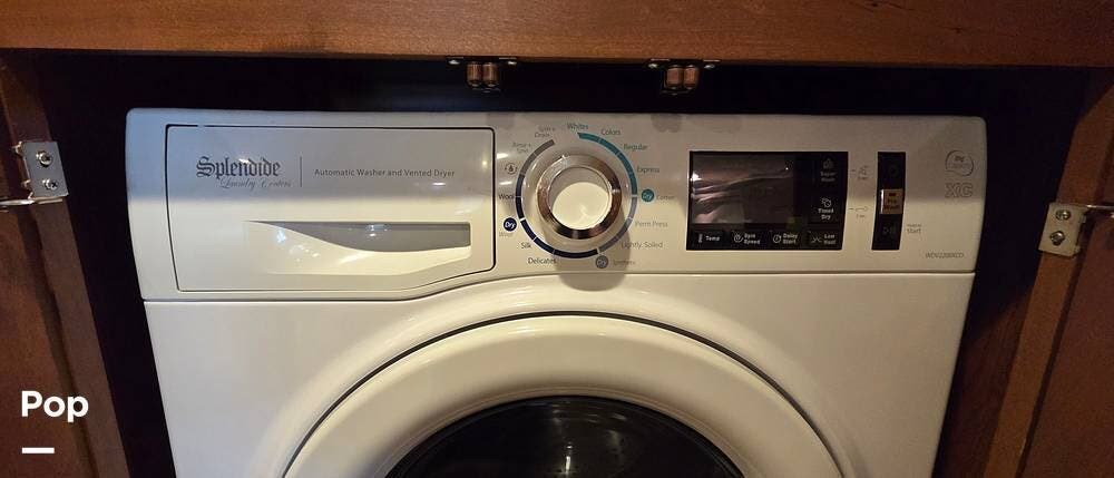 The bedroom features a queen-sized mattress with under-bed storage that holds the two additional folding chairs for the dinette. It also features plenty of storage, another TV, and a big closet with a combination washer and dryer.