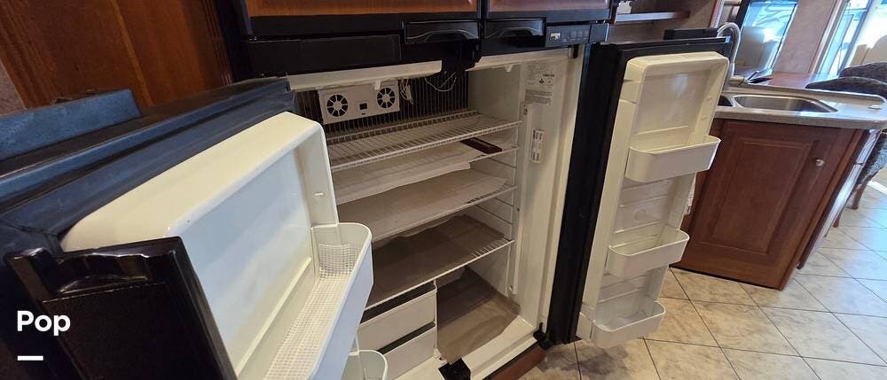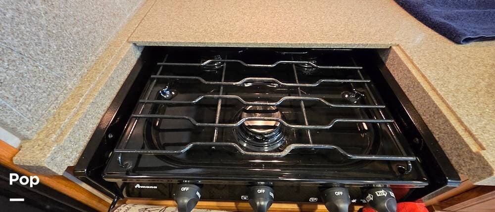 The kitchen's Corian countertops surround a three-burner stove and a convection microwave, with a double stainless steel sink and ample storage. Plus, a full-size four-door refrigerator freezer with a built-in ice maker.