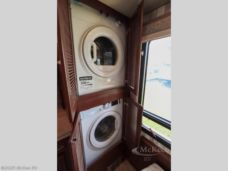 Step inside and you’ll immediately notice the spacious quad-slide floorplan designed for comfort and entertaining. The large rear master suite features a king-size bed, generous storage, and a full rear bath with a stacked washer/dryer for ultimate convenience. The mid-coach half bath ensures guests have their own