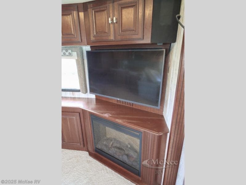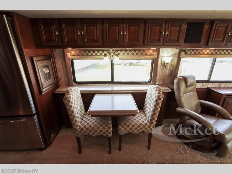The living area is open and inviting with premium seating, a fireplace, and a large HDTV for relaxing evenings. The beautifully appointed kitchen boasts solid-surface countertops, residential stainless-steel refrigerator, convection microwave, and plenty of cabinetry to make meal prep a pleasure.