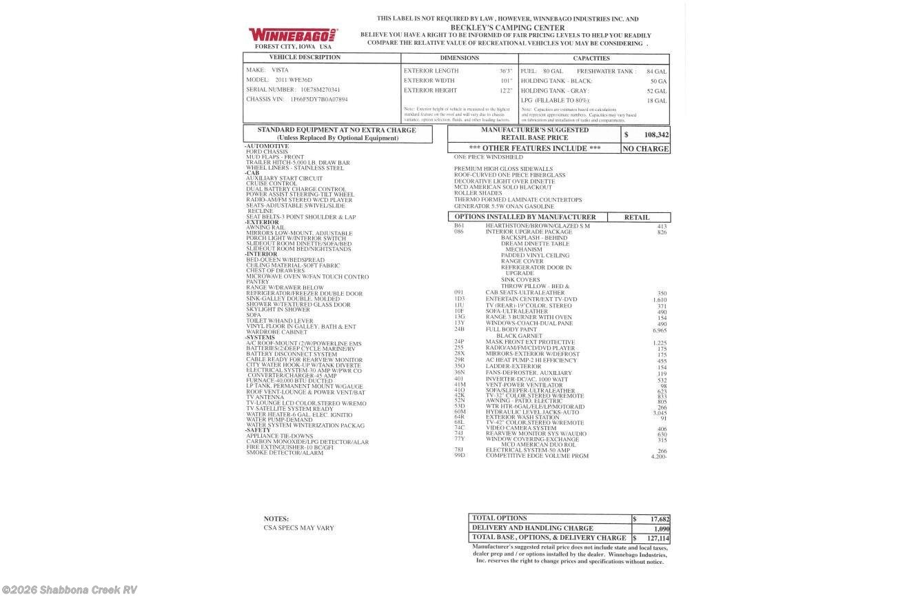 Request More Info on this 2011 Winnebago Vista 36D * Offered for sale by Shabbona Creek RV