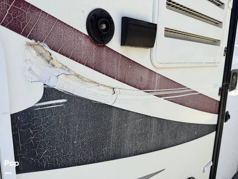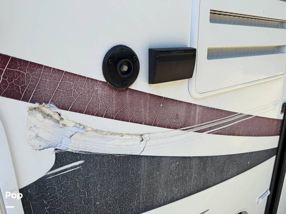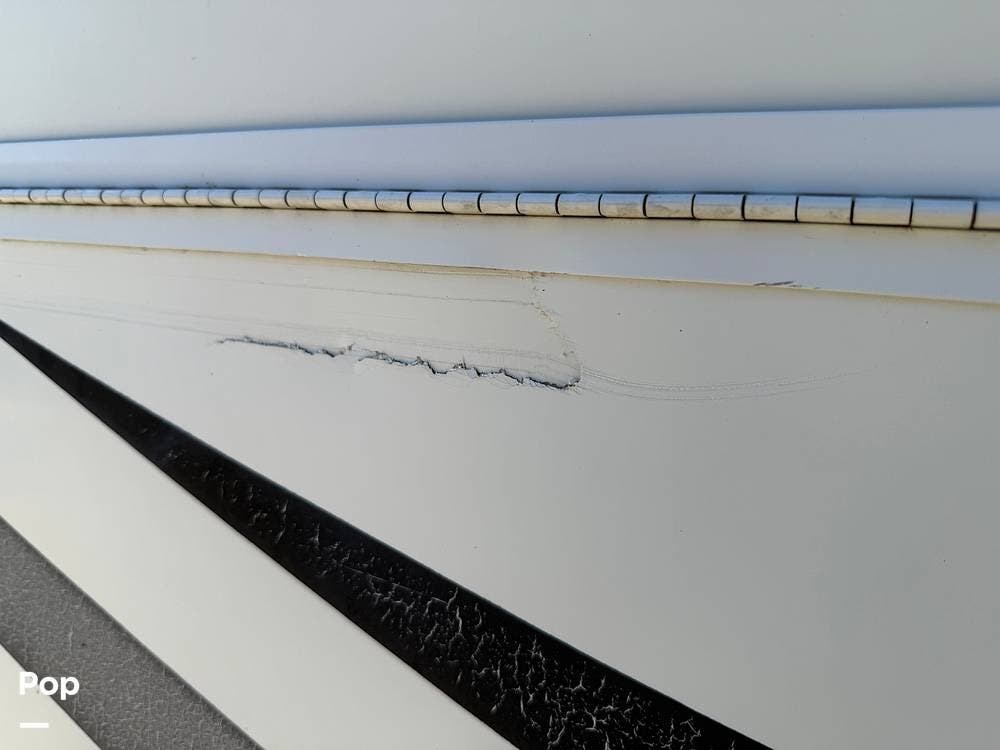 The exterior side panel past the camper door is scarred and damaged on the passenger side.