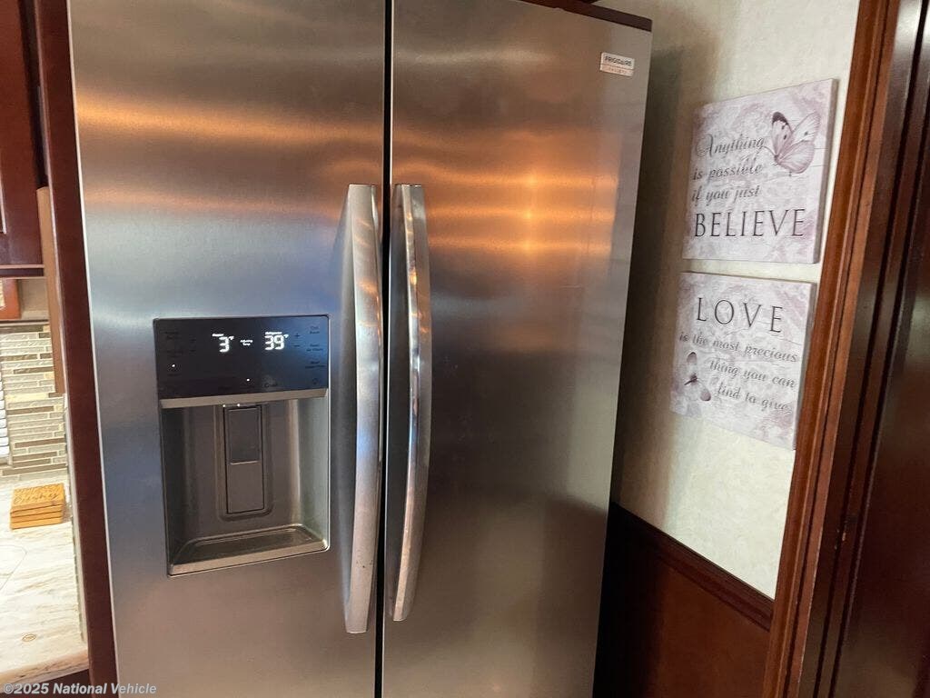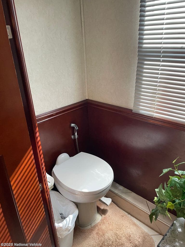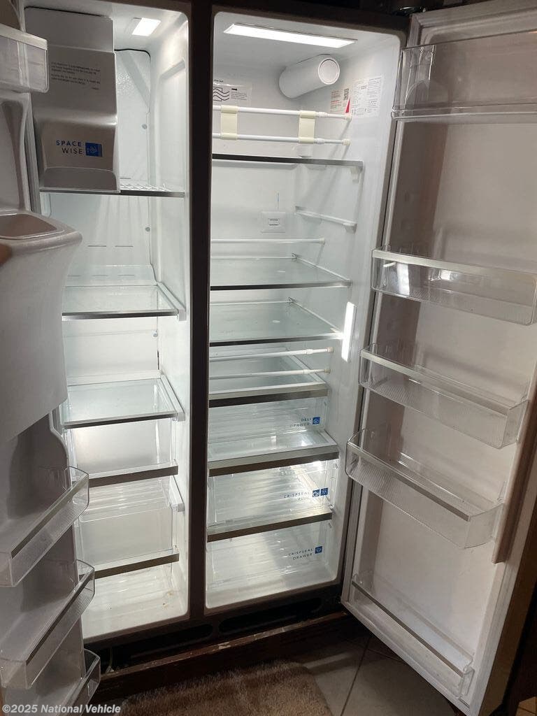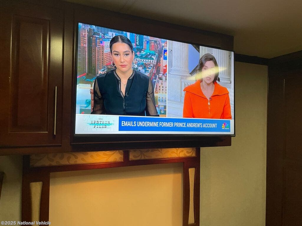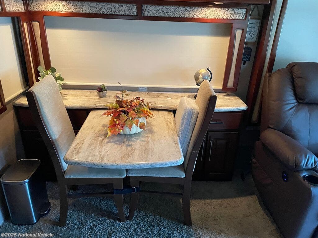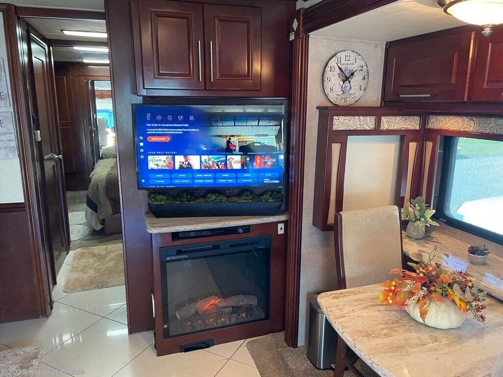 Step inside to a triple-slide floorplan that opens up the interior, creating a bright and inviting living space. The rear master suite features a queen-size bed, wardrobe storage, and direct access to the spacious full bathroom with a residential-style shower and vanity. The main living area includes theater seating, free standing dinette, and entertainment center with flat-screen TV, offering plenty of room to relax and enjoy family time.