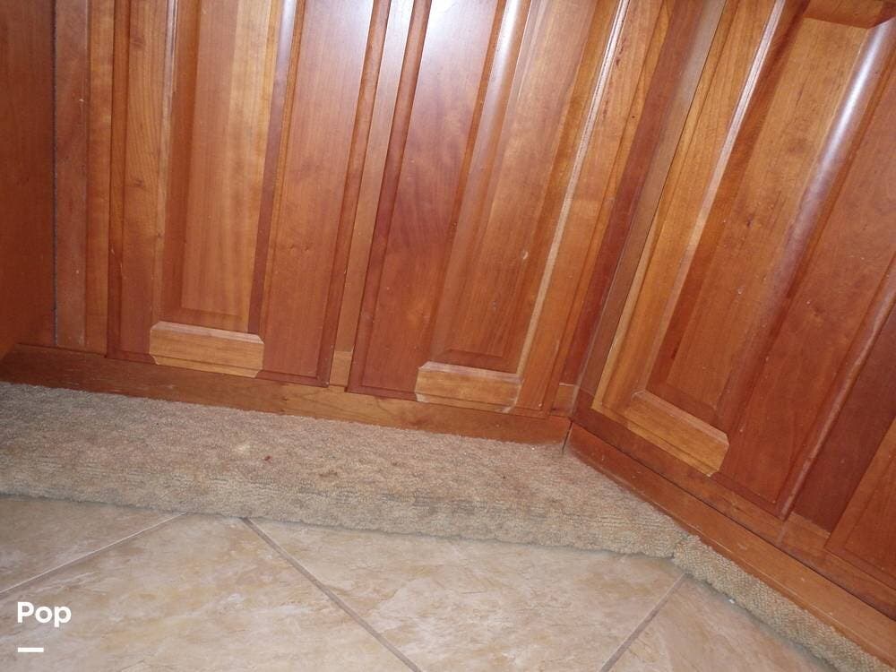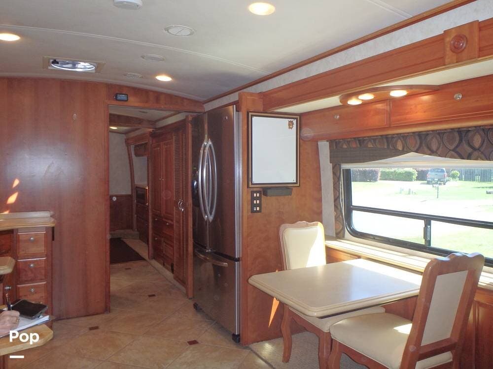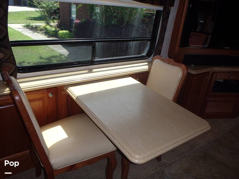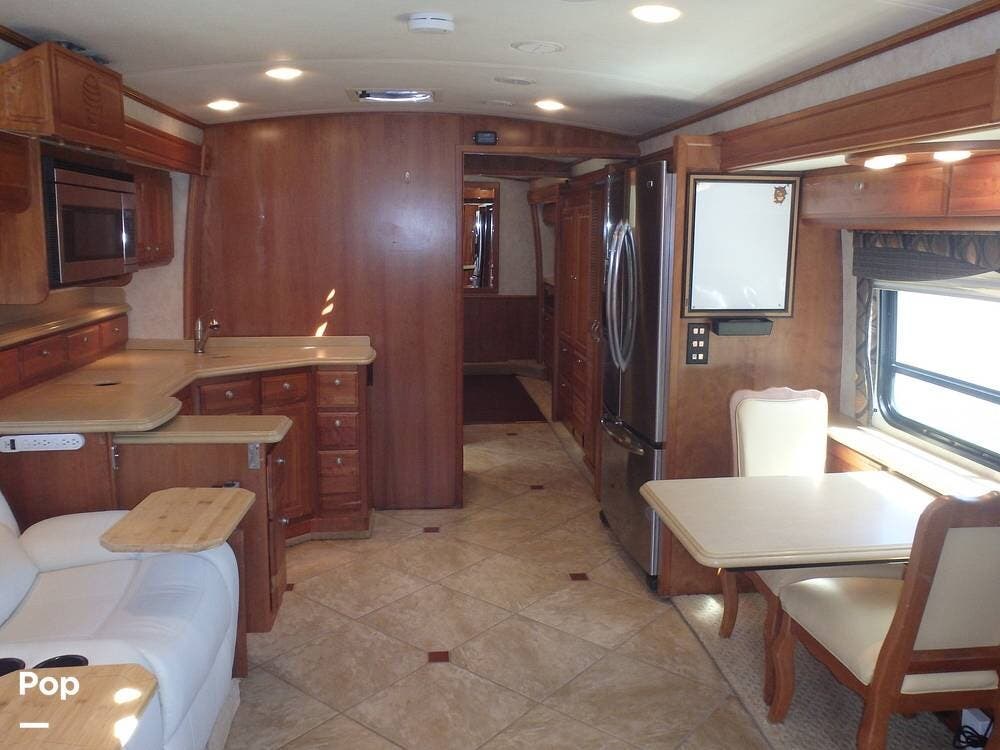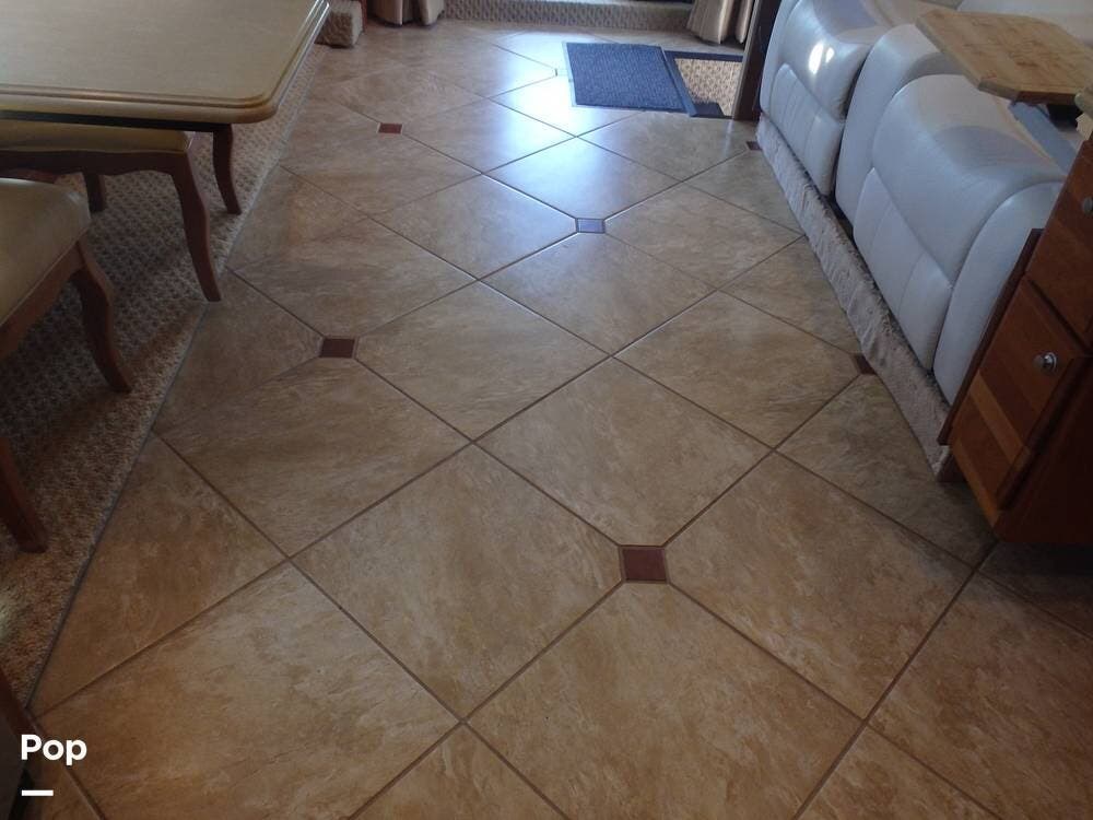 Inside, the layout emphasizes residential comfort with solid hardwood cabinetry, tile flooring in the main living areas, and high-end finishes throughout. The living space includes opposing slide-outs that open the center of the coach, along with recliners, a dinette with an extension and four chairs (two fold-up chairs and an extra table leaf are in the under-bed storage), and a large entertainment center.