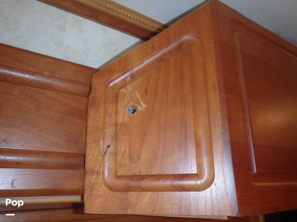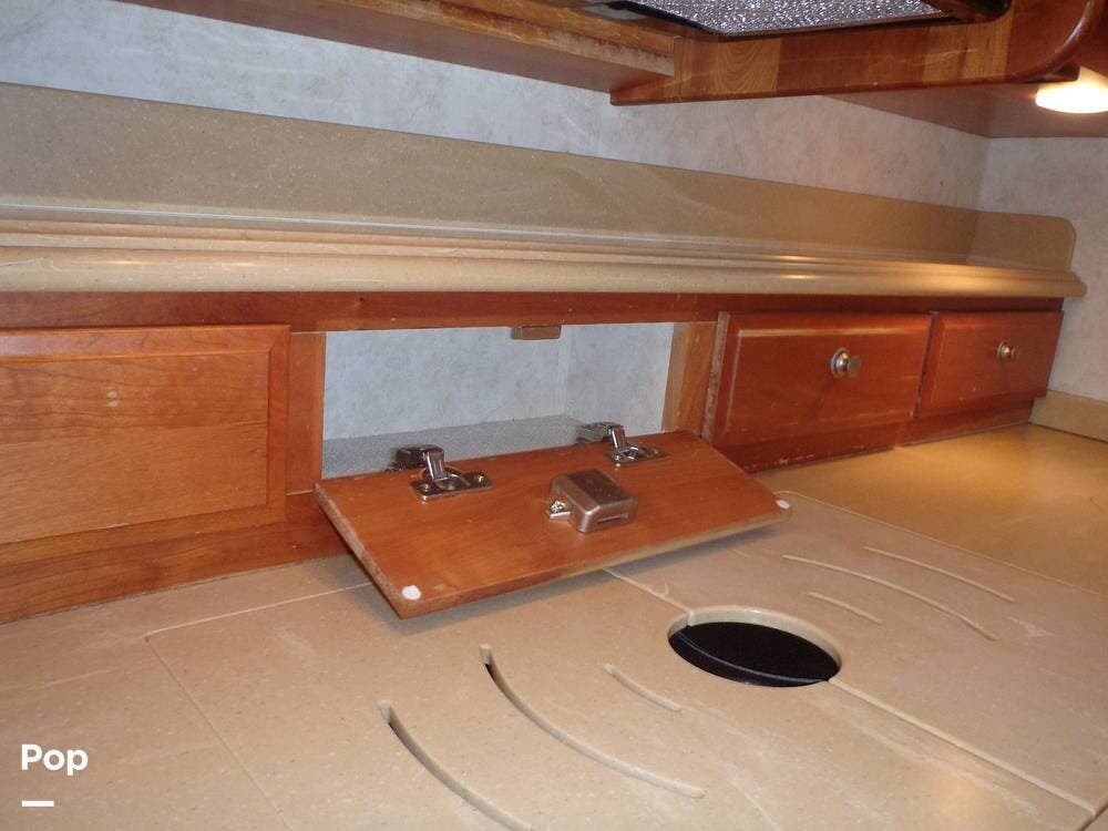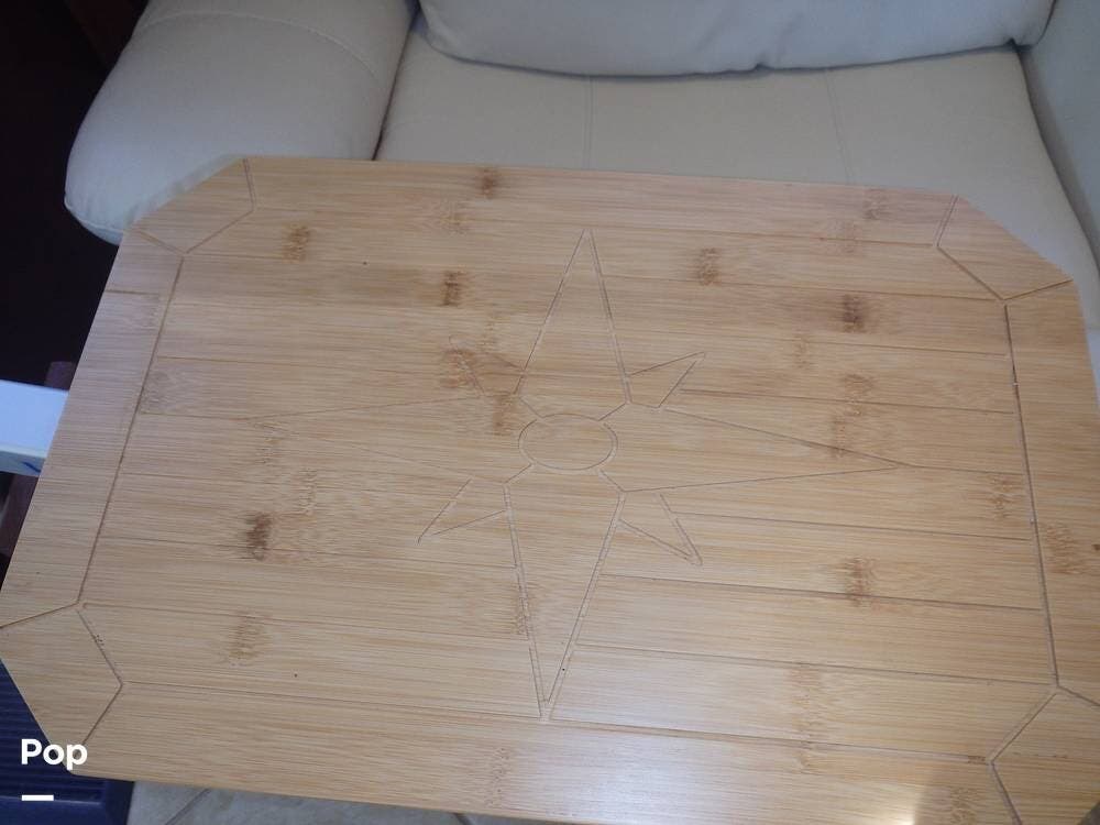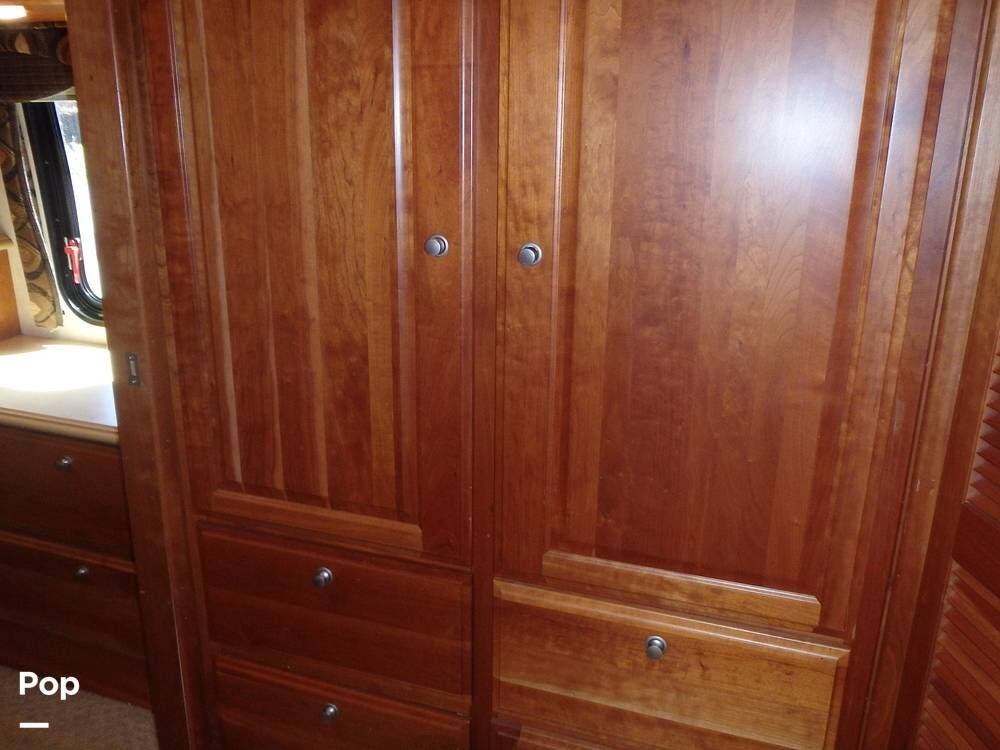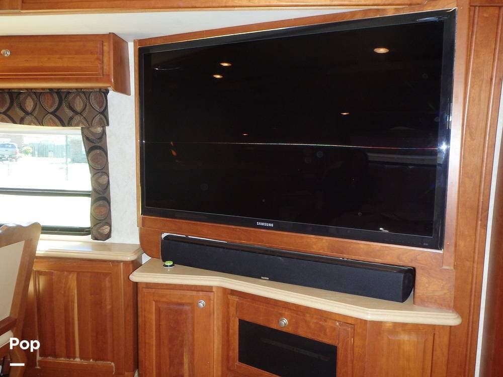 Inside, the layout emphasizes residential comfort with solid hardwood cabinetry, tile flooring in the main living areas, and high-end finishes throughout. The living space includes opposing slide-outs that open the center of the coach, along with recliners, a dinette with an extension and four chairs (two fold-up chairs and an extra table leaf are in the under-bed storage), and a large entertainment center.