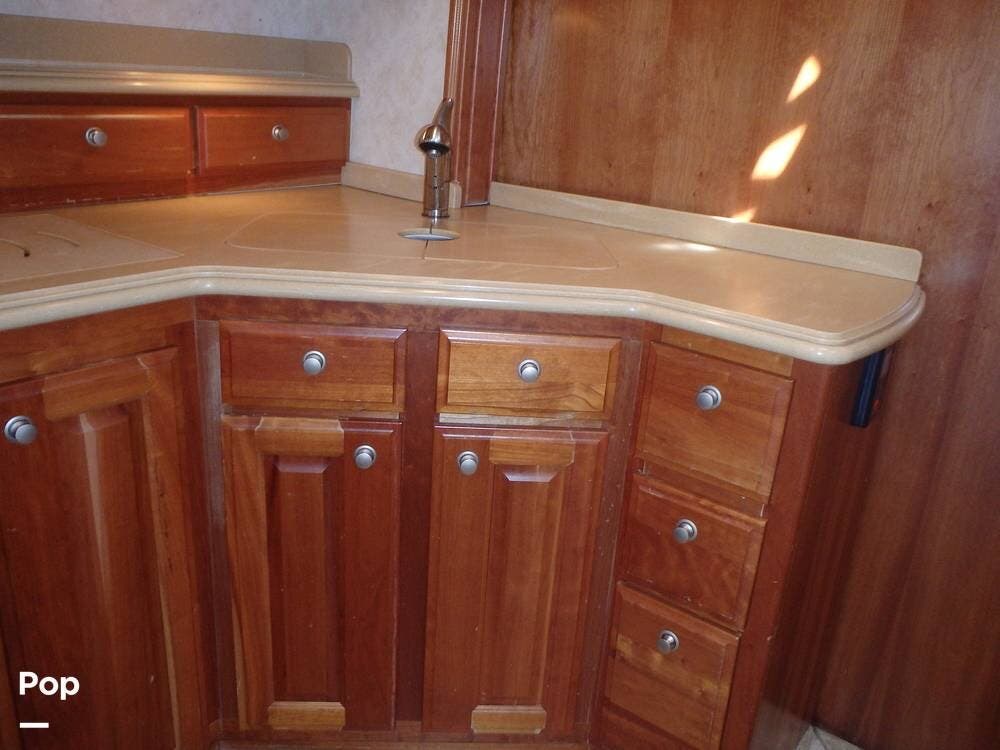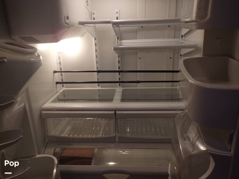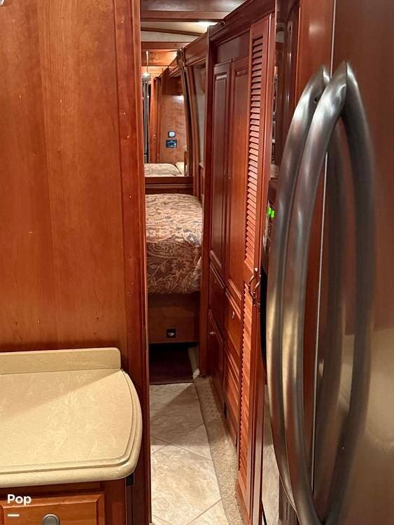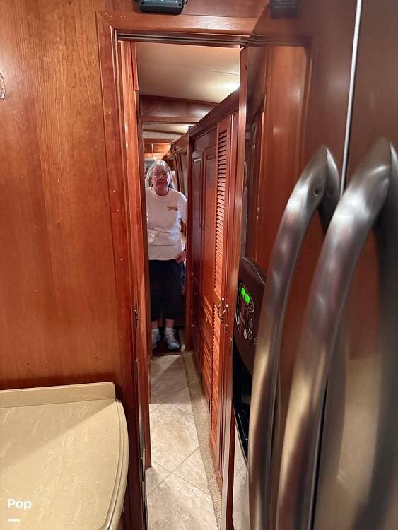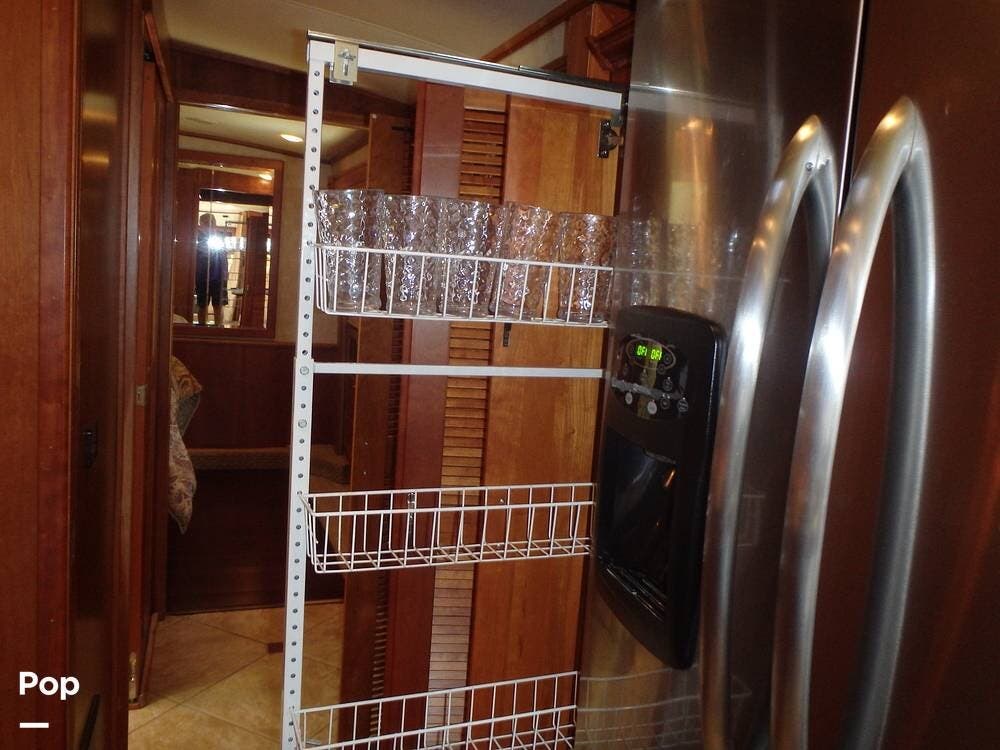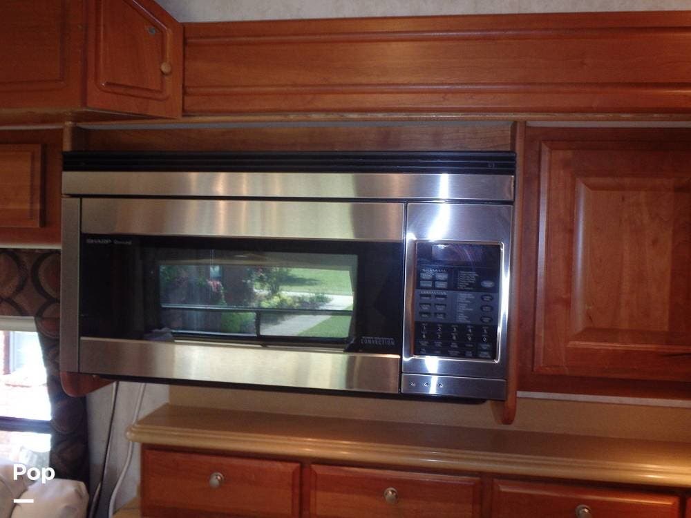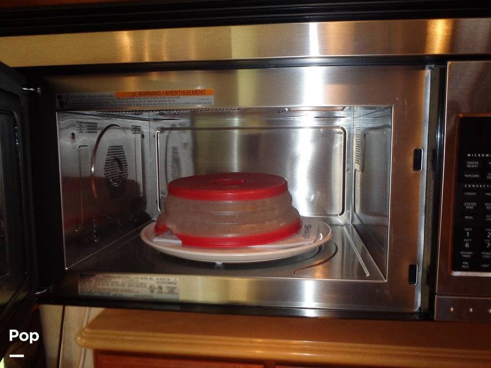 The kitchen is equipped with solid-surface countertops, a residential-style refrigerator, a convection/microwave oven, and ample storage, making it suitable for extended travel or full-time use.