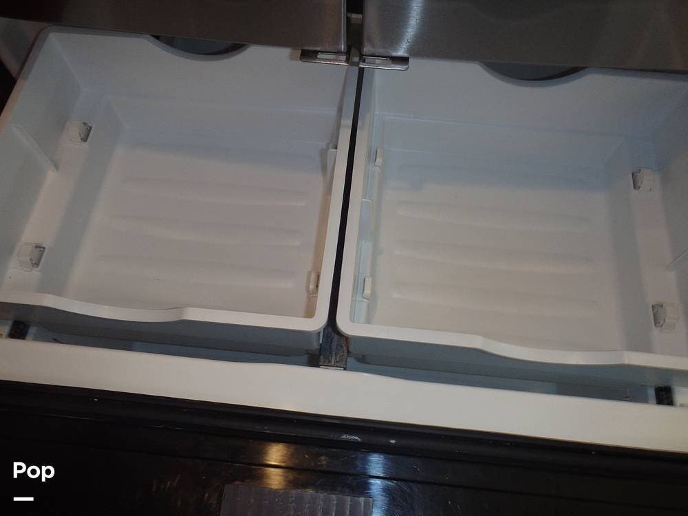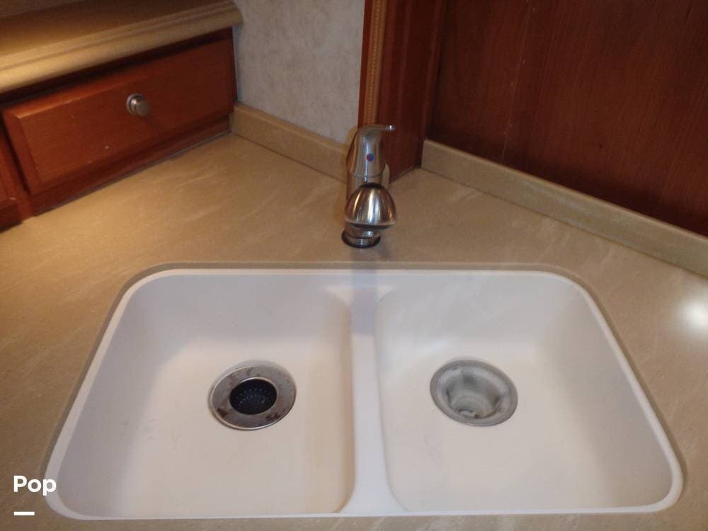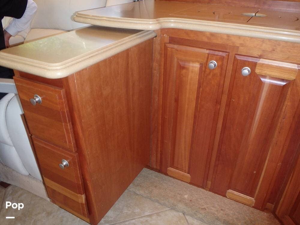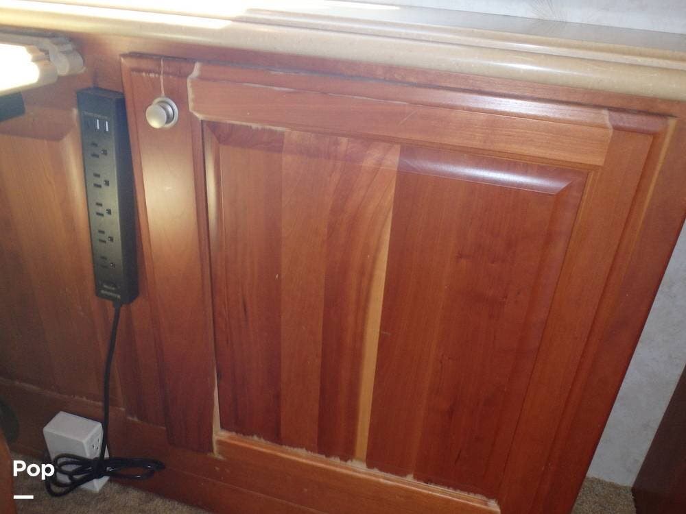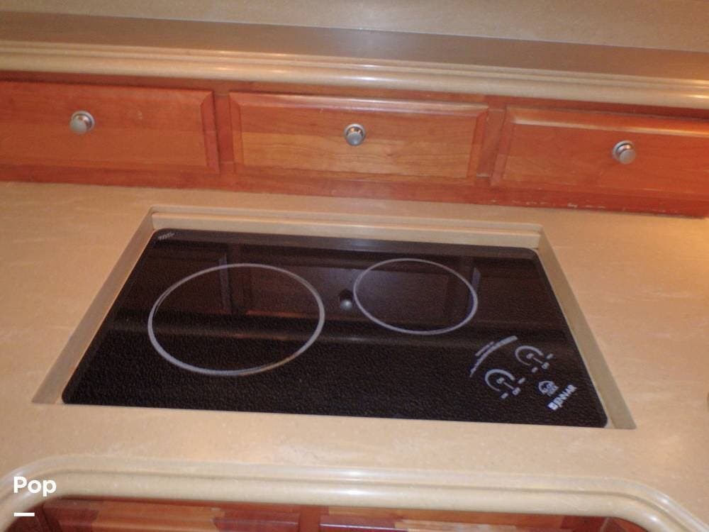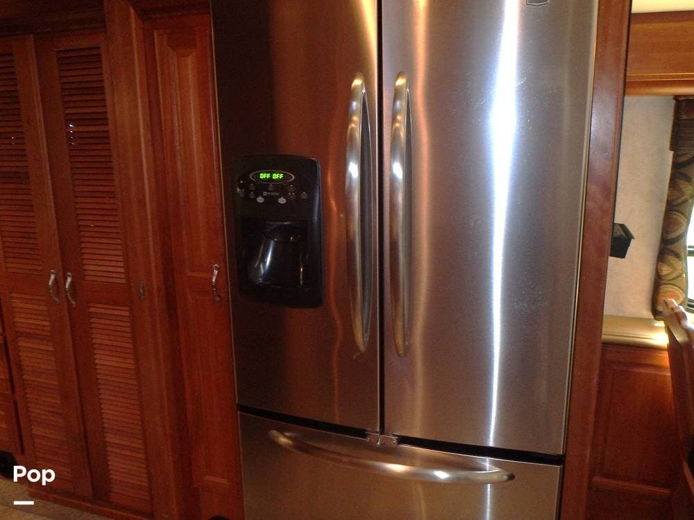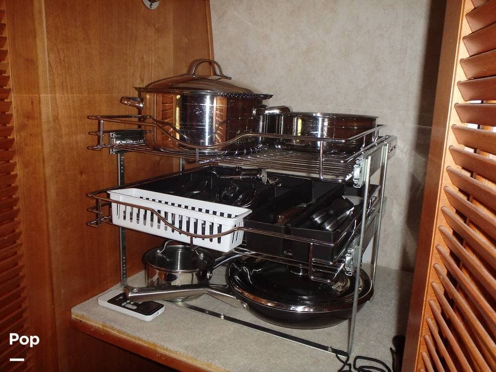The kitchen is equipped with solid-surface countertops, a residential-style refrigerator, a convection/microwave oven, and ample storage, making it suitable for extended travel or full-time use.