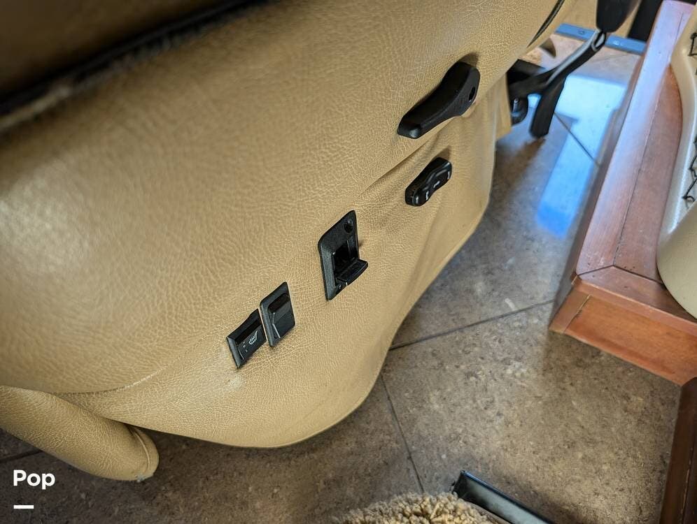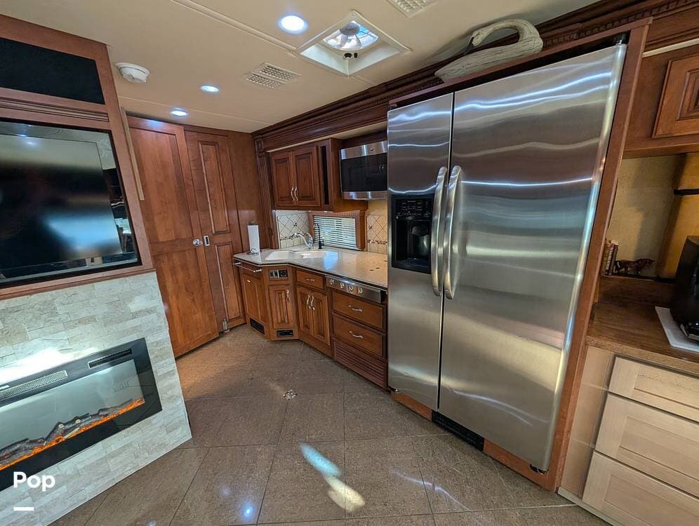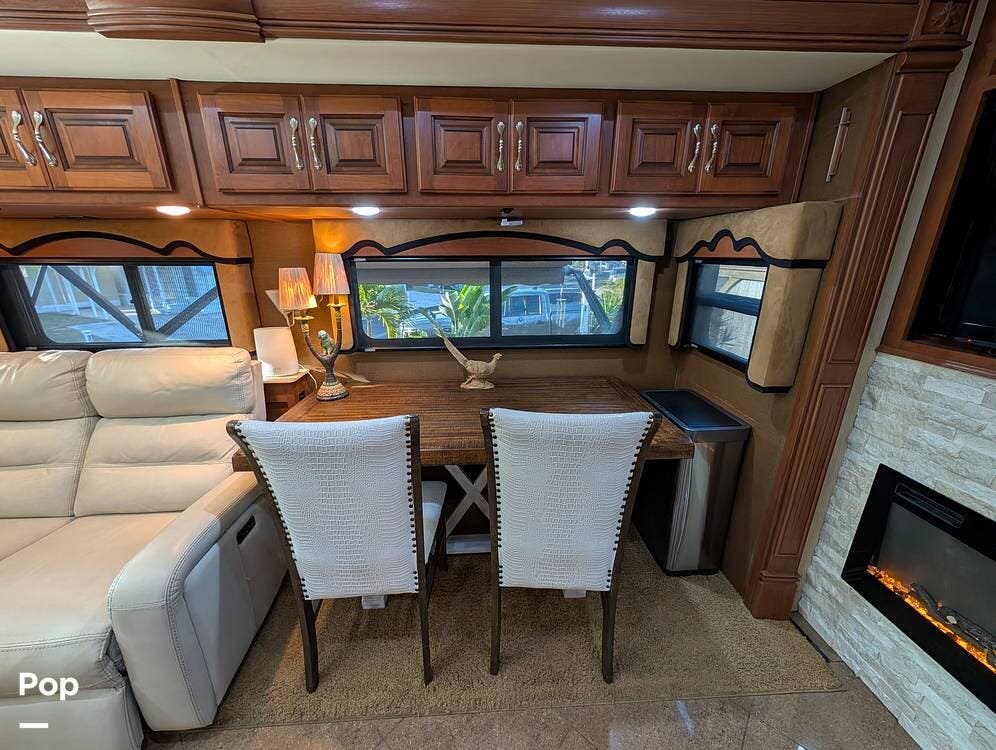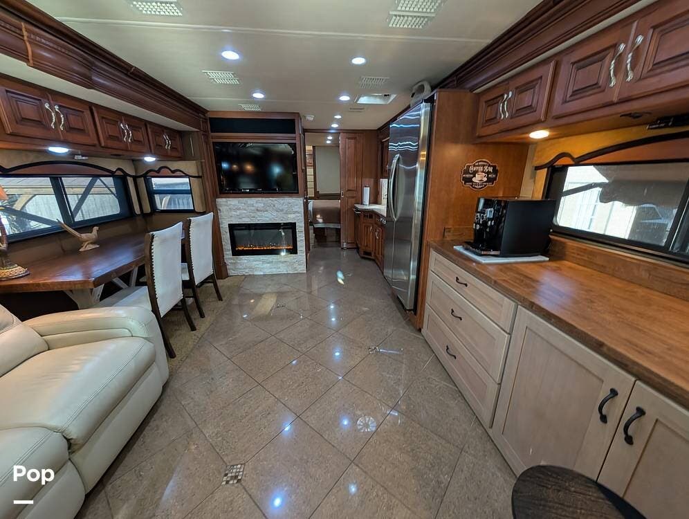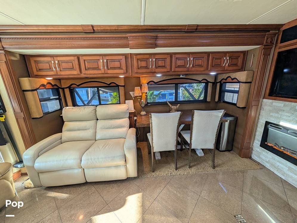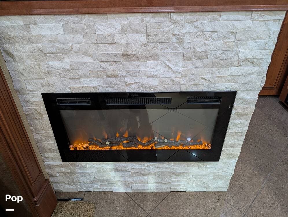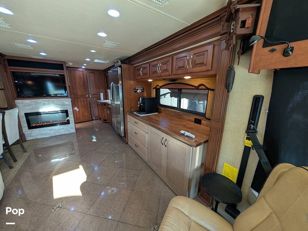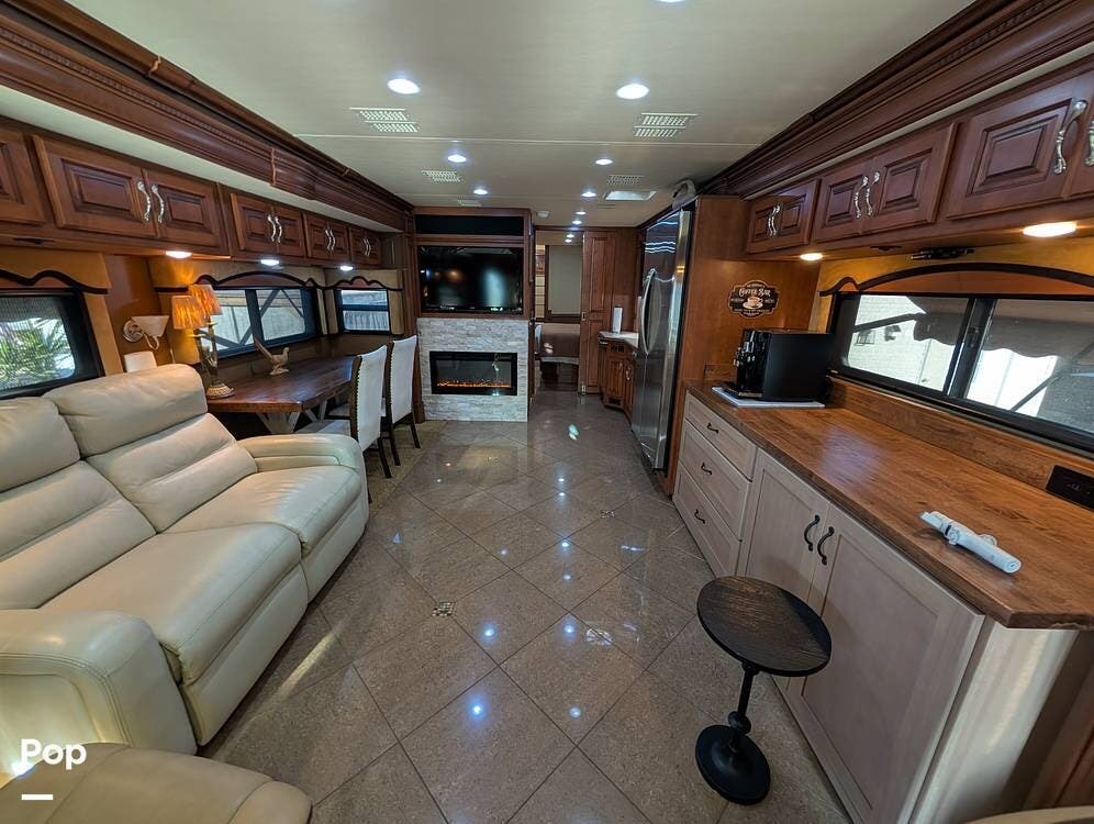 The main living area blends style and practicality with a fireplace accented by custom stonework, a residential refrigerator and freezer, and a convection microwave. Elegant porcelain tile flooring with decorative inlays adds a refined touch throughout the coach. A water softener and multi-stage filtration system ensure consistently high water quality. Up front, the swiveling captain's chairs remain in excellent condition with no peeling or wear, reflecting careful ownership.