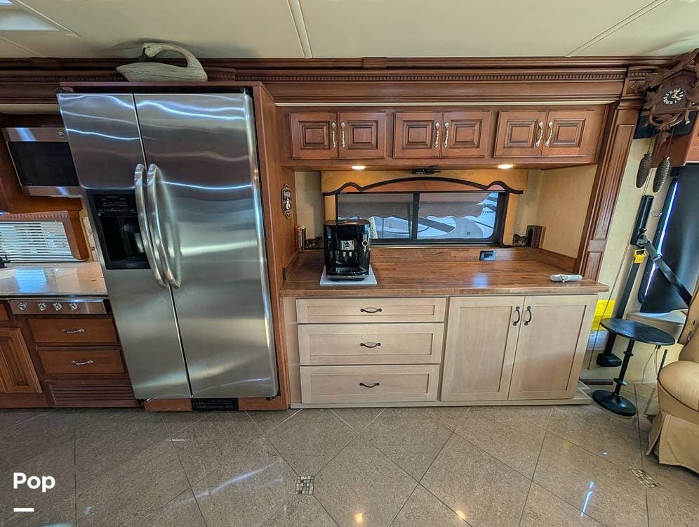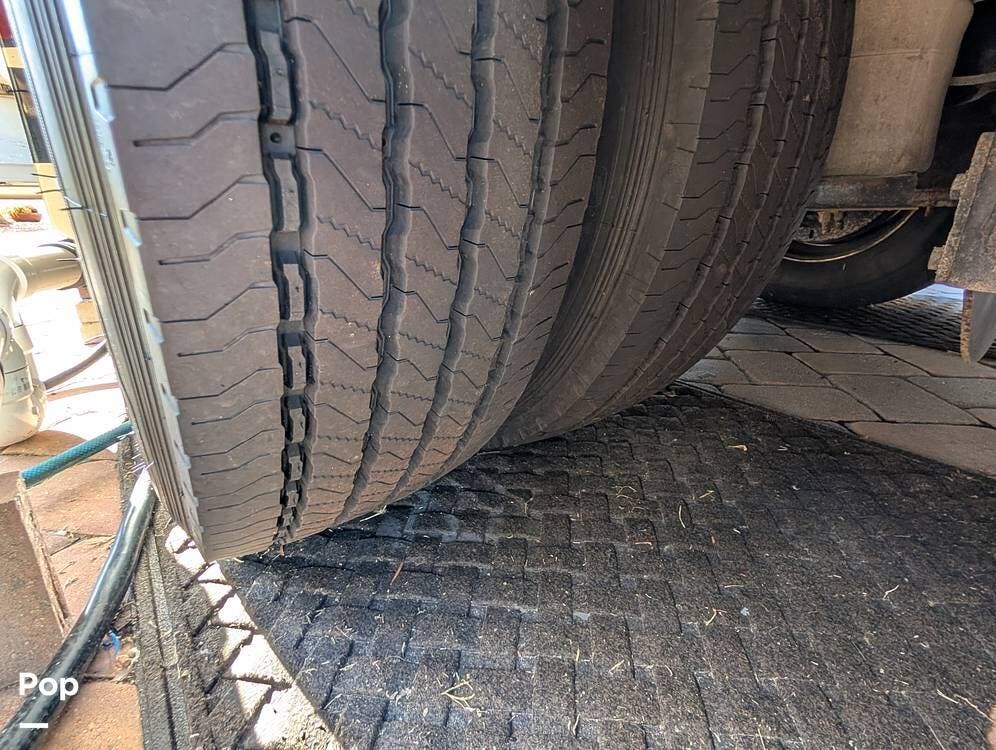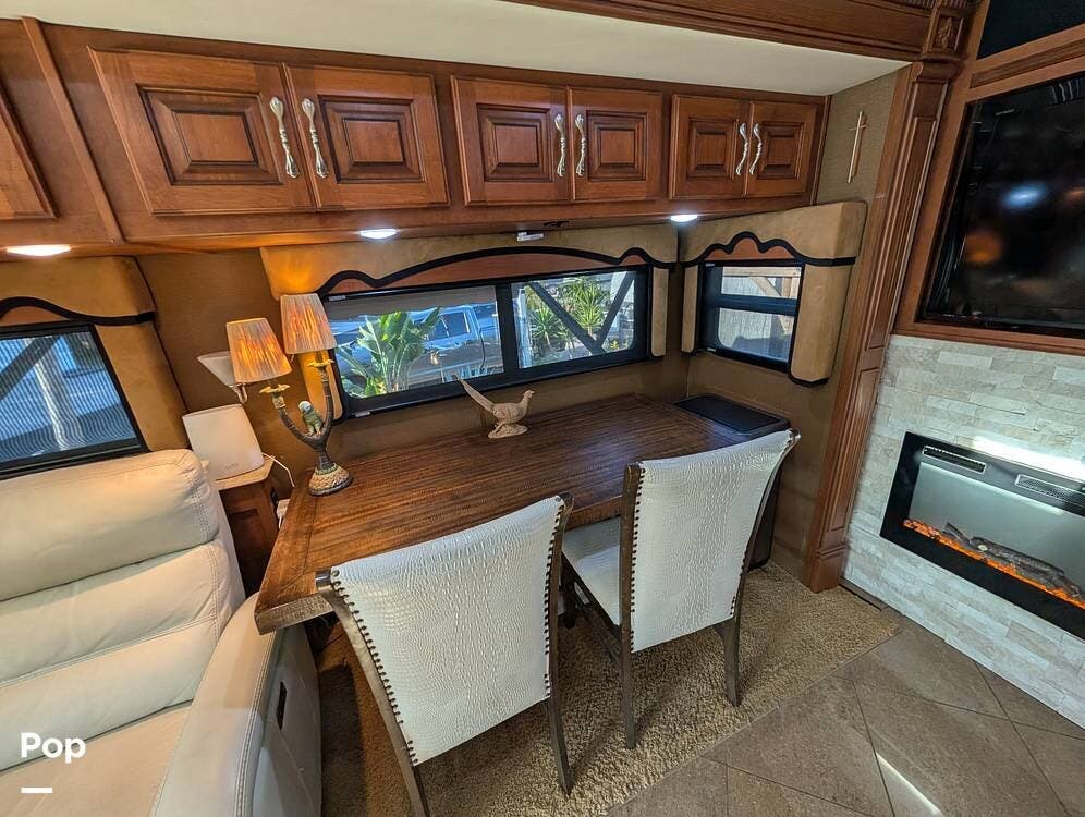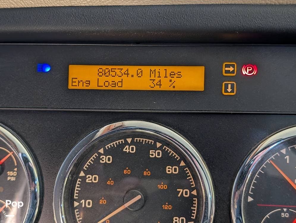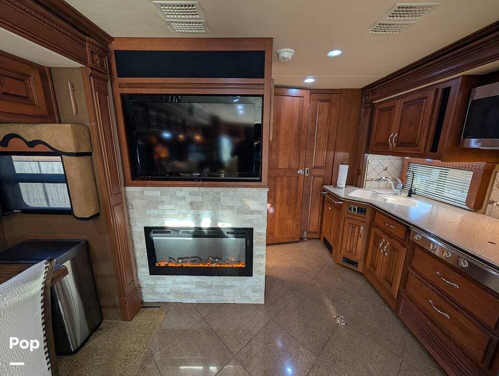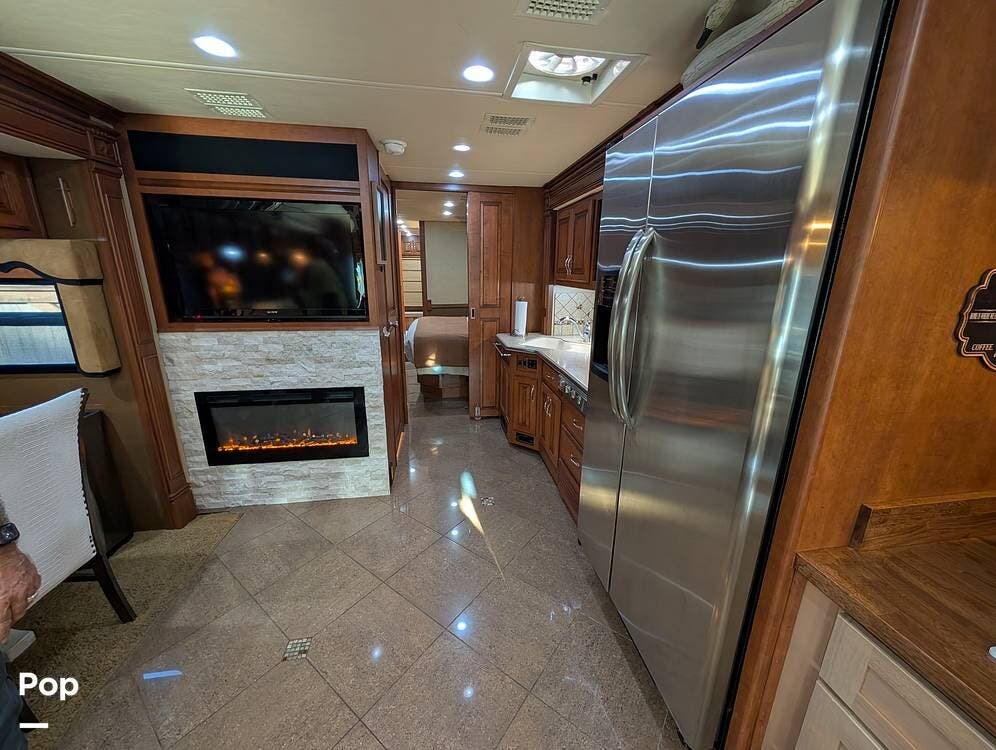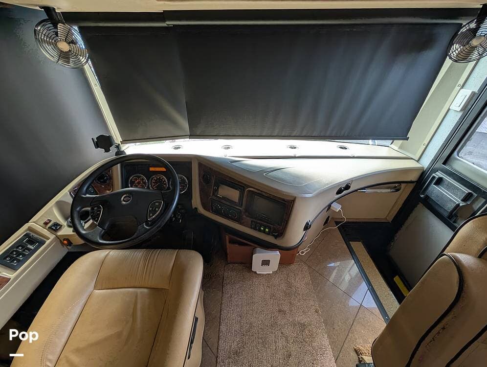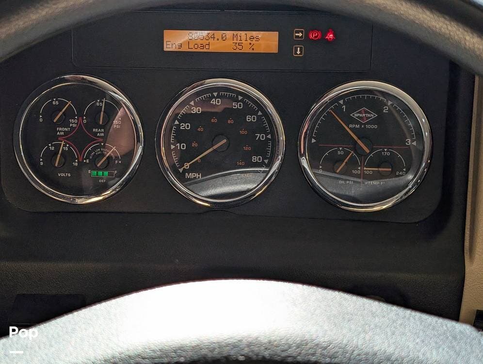 The main living area blends style and practicality with a fireplace accented by custom stonework, a residential refrigerator and freezer, and a convection microwave. Elegant porcelain tile flooring with decorative inlays adds a refined touch throughout the coach. A water softener and multi-stage filtration system ensure consistently high water quality. Up front, the swiveling captain's chairs remain in excellent condition with no peeling or wear, reflecting careful ownership.