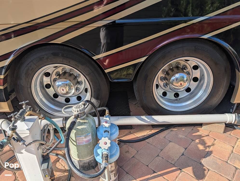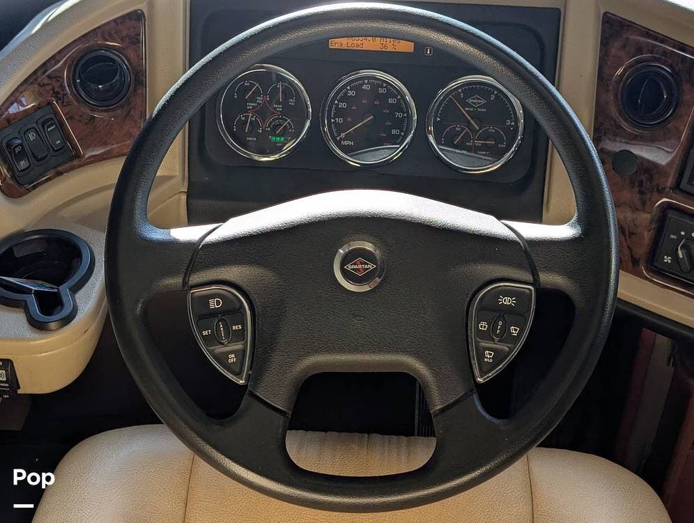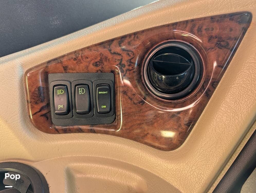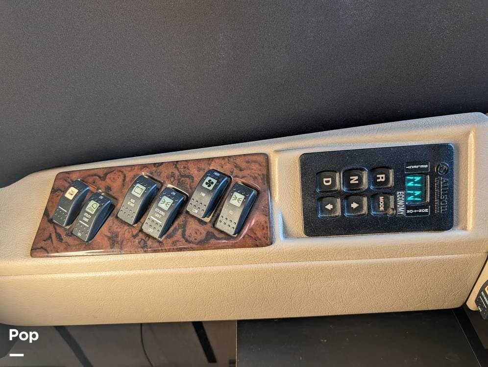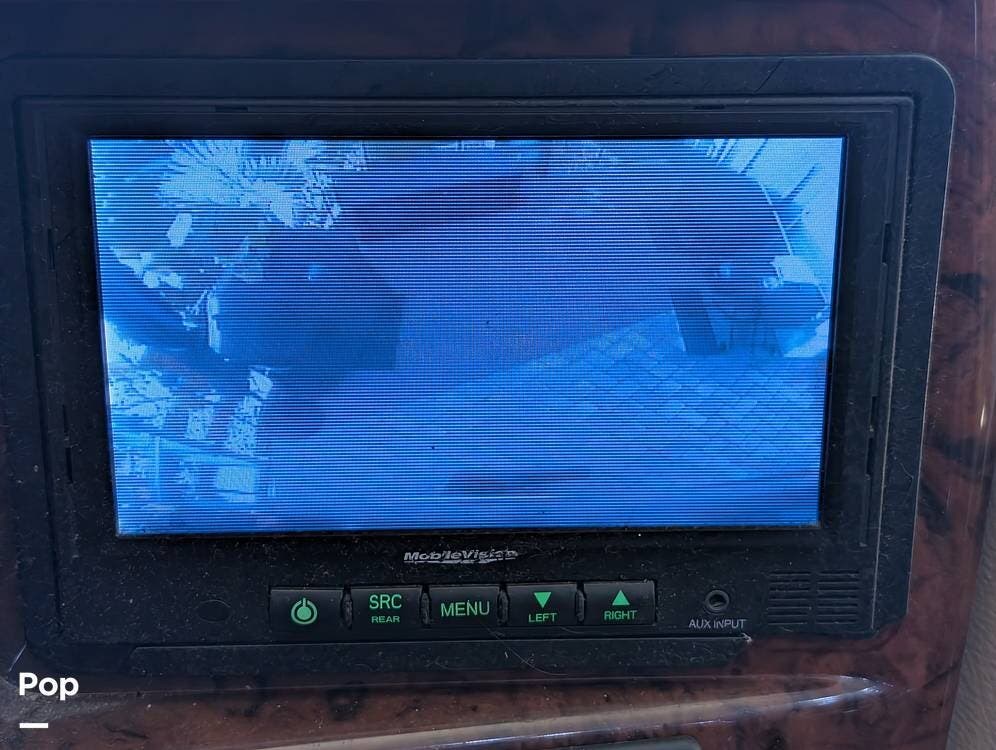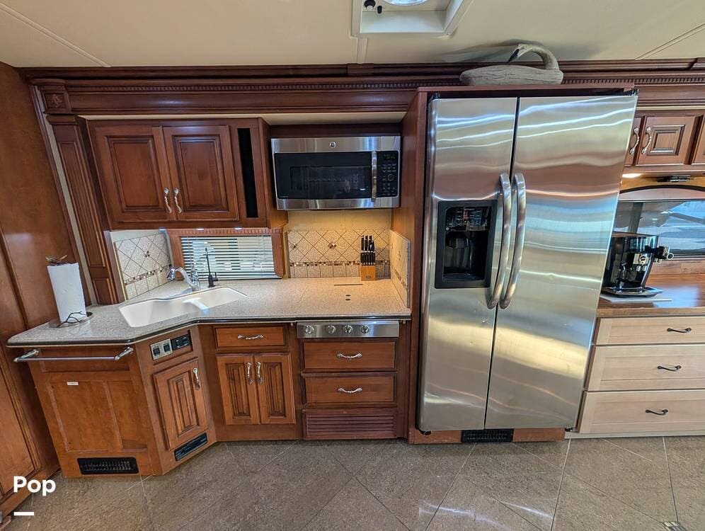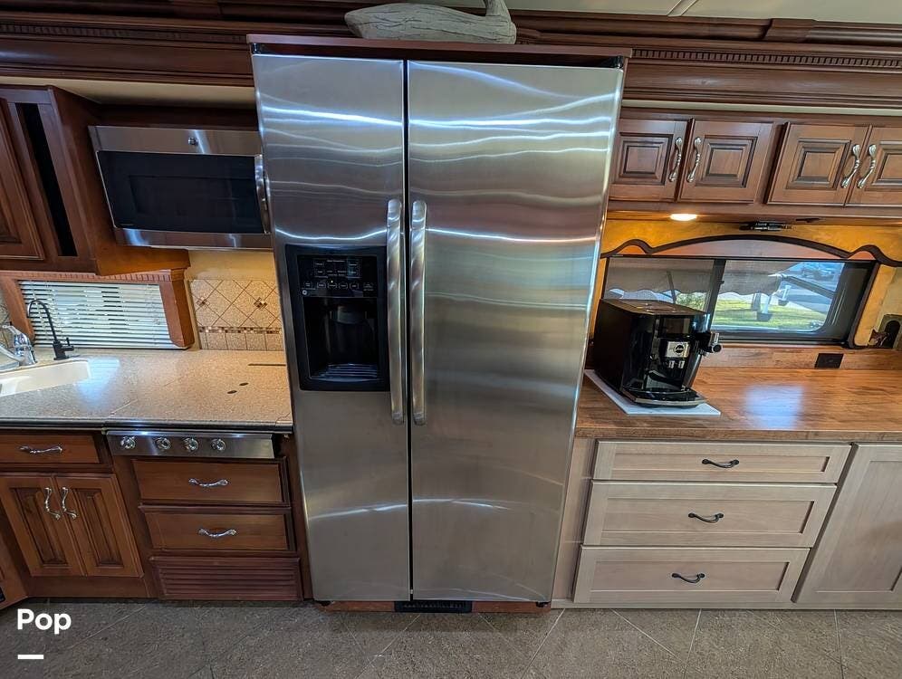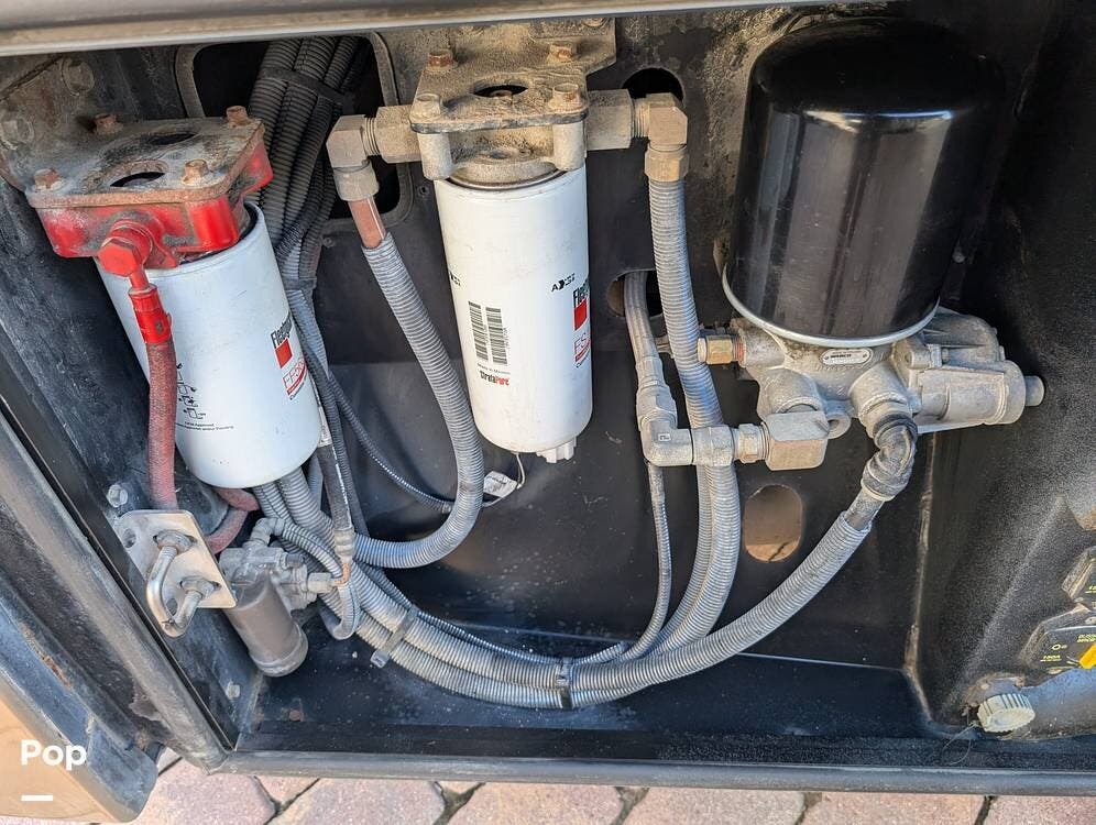 The main living area blends style and practicality with a fireplace accented by custom stonework, a residential refrigerator and freezer, and a convection microwave. Elegant porcelain tile flooring with decorative inlays adds a refined touch throughout the coach. A water softener and multi-stage filtration system ensure consistently high water quality. Up front, the swiveling captain's chairs remain in excellent condition with no peeling or wear, reflecting careful ownership.