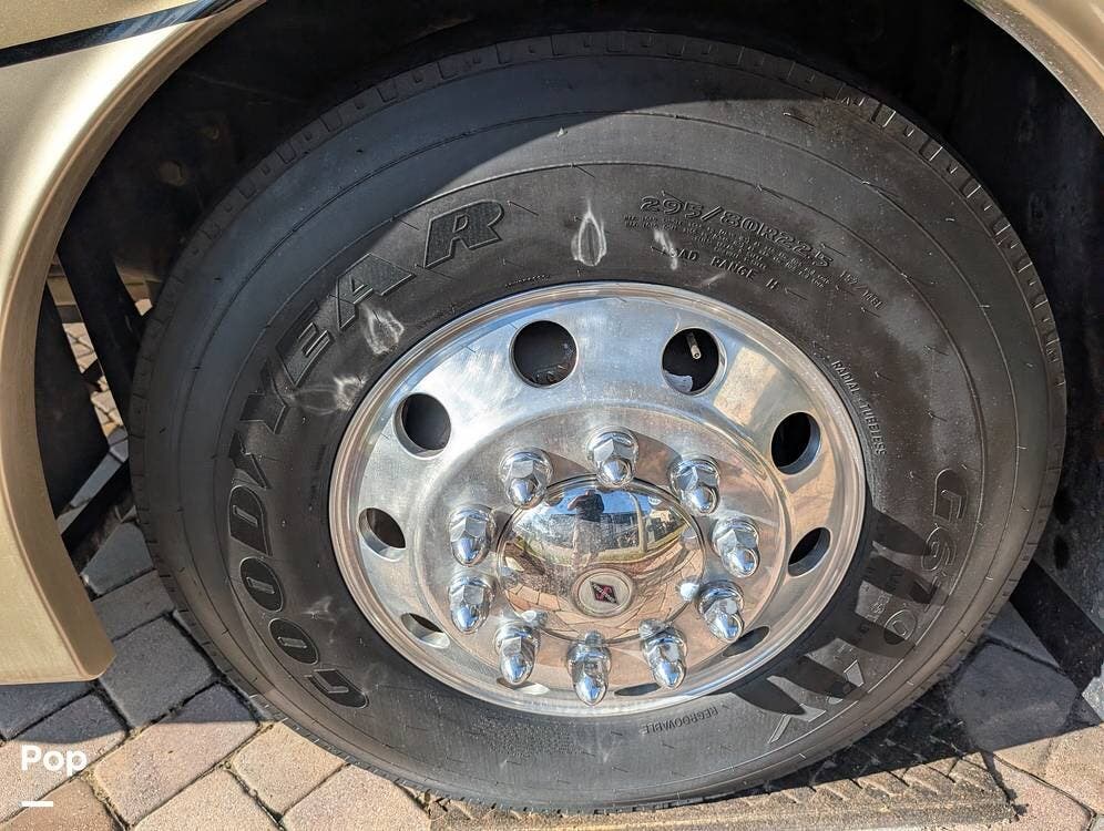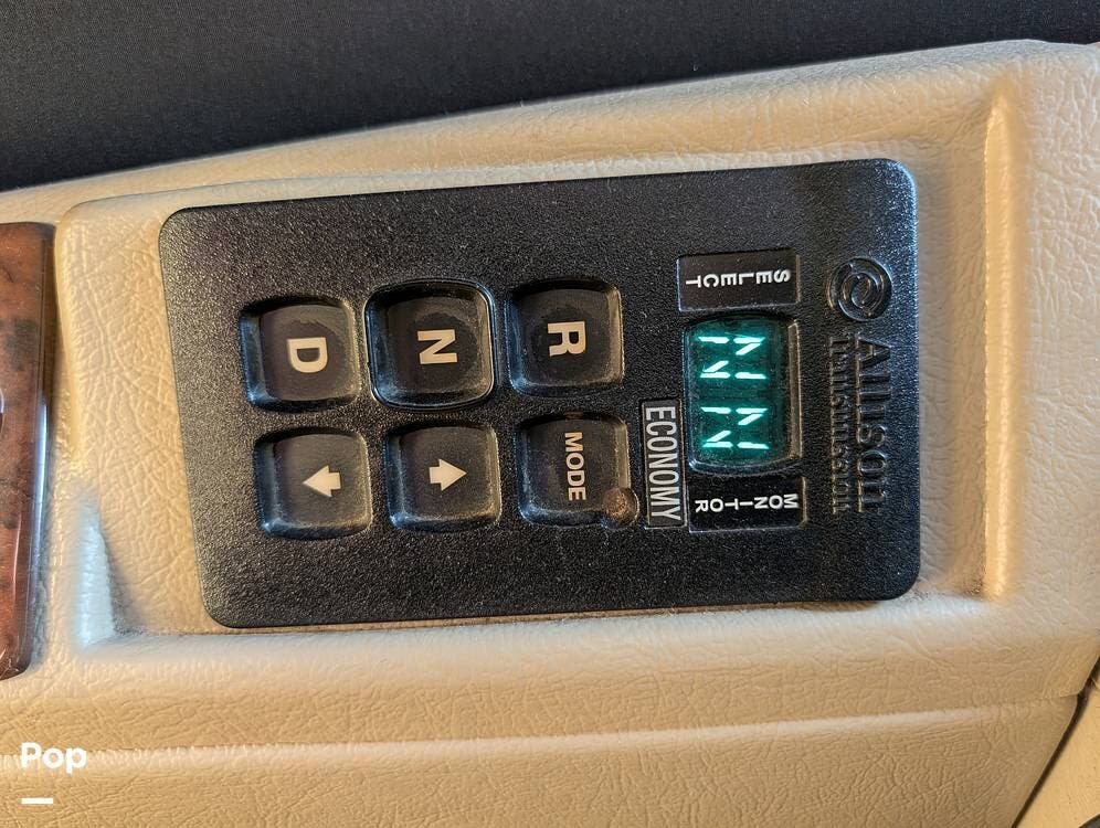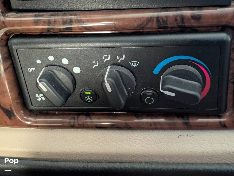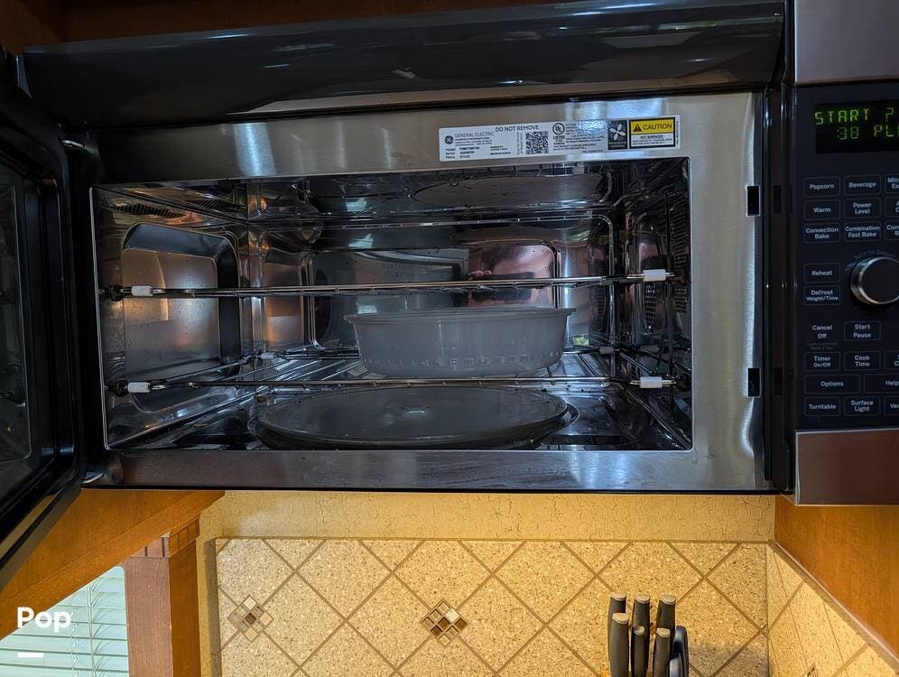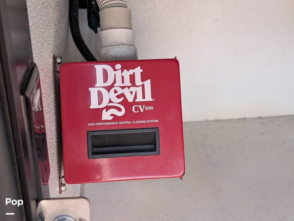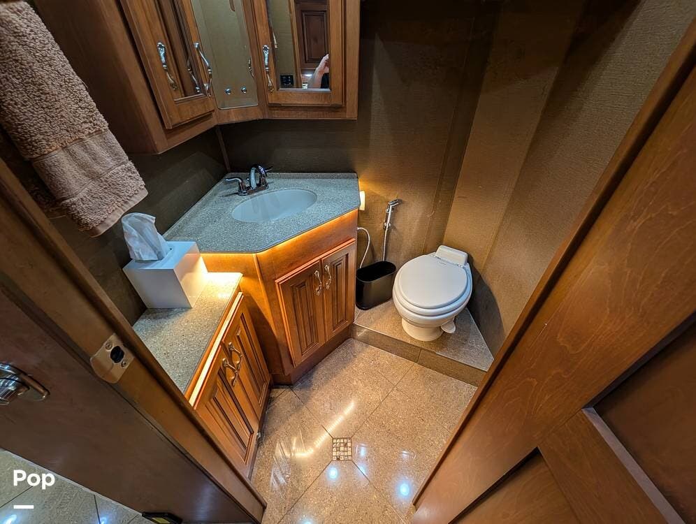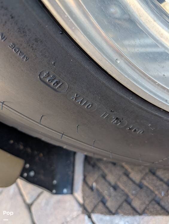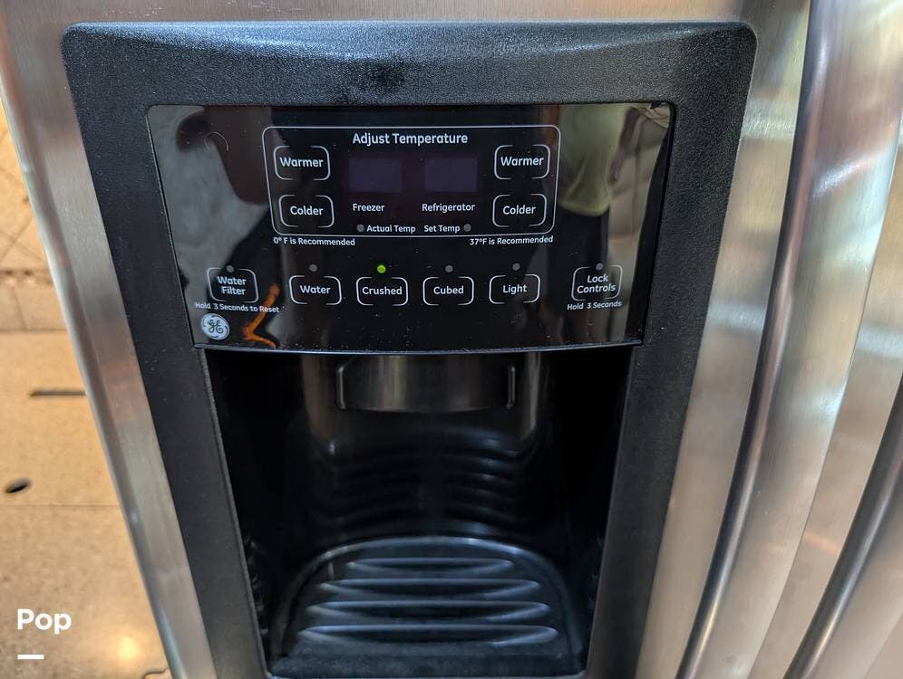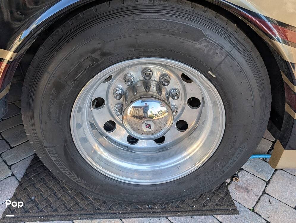 The main living area blends style and practicality with a fireplace accented by custom stonework, a residential refrigerator and freezer, and a convection microwave. Elegant porcelain tile flooring with decorative inlays adds a refined touch throughout the coach. A water softener and multi-stage filtration system ensure consistently high water quality. Up front, the swiveling captain's chairs remain in excellent condition with no peeling or wear, reflecting careful ownership.
