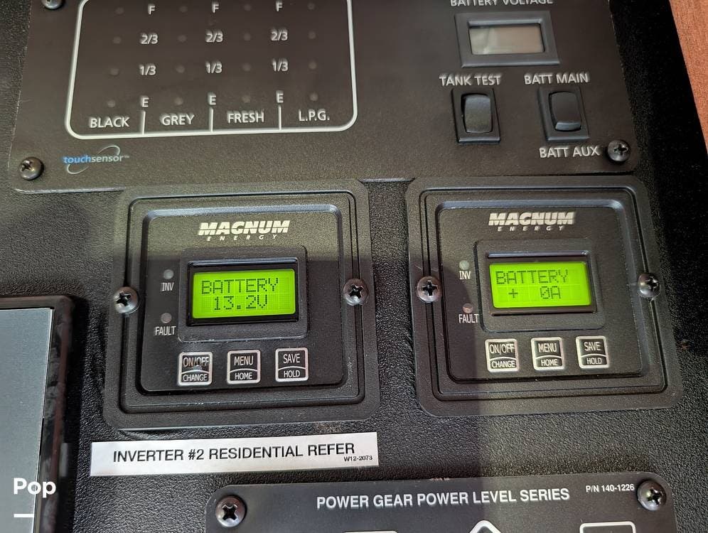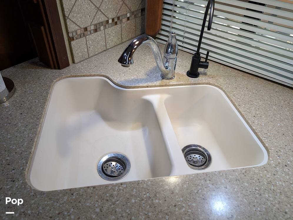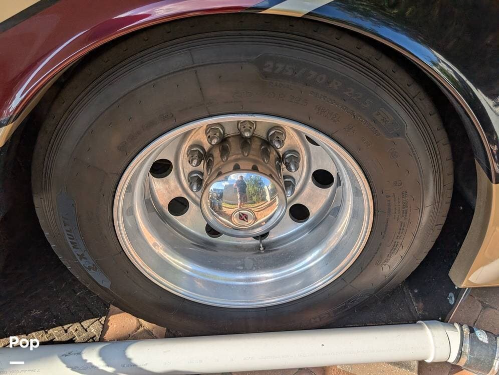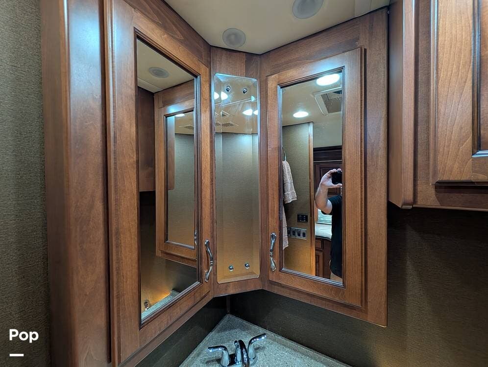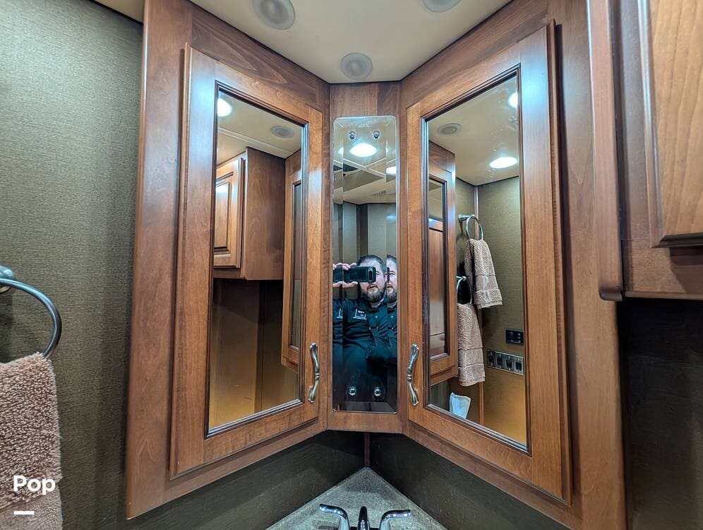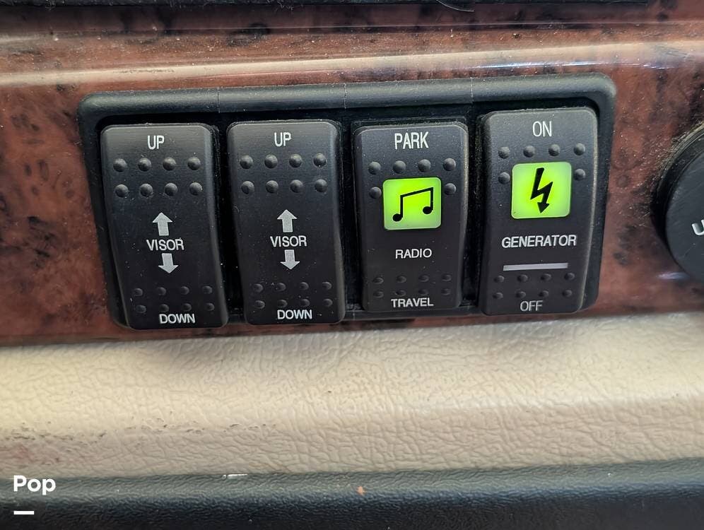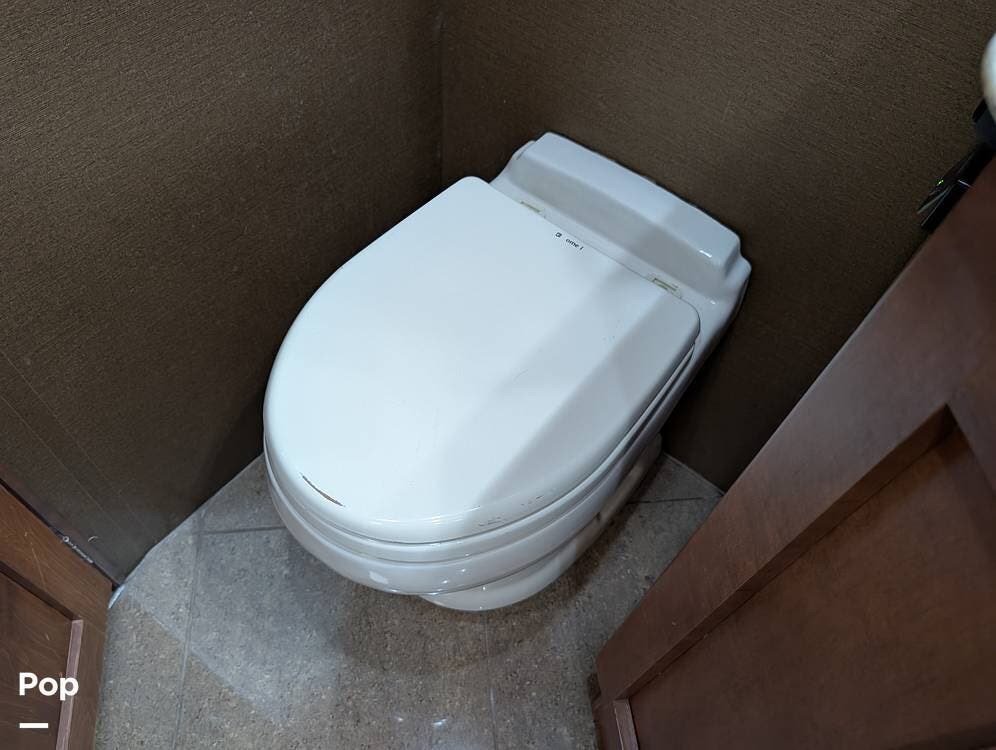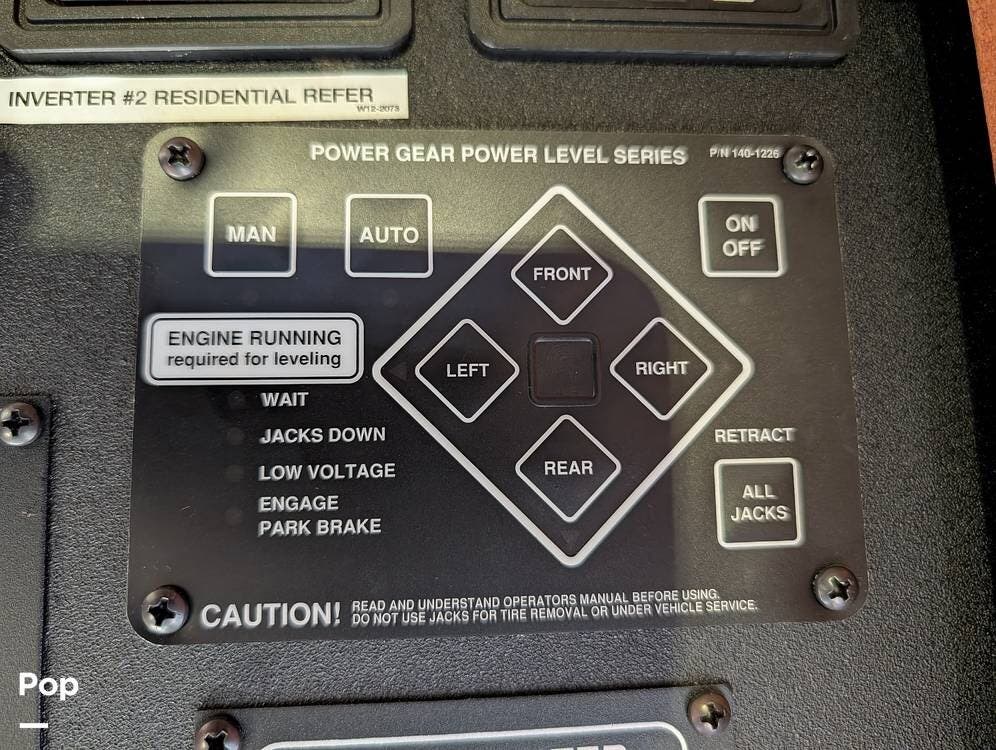 The main living area blends style and practicality with a fireplace accented by custom stonework, a residential refrigerator and freezer, and a convection microwave. Elegant porcelain tile flooring with decorative inlays adds a refined touch throughout the coach. A water softener and multi-stage filtration system ensure consistently high water quality. Up front, the swiveling captain's chairs remain in excellent condition with no peeling or wear, reflecting careful ownership.