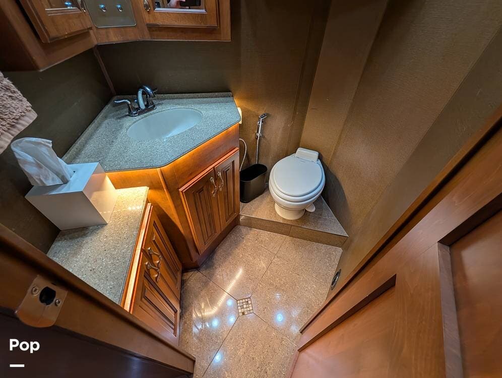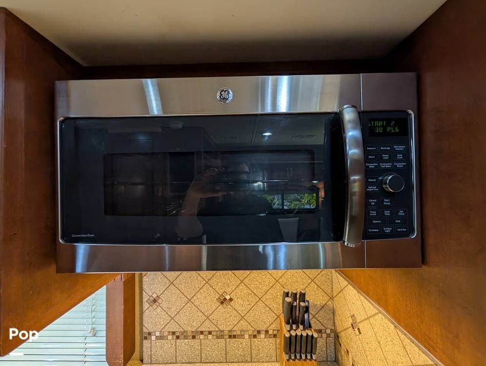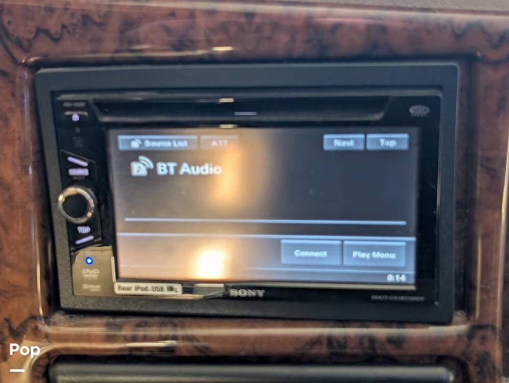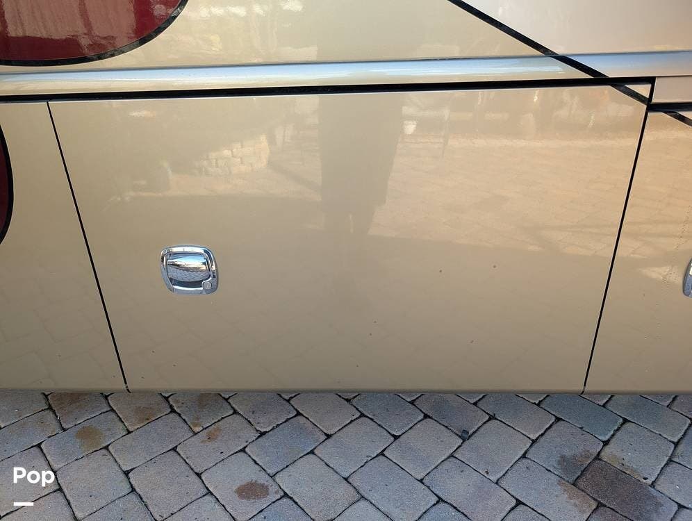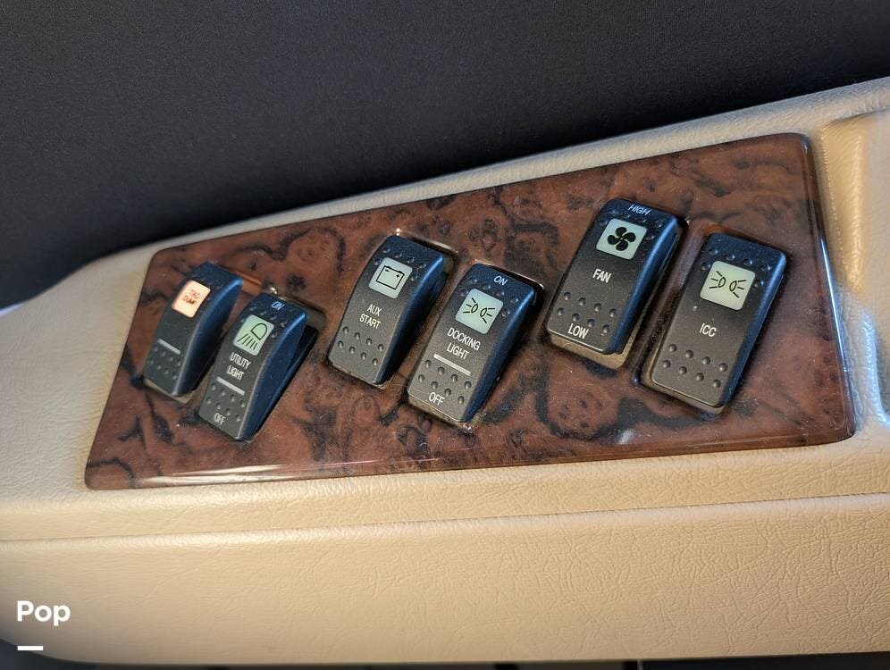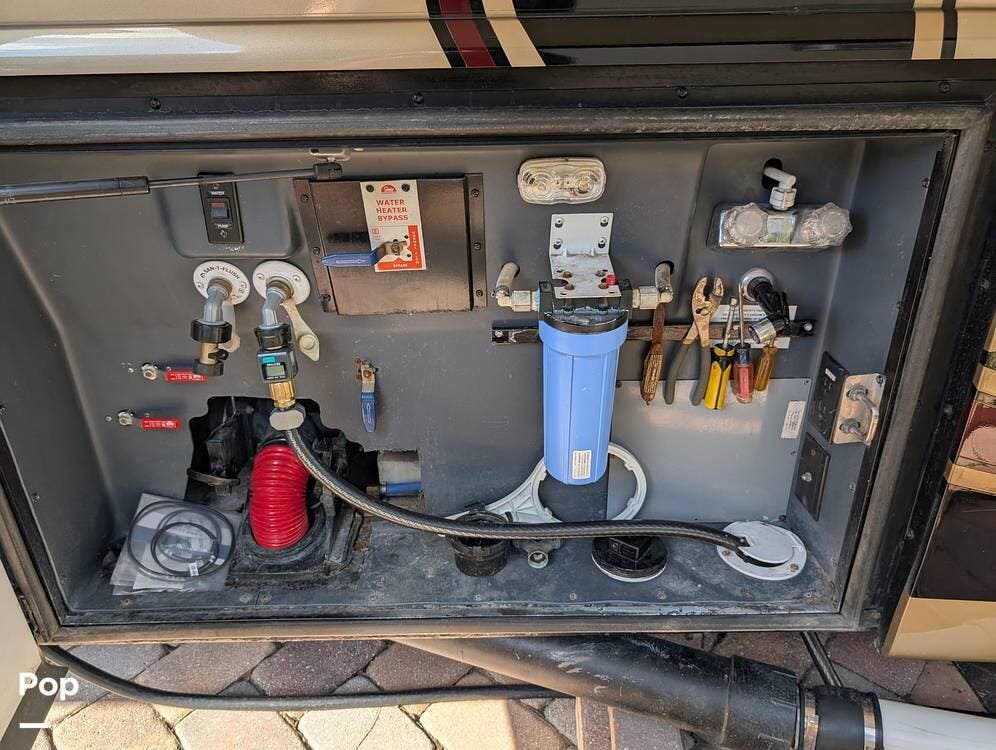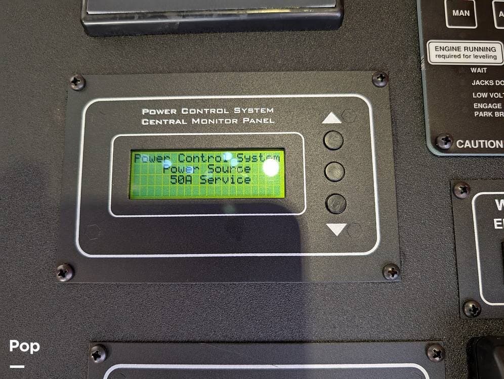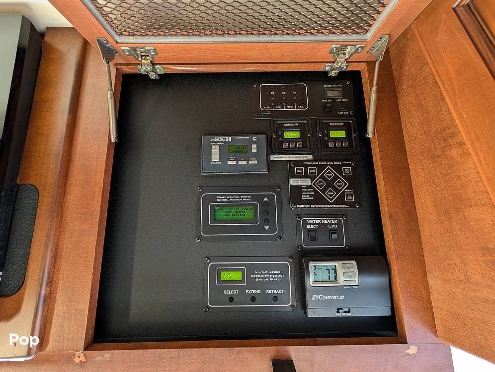 The main living area blends style and practicality with a fireplace accented by custom stonework, a residential refrigerator and freezer, and a convection microwave. Elegant porcelain tile flooring with decorative inlays adds a refined touch throughout the coach. A water softener and multi-stage filtration system ensure consistently high water quality. Up front, the swiveling captain's chairs remain in excellent condition with no peeling or wear, reflecting careful ownership.
