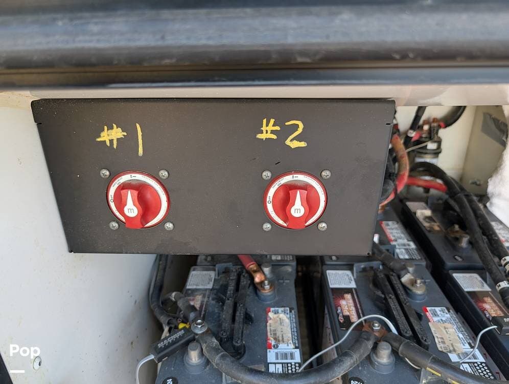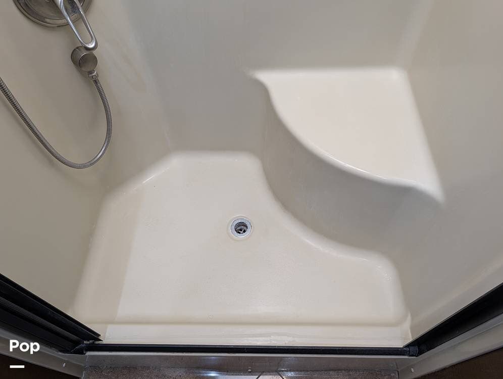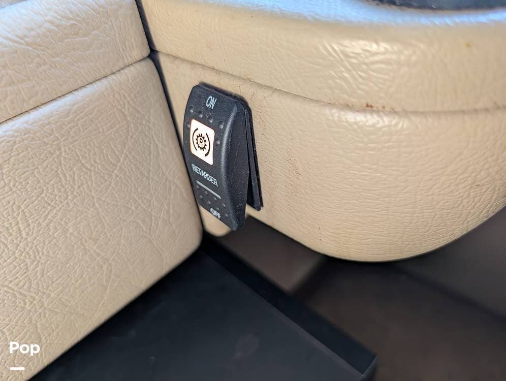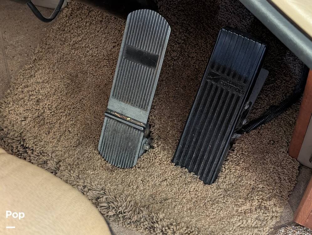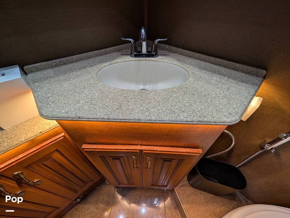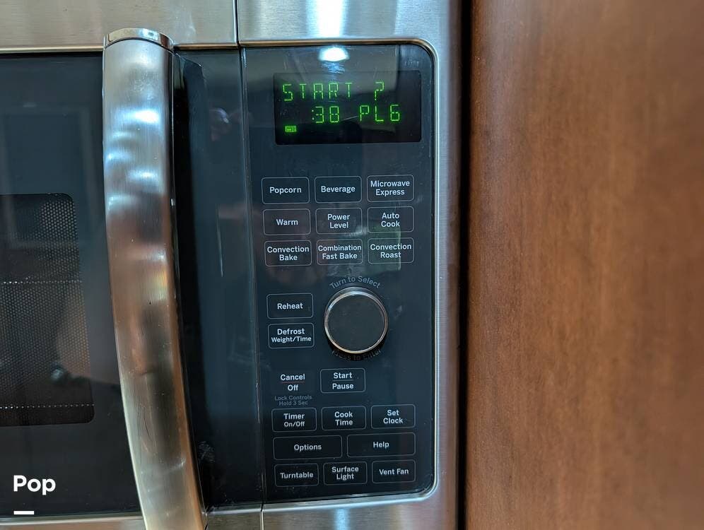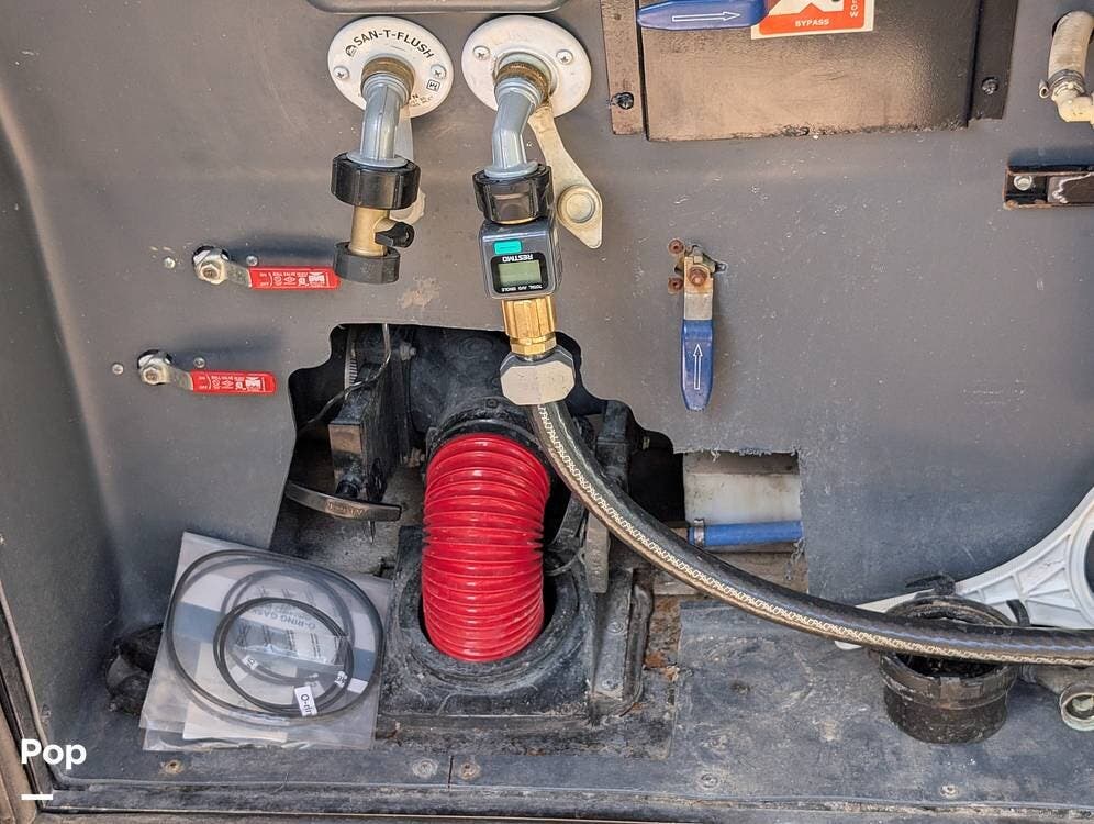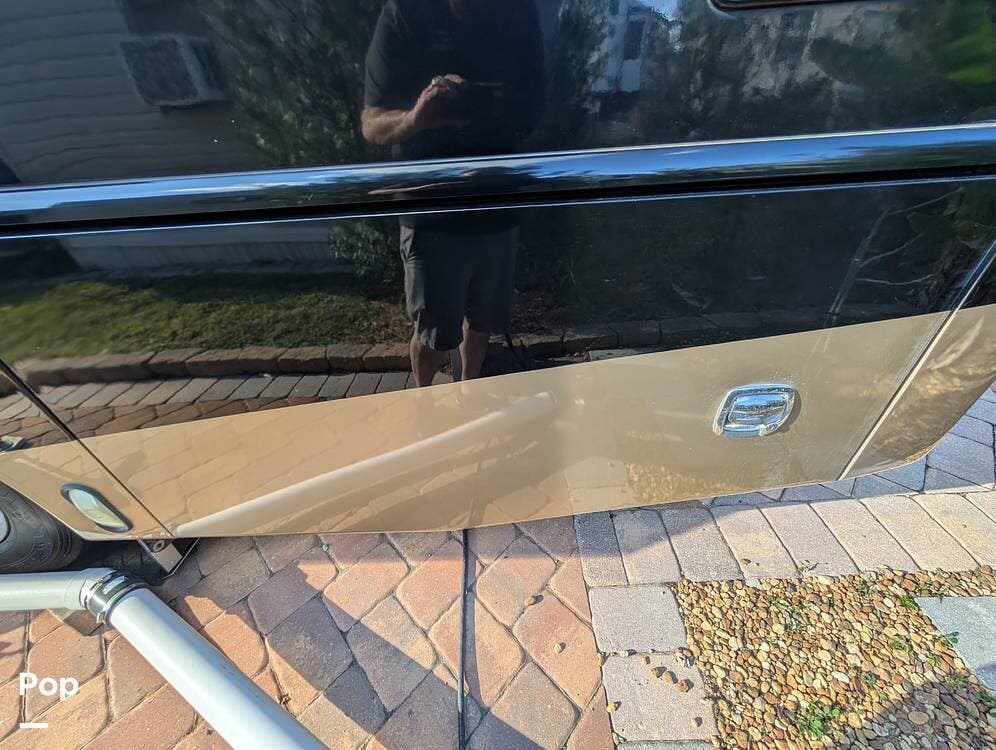 The main living area blends style and practicality with a fireplace accented by custom stonework, a residential refrigerator and freezer, and a convection microwave. Elegant porcelain tile flooring with decorative inlays adds a refined touch throughout the coach. A water softener and multi-stage filtration system ensure consistently high water quality. Up front, the swiveling captain's chairs remain in excellent condition with no peeling or wear, reflecting careful ownership.