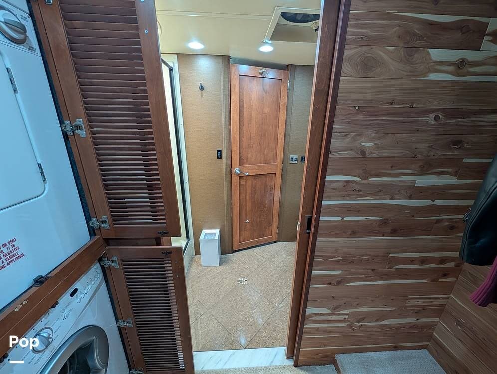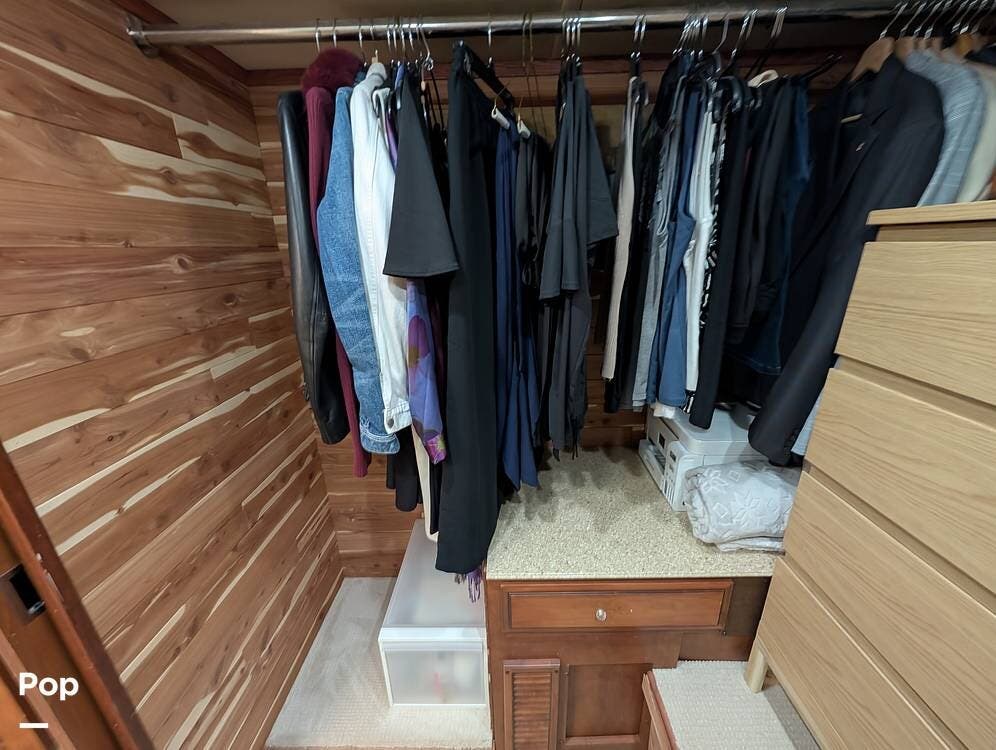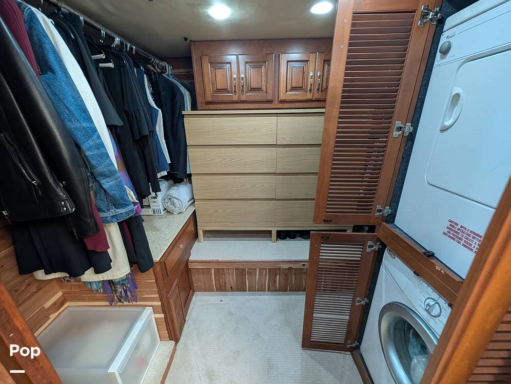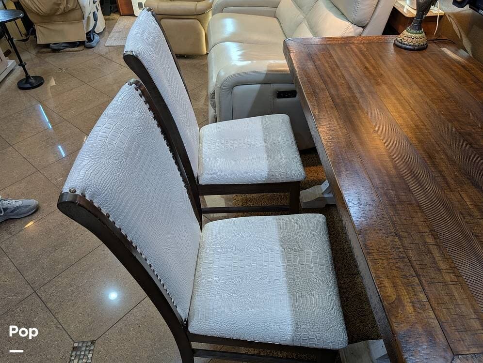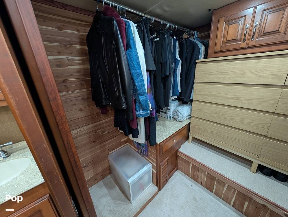 Inside, the layout has been upgraded to maximize livability and storage. A substantial kitchen enhancement features custom residential cabinetry and an expansive 77-inch countertop, providing abundant workspace and added storage capacity. The factory dinette has been removed in favor of a full-size dining table paired with high-end gator-skin chairs, creating a more open, comfortable dining area. A genuine leather power loveseat with adjustable headrest replaces standard seating, offering true residential comfort. The former bunk room has been thoughtfully converted into a spacious cedar-lined walk-in closet, complete with an in-unit washer and dryer--an exceptional feature for extended stays or full-time travel.
