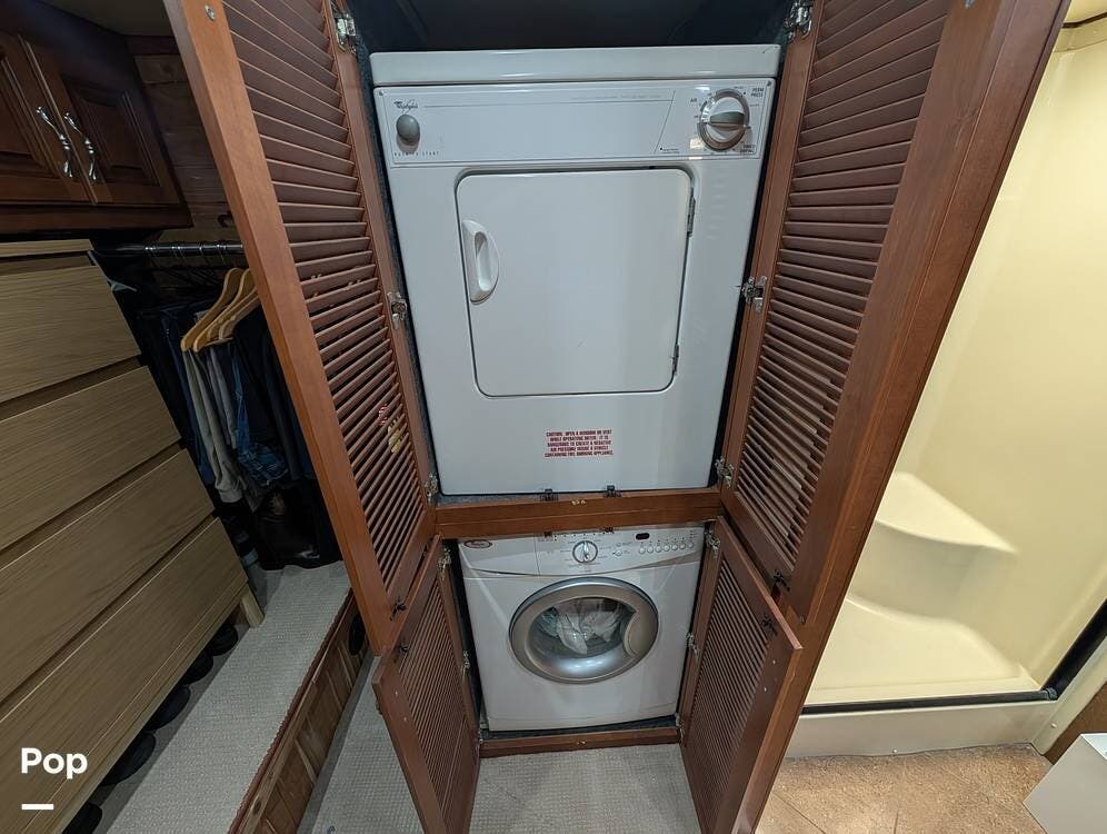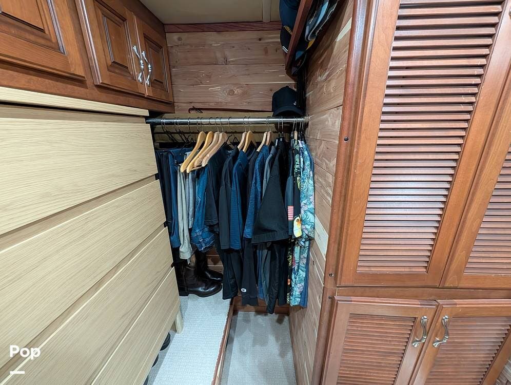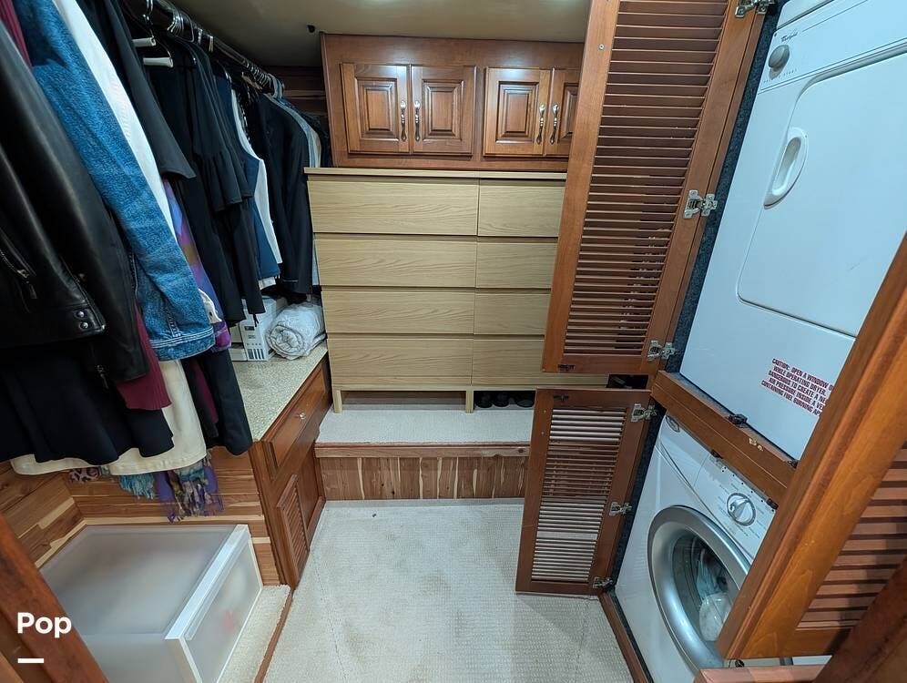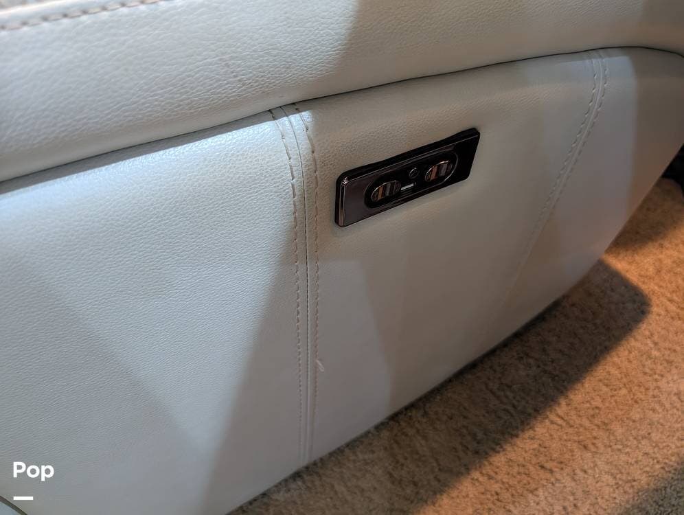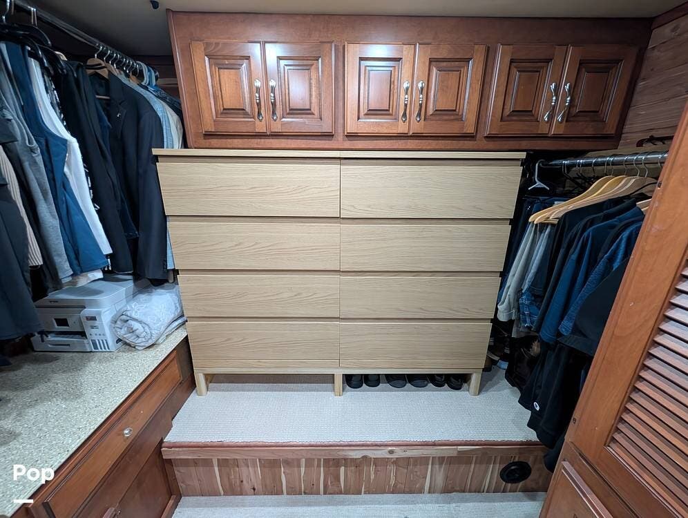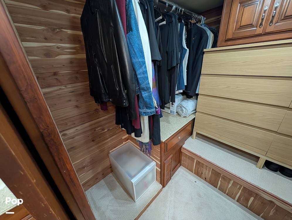 Inside, the layout has been upgraded to maximize livability and storage. A substantial kitchen enhancement features custom residential cabinetry and an expansive 77-inch countertop, providing abundant workspace and added storage capacity. The factory dinette has been removed in favor of a full-size dining table paired with high-end gator-skin chairs, creating a more open, comfortable dining area. A genuine leather power loveseat with adjustable headrest replaces standard seating, offering true residential comfort. The former bunk room has been thoughtfully converted into a spacious cedar-lined walk-in closet, complete with an in-unit washer and dryer--an exceptional feature for extended stays or full-time travel.
