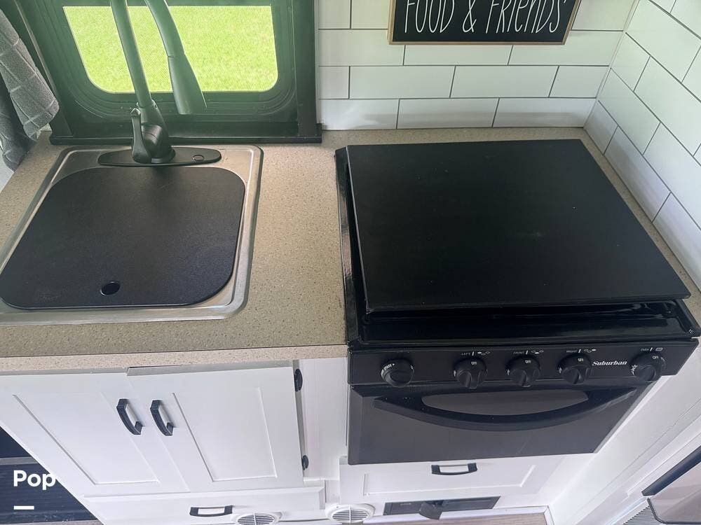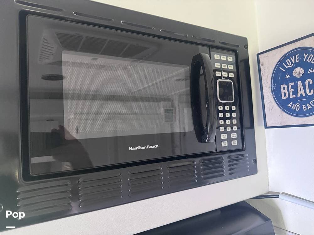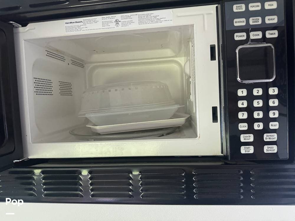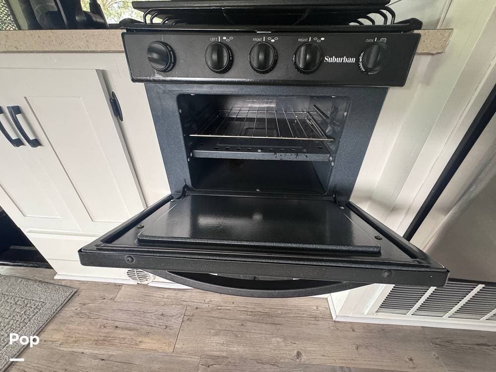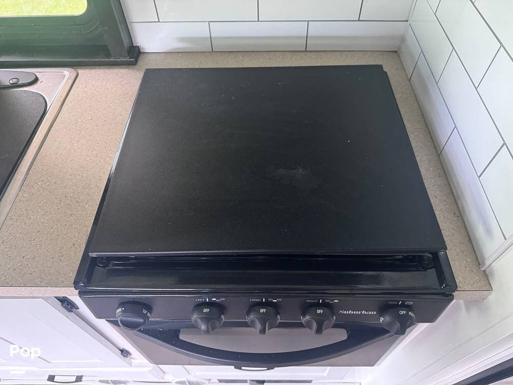 The kitchen offers all the essentials for cooking on the go. A new 12-volt refrigerator was installed in 2025, giving you efficient, modern cooling whether on battery or shore power. There's a microwave, cooktop, oven, and sink, along with overhead and under-counter storage for all your kitchen essentials.
