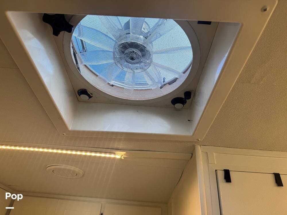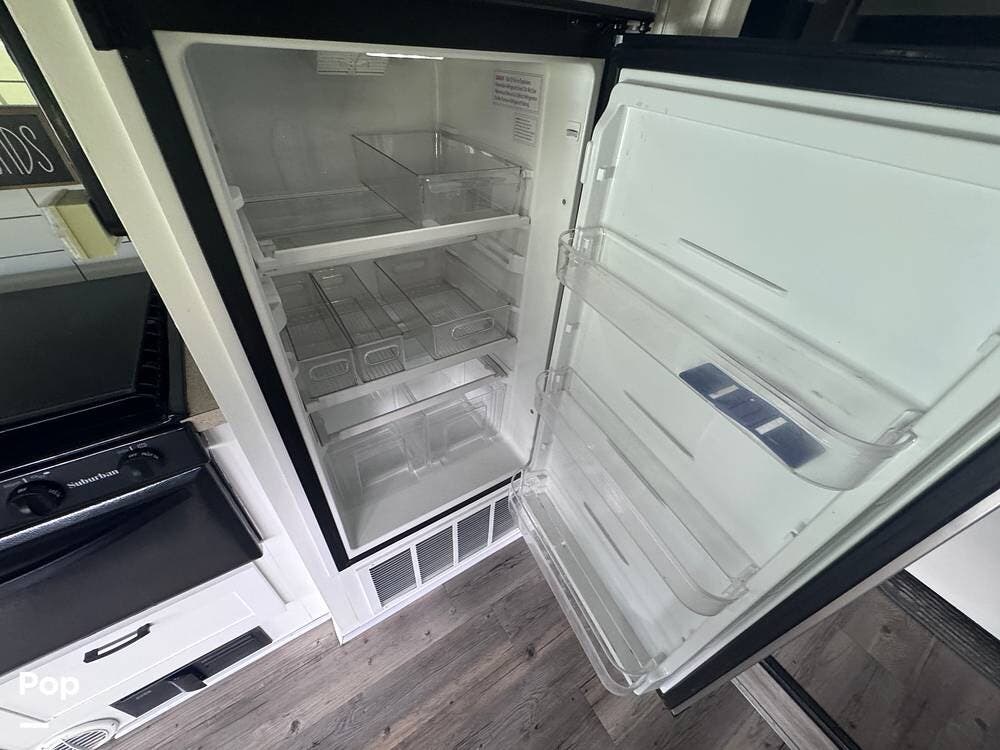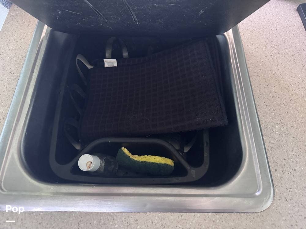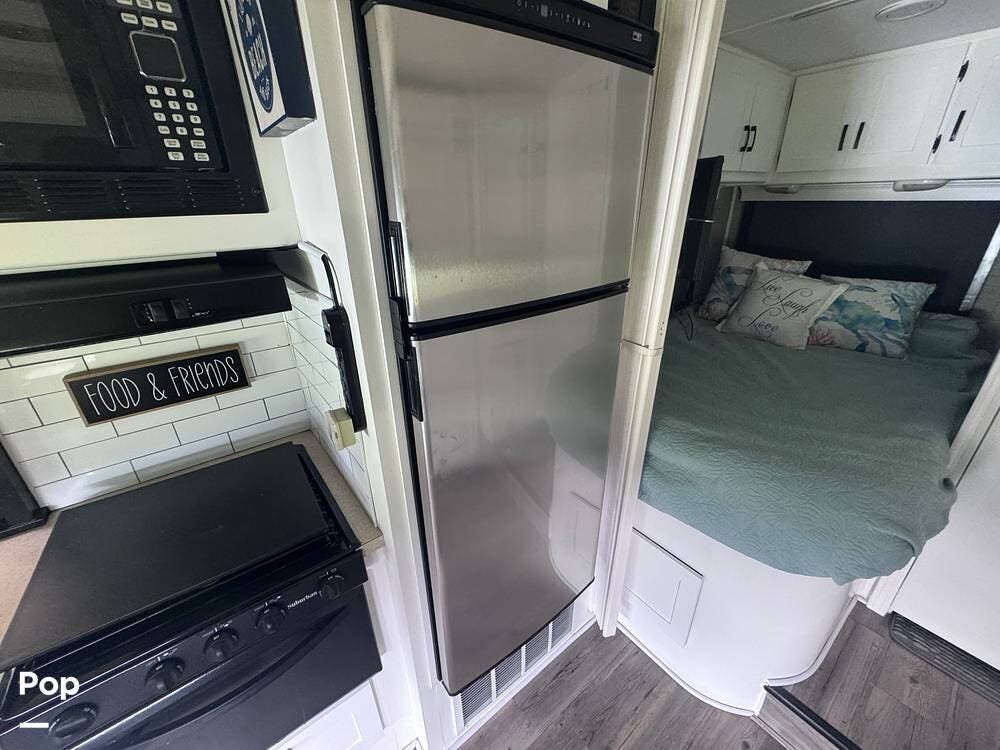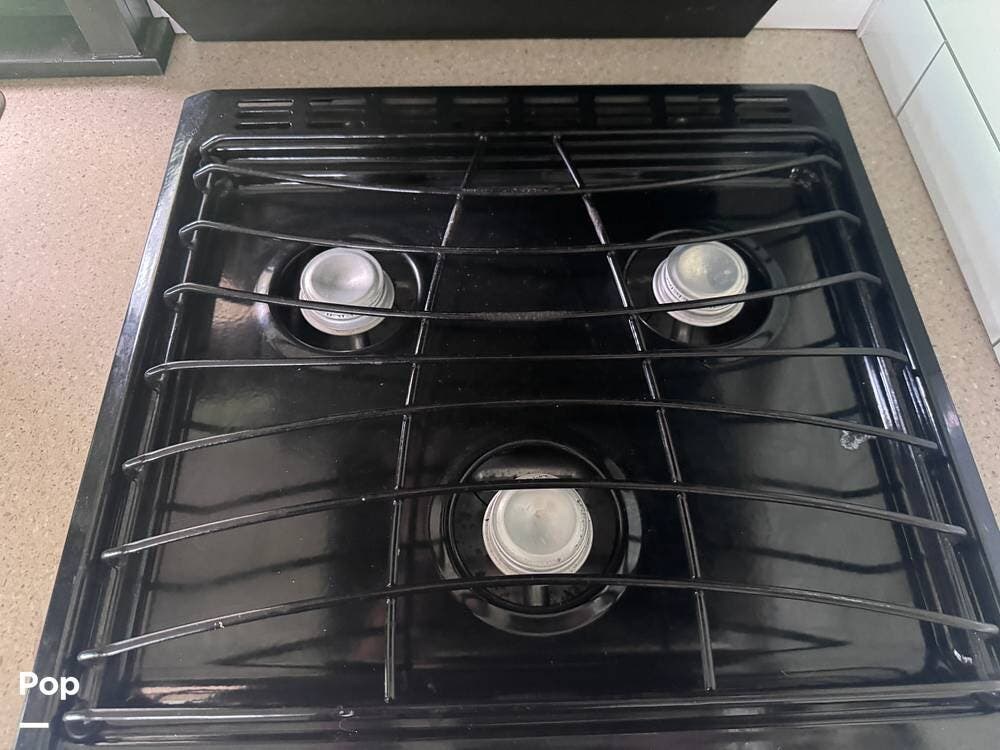 The kitchen offers all the essentials for cooking on the go. A new 12-volt refrigerator was installed in 2025, giving you efficient, modern cooling whether on battery or shore power. There's a microwave, cooktop, oven, and sink, along with overhead and under-counter storage for all your kitchen essentials.