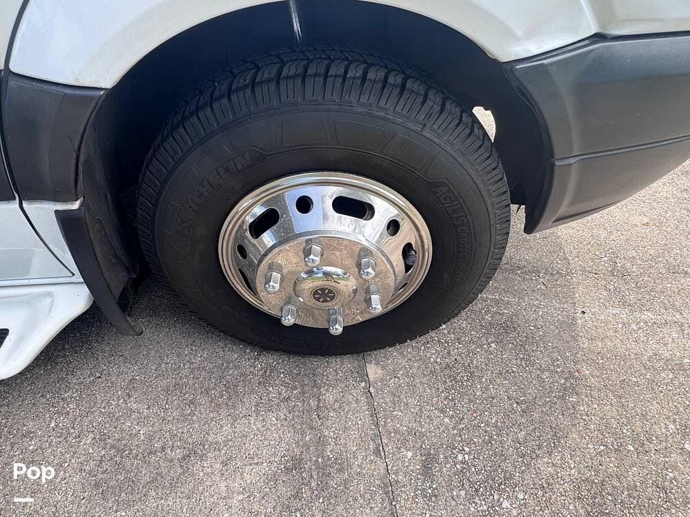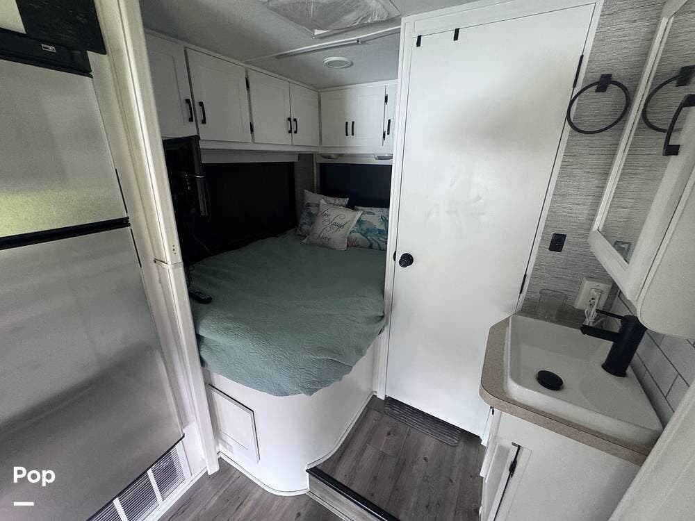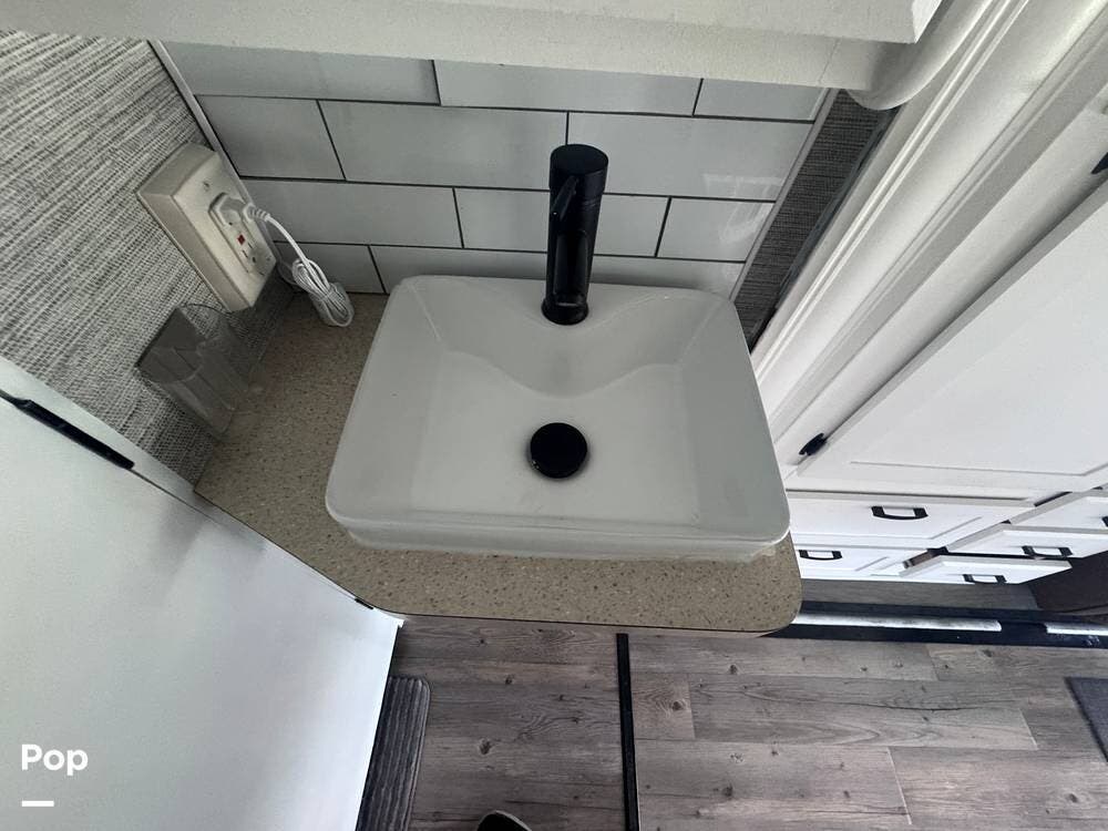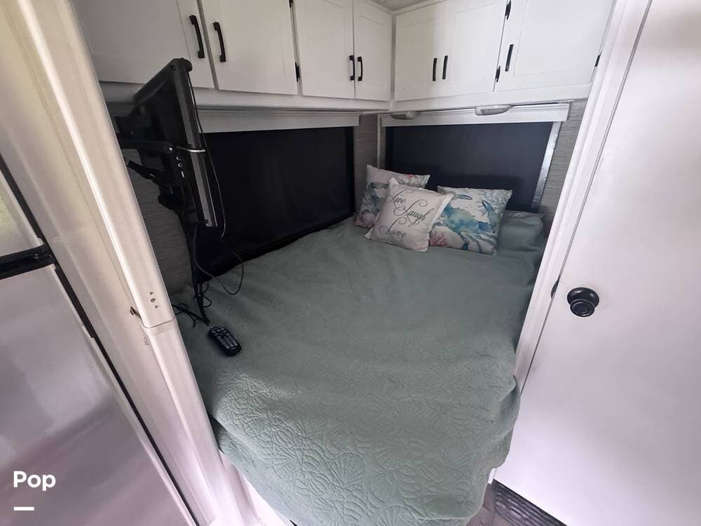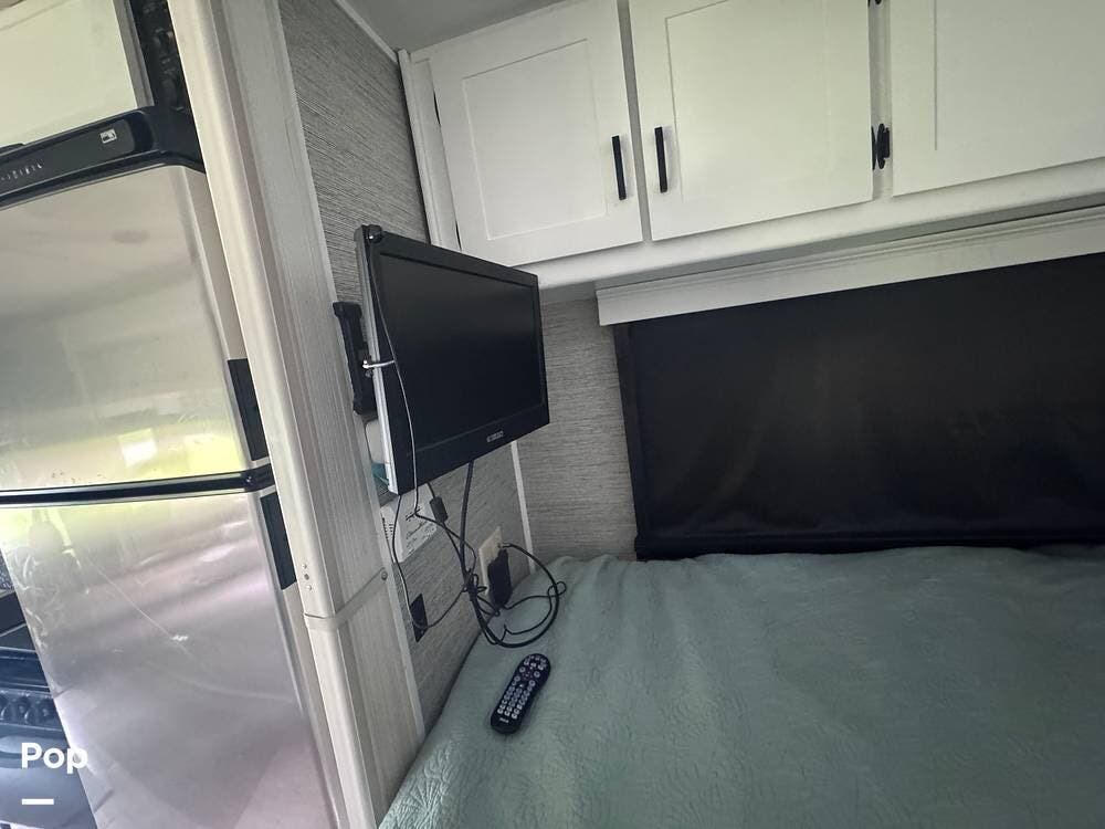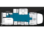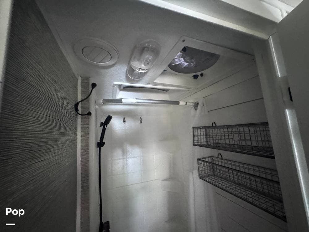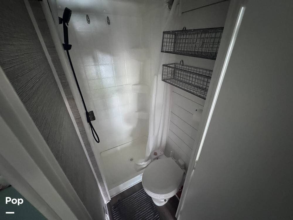 The bathroom is compact yet surprisingly spacious for a 24-foot motorhome. A square shower provides ample space for a comfortable rinse, while the vanity and toilet are thoughtfully arranged for daily use. Storage above and below the sink offers room for toiletries and linens.