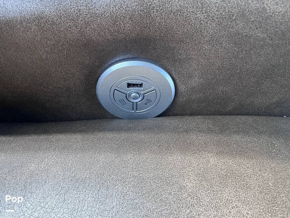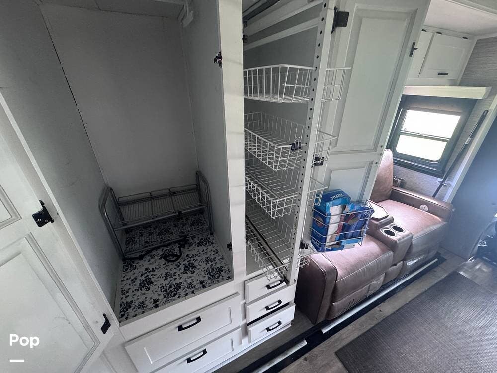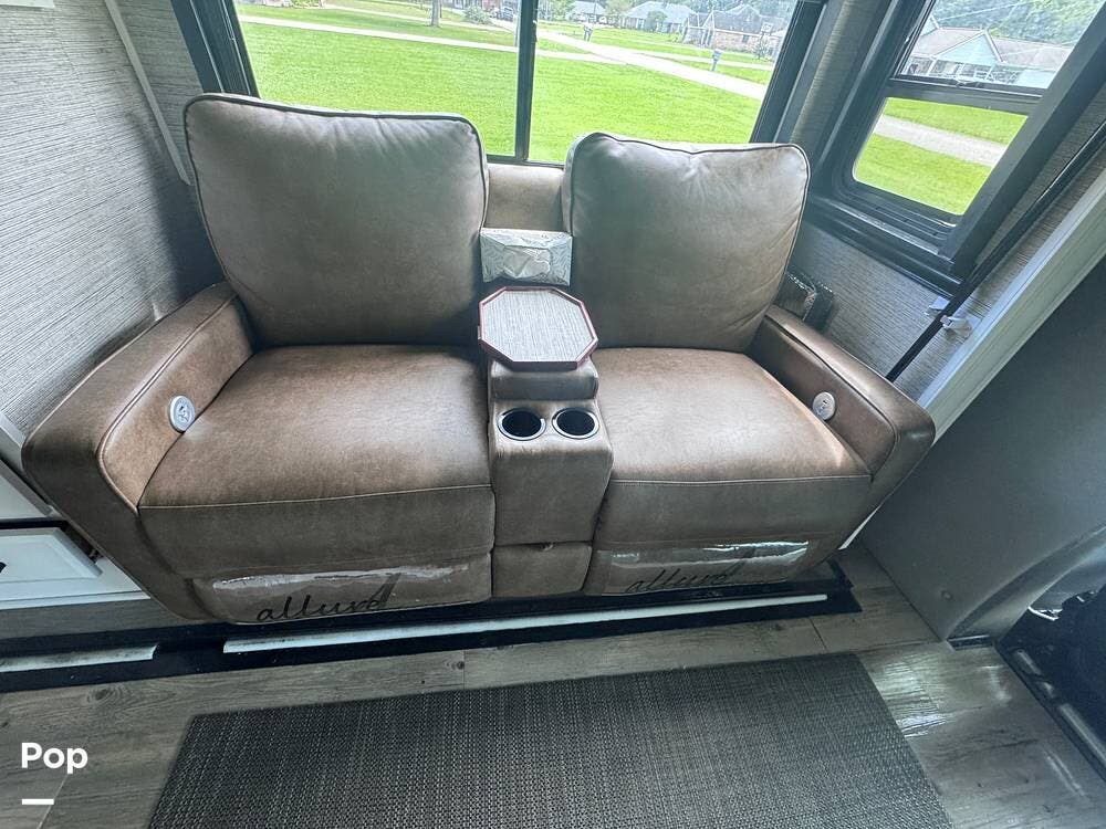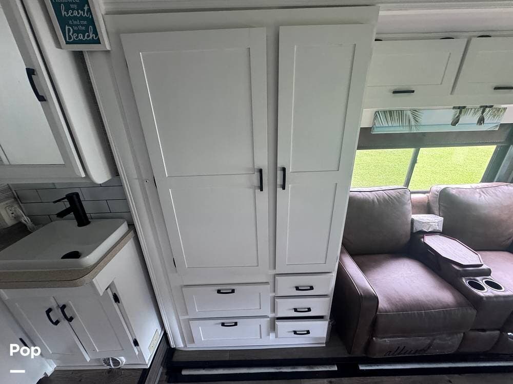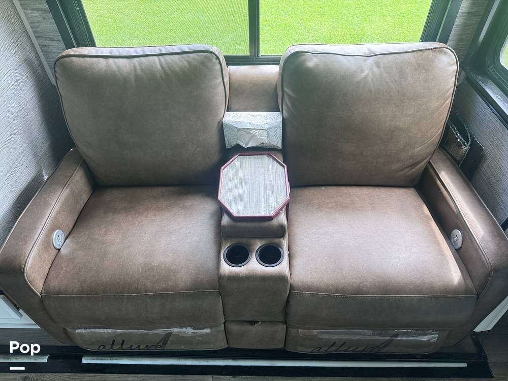 Step inside to find a cozy yet functional living area. The original dinette has been replaced with twin theater-style recliners that feature heat and massage functions, creating a relaxing space for unwinding after a day on the road.