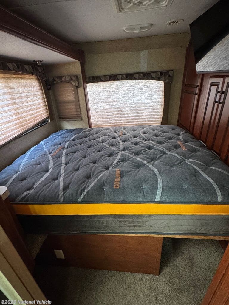 Inside, the living area has been thoughtfully updated with brand new recliners (2025) replacing the traditional sofa, offering superior comfort for relaxing after a day of travel or enjoying a movie night. A new upgraded mattress installed in 2024 ensures restful sleep in the private rear bedroom. The coach also includes two televisions, providing entertainment options in both the main living area and sleeping quarters.
