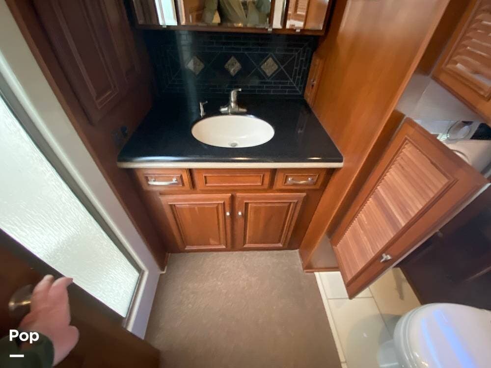 Just before the sliding entrance door to the master bedroom, there is a half bath with a sink and toilet.
