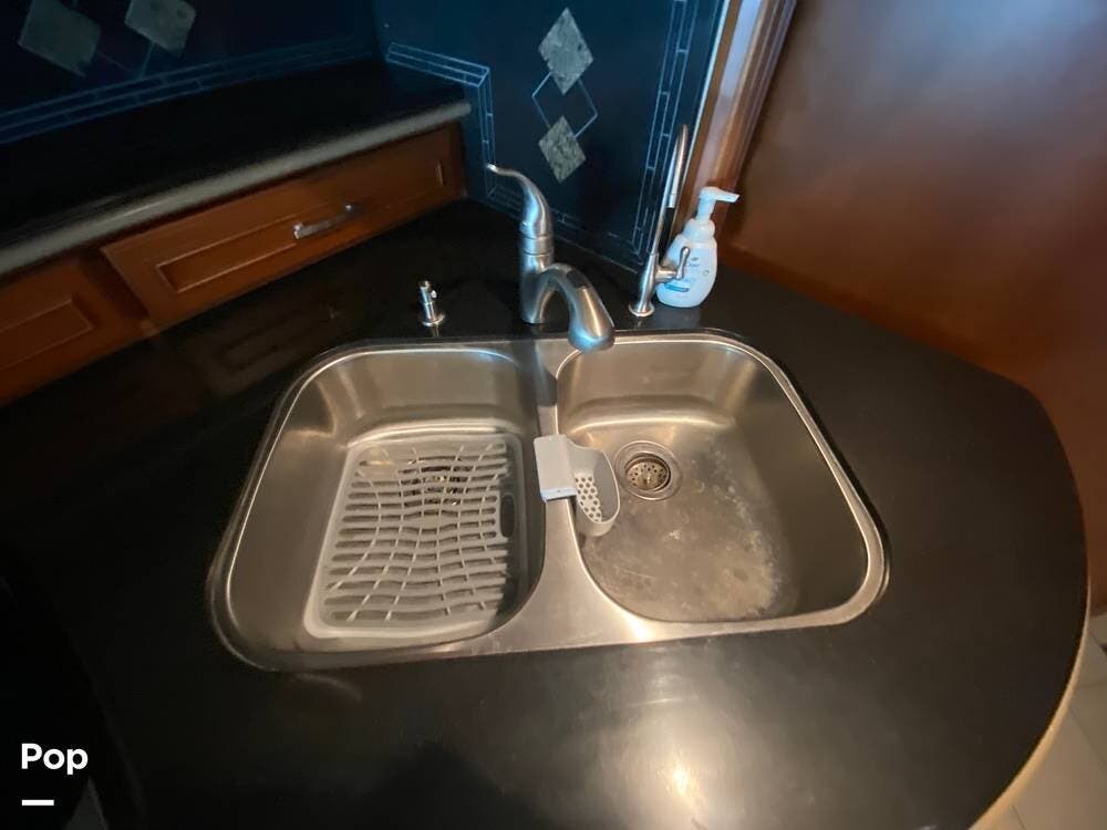 On the opposite side, the kitchen consists of a pull-out island, a 3-burner stove, a convection/microwave oven, and a double kitchen sink.