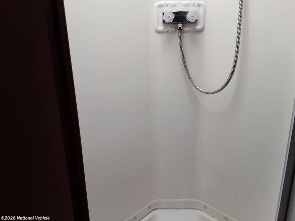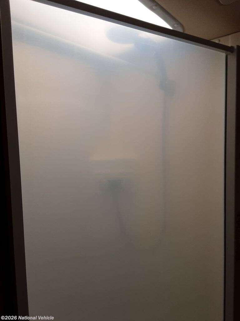 This coach features a bathroom complete with shower, toilet, and a sink with a medicine cabinet above for your convenience.