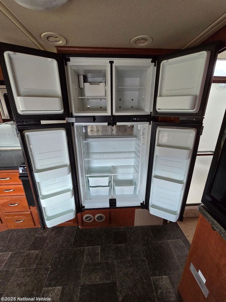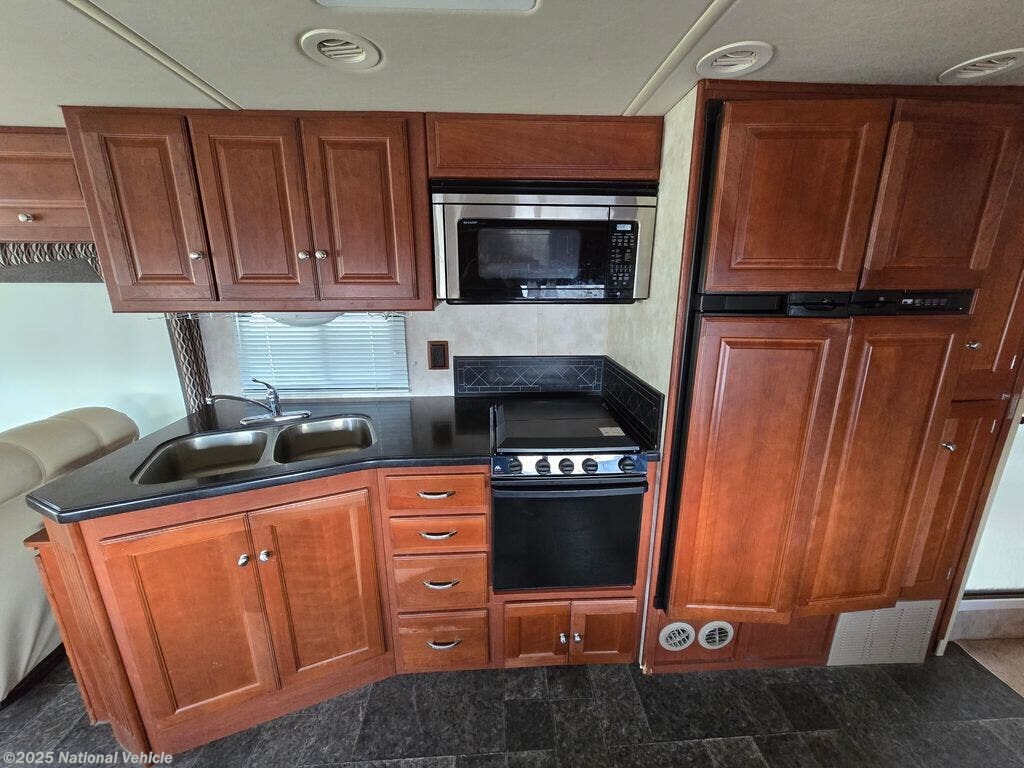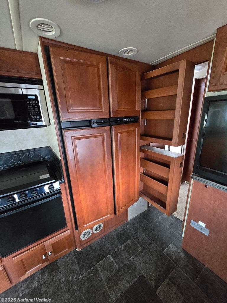The kitchen is fully equipped with a 3-burner cooktop, microwave/convection oven, and residential-style refrigerator, making it easy to cook meals while on the go.