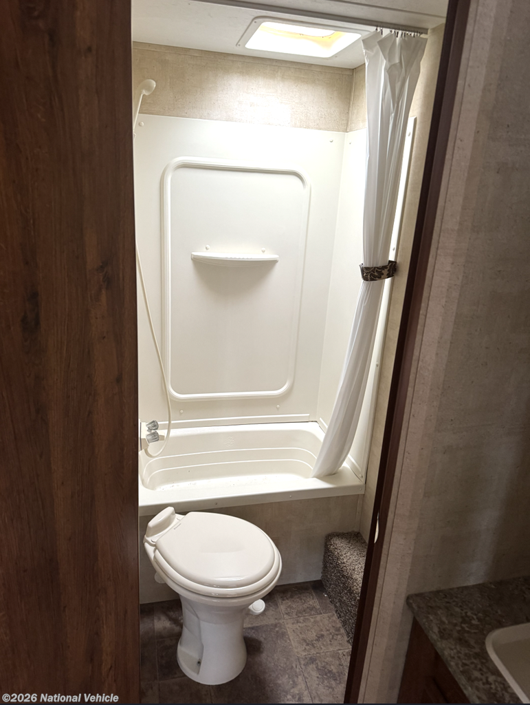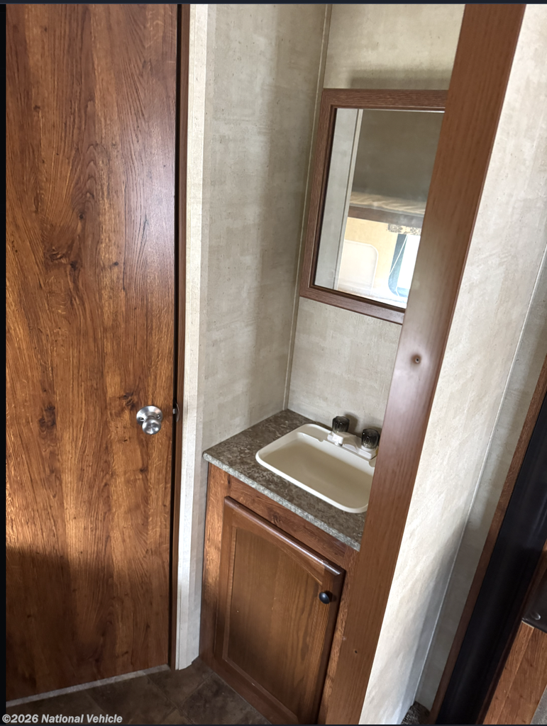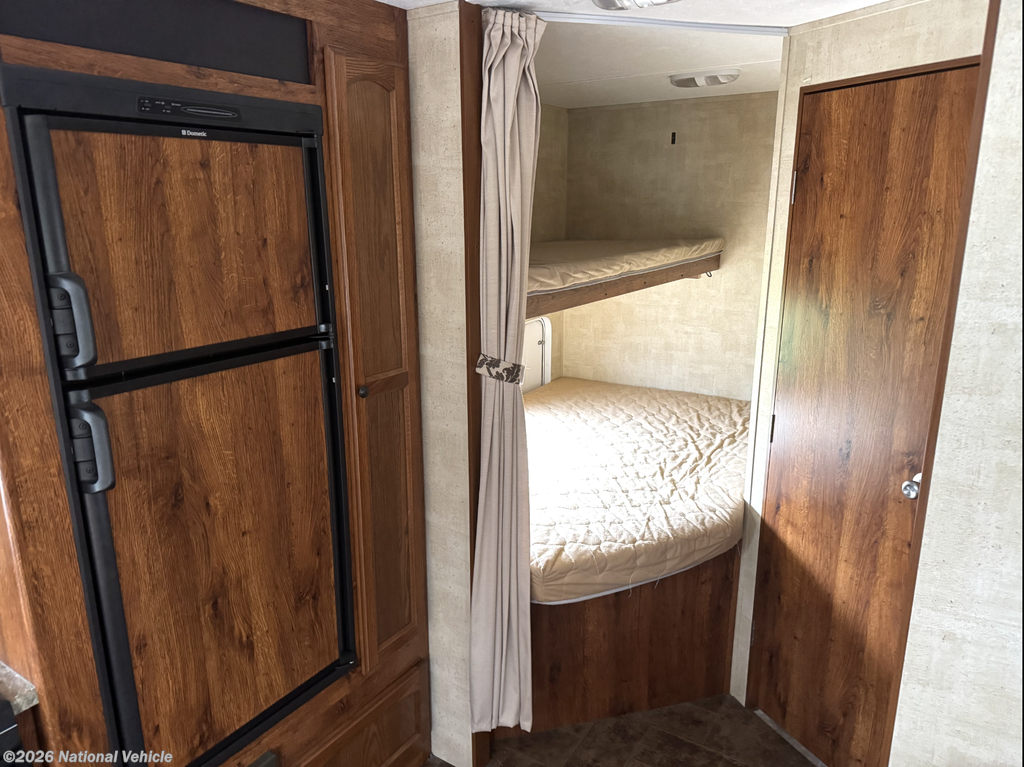 Measuring just under 32 feet in length and sleeping up to nine people, this travel trailer offers a great balance of space and towability. Additional features include pass-through exterior storage, a power awning, air conditioning, and a durable design built for years of camping enjoyment.