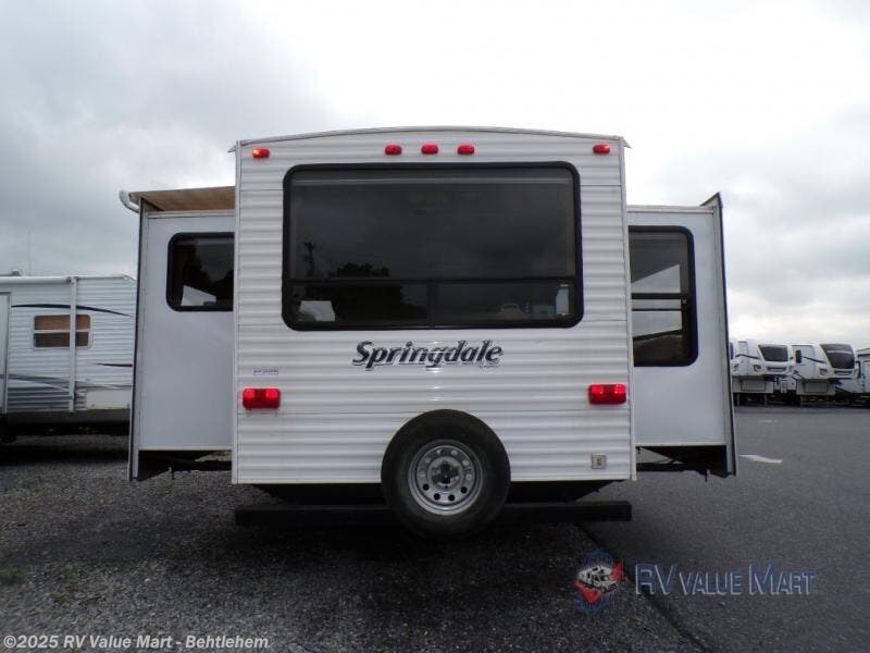 Keystone Springdale Travel Trailer w/Rear Entertainment Including: Full End Wall Ent. Center w/Retractable LCD TV, 2 Lounge Chair Slide out, Air Bed Sofa & U-Dinette Slide, Overhead Cabinets Above Sofa, Pantry, Kitchen Sink, 3 Burner Range, Refrigerator, Walk-Thru Bath w/Angle Shower, Toilet & Vanity w/Sink, Front Queen Bed w/Closets & Nightstands, Pass-Thru Storage in Front & Rear Slide out Exterior Storage.
