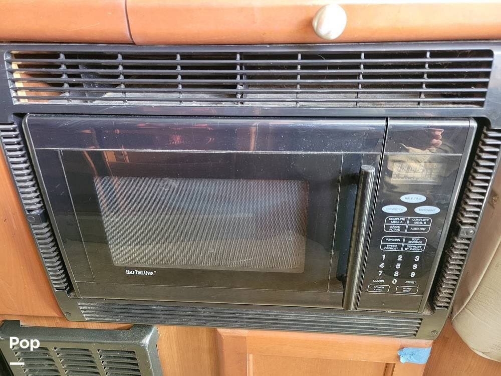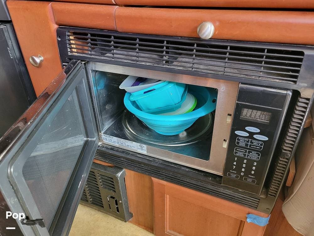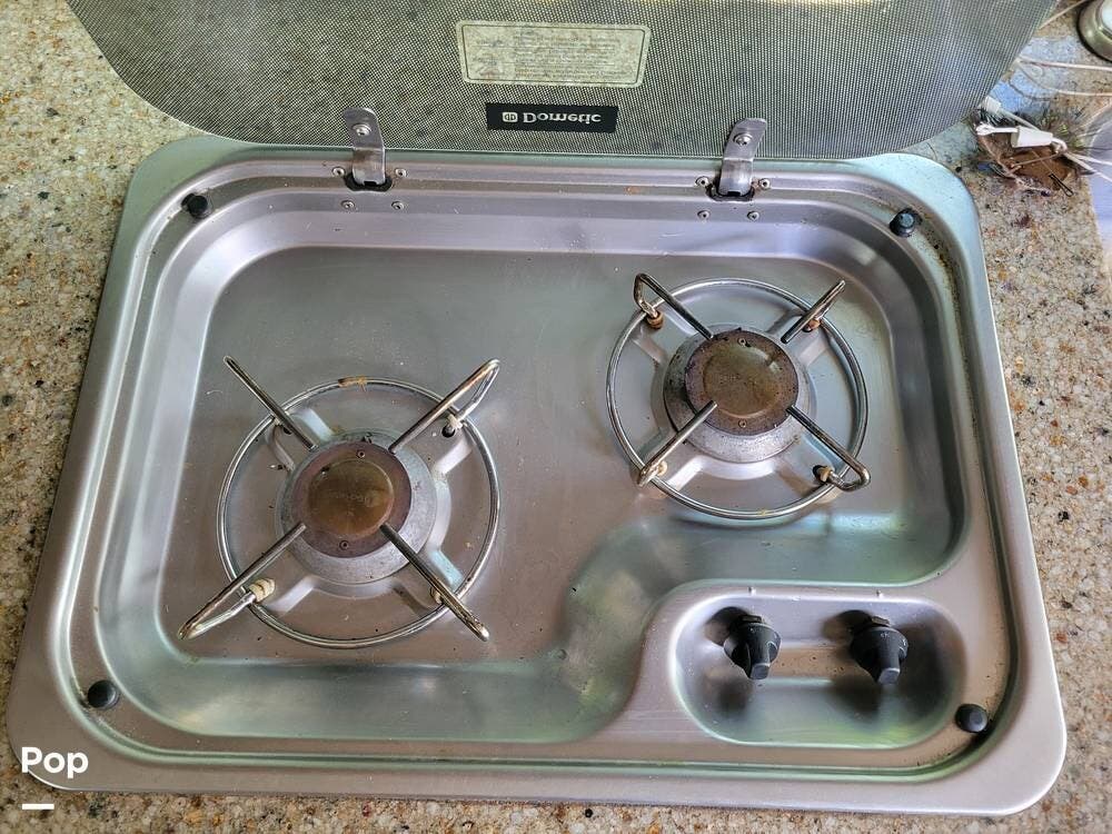The kitchen has a convection microwave, a two-burner propane stove, a stainless steel sink, and a compact refrigerator.