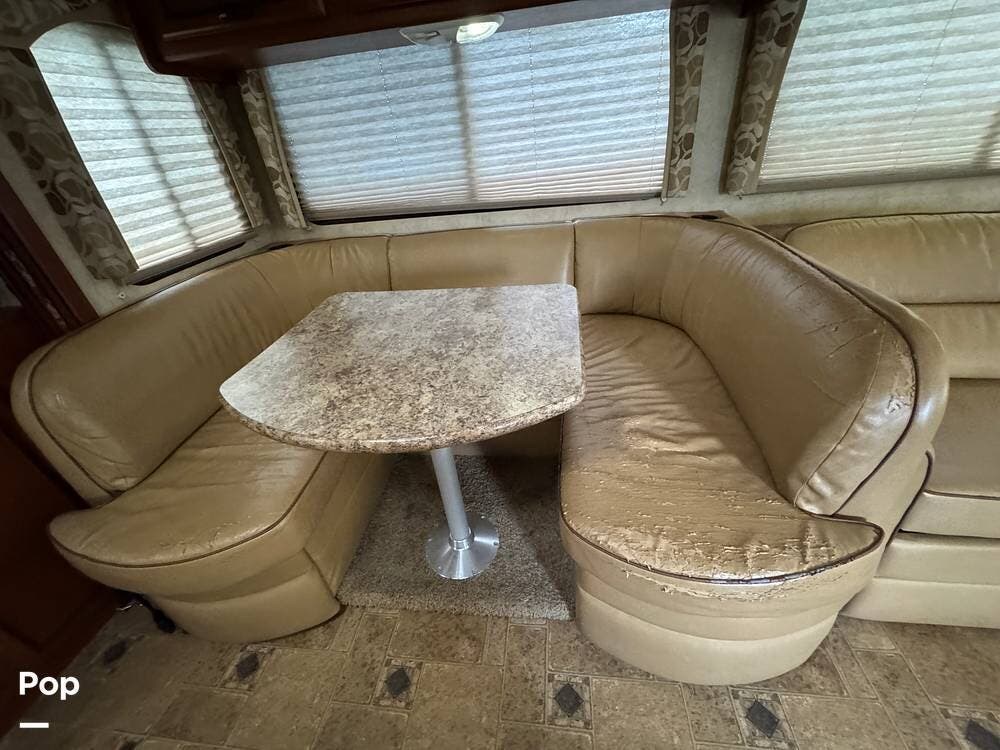 Inside, this family-friendly Class A coach sleeps up to 8, featuring a queen bed in the master suite, a sleeper dinette, a Hide-A-Bed sofa, and a convenient drop-down overhead bunk.