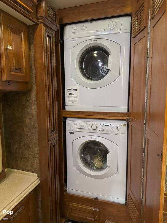 The living area also features two sofas that pull out to create cozy sleeping quarters. A stacked washer/dryer makes a handy addition, as does the standard vacuum system for quick cleaning.