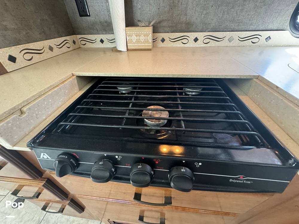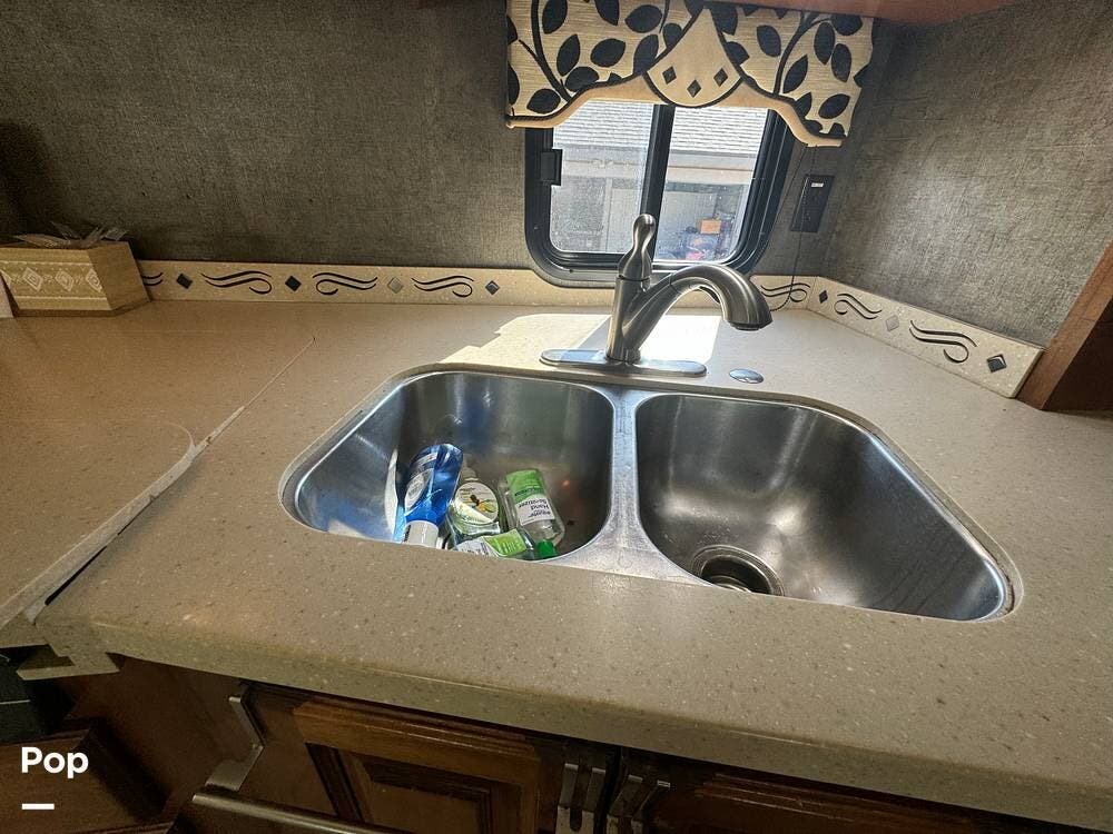 The kitchen is located on the passenger side. It is outfitted with a microwave/convection oven, a three-burner stove with a cooktop, an updated large single stainless steel sink, and a refrigerator/freezer with an ice maker.
