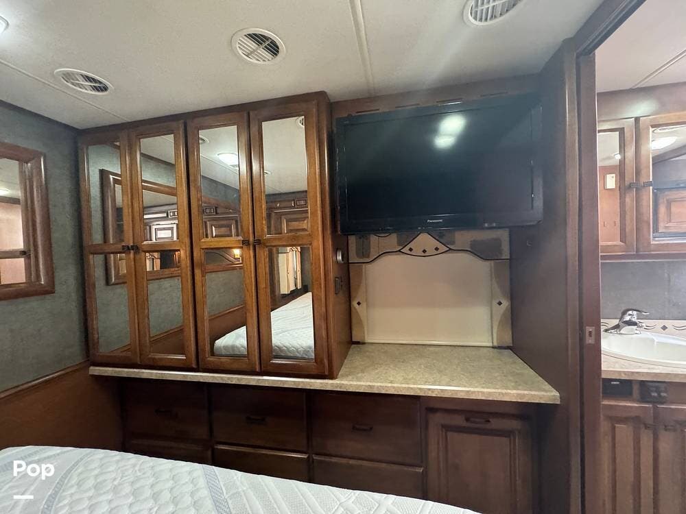 Across from the bed are large hanging closets and drawer storage. A TV is mounted facing the bed above a makeup area.