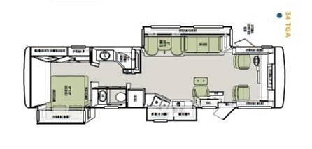 Measuring just under 35 feet in length, the 34TGA features three slide-outs that significantly expand the interior living space, offering a roomy and inviting environment for up to six people.