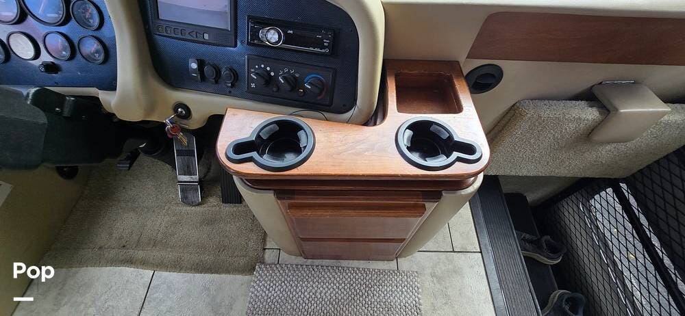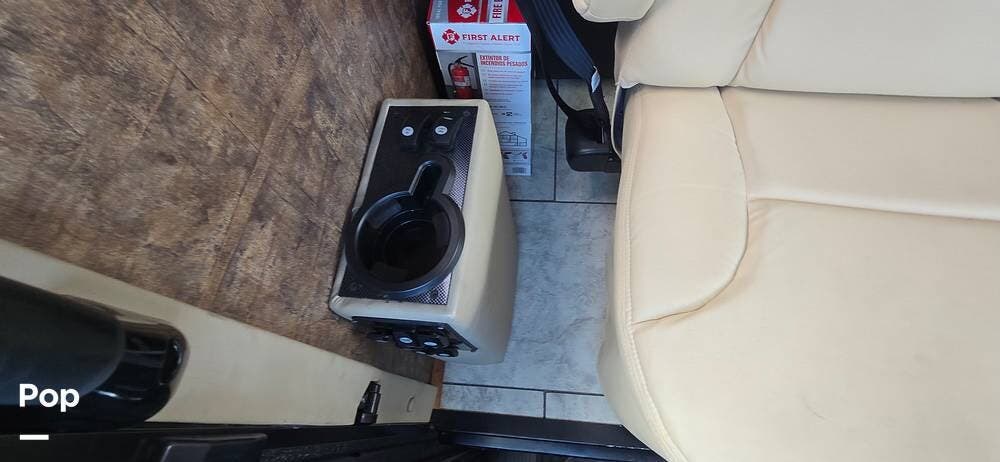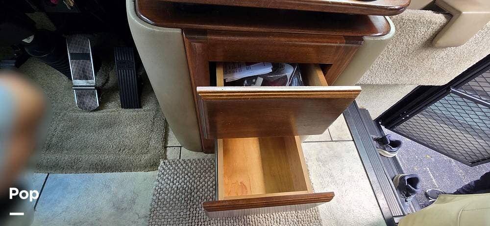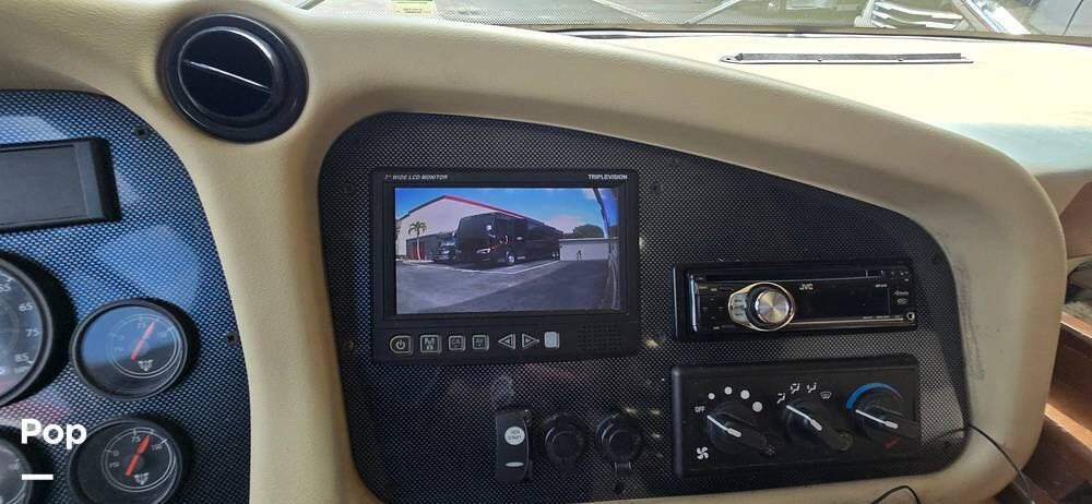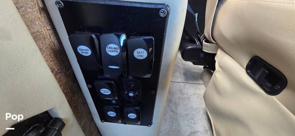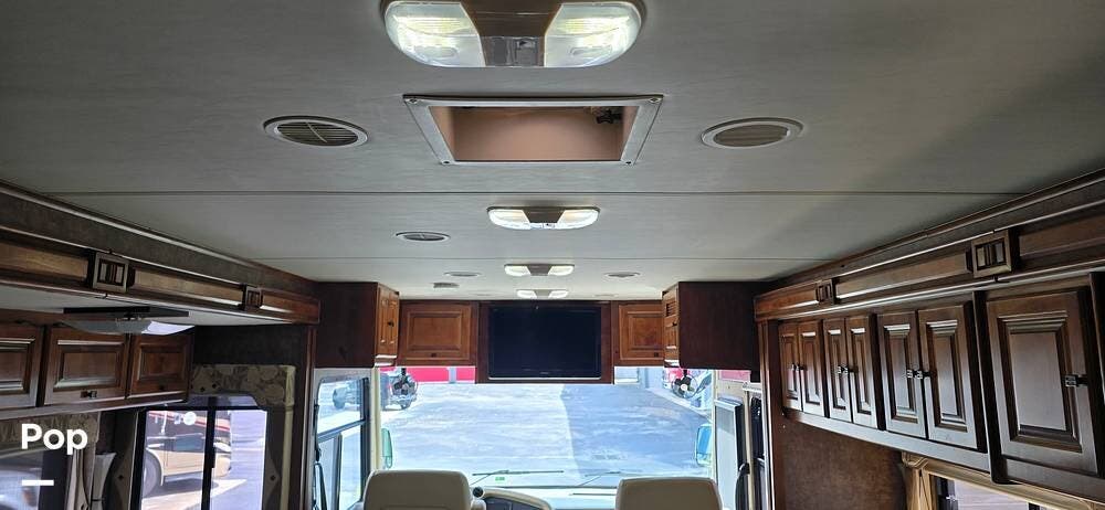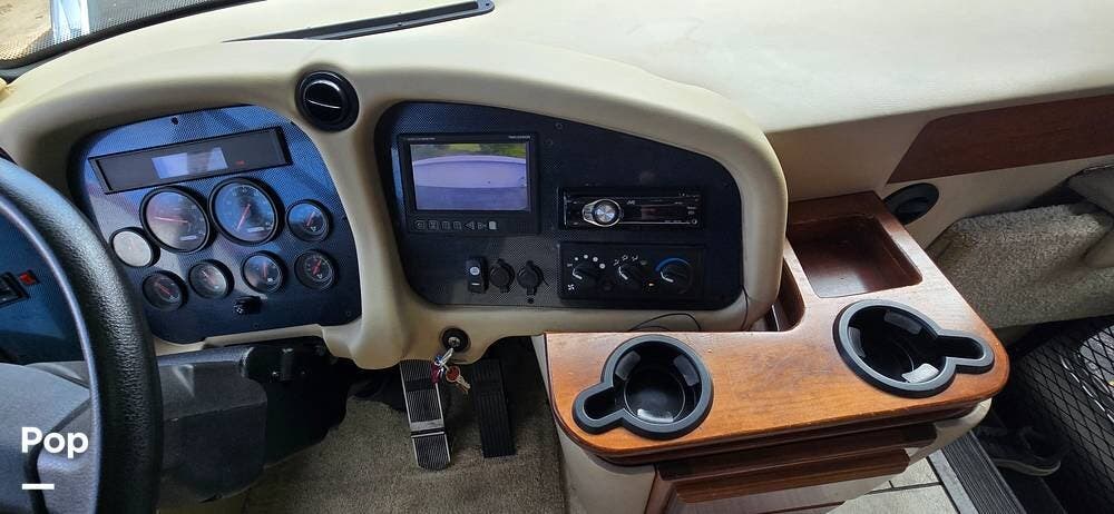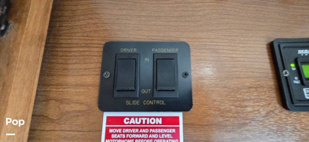 The cockpit area is thoughtfully designed for comfort, visibility, and control. The driver and passenger captain's chairs provide supportive seating for long travel days and swivel to integrate with the living space when parked. A well-laid-out dash places all gauges and controls within easy reach, while the rear vision camera system enhances confidence when maneuvering. Power mirrors, cruise control, air-ride suspension, and the commanding panoramic windshield offer excellent road visibility and a smooth, controlled driving experience that makes every mile enjoyable.