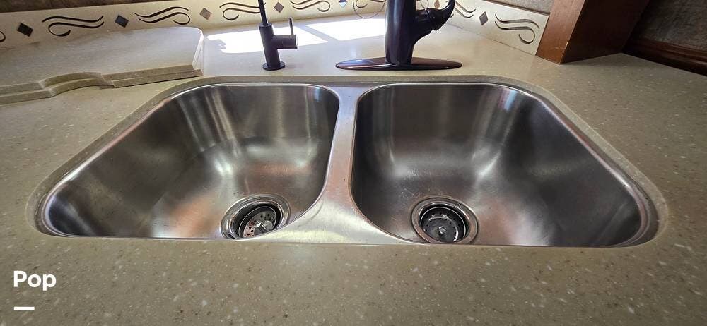 Outdoor living is enhanced with power patio awnings that provide comfortable shade and exterior lighting for relaxing evenings at the campsite. A 5,000-lb hitch receiver adds versatility for towing, while well-organized utility hookups and exterior service compartments make setup simple and efficient.