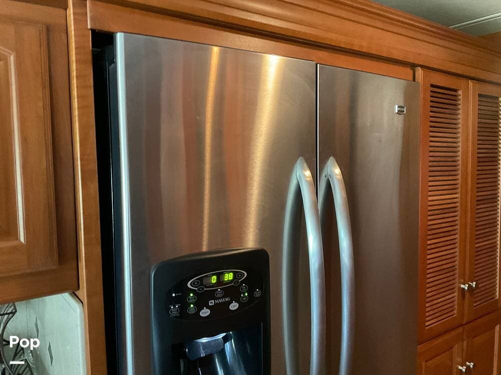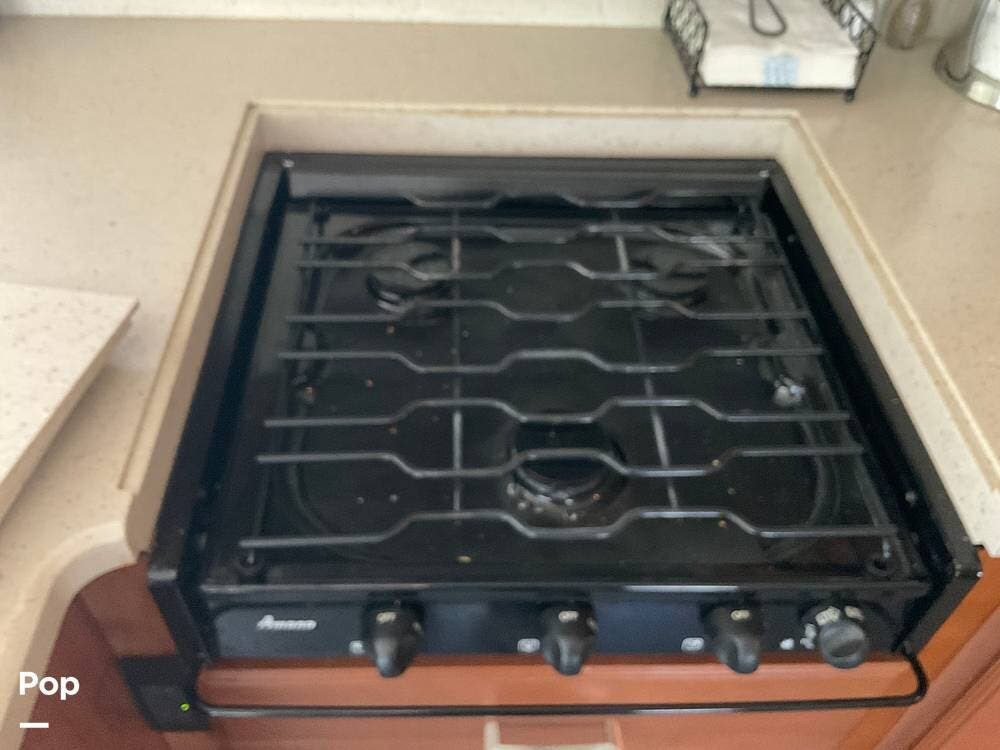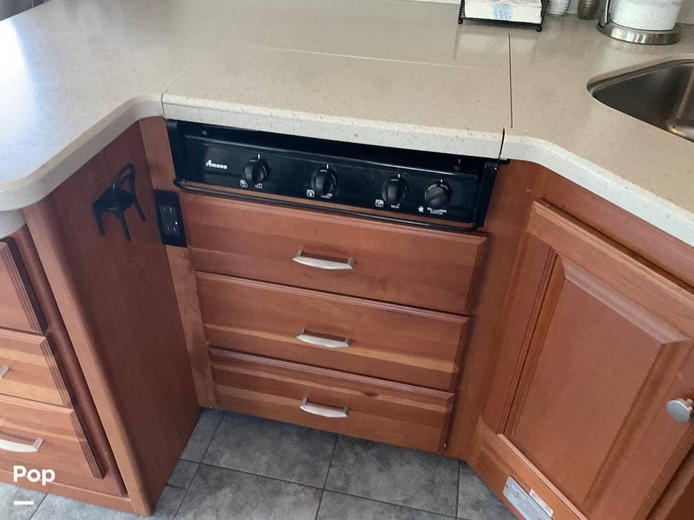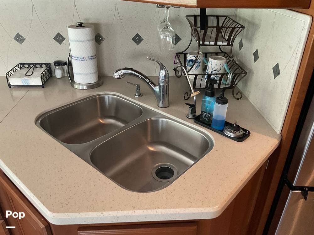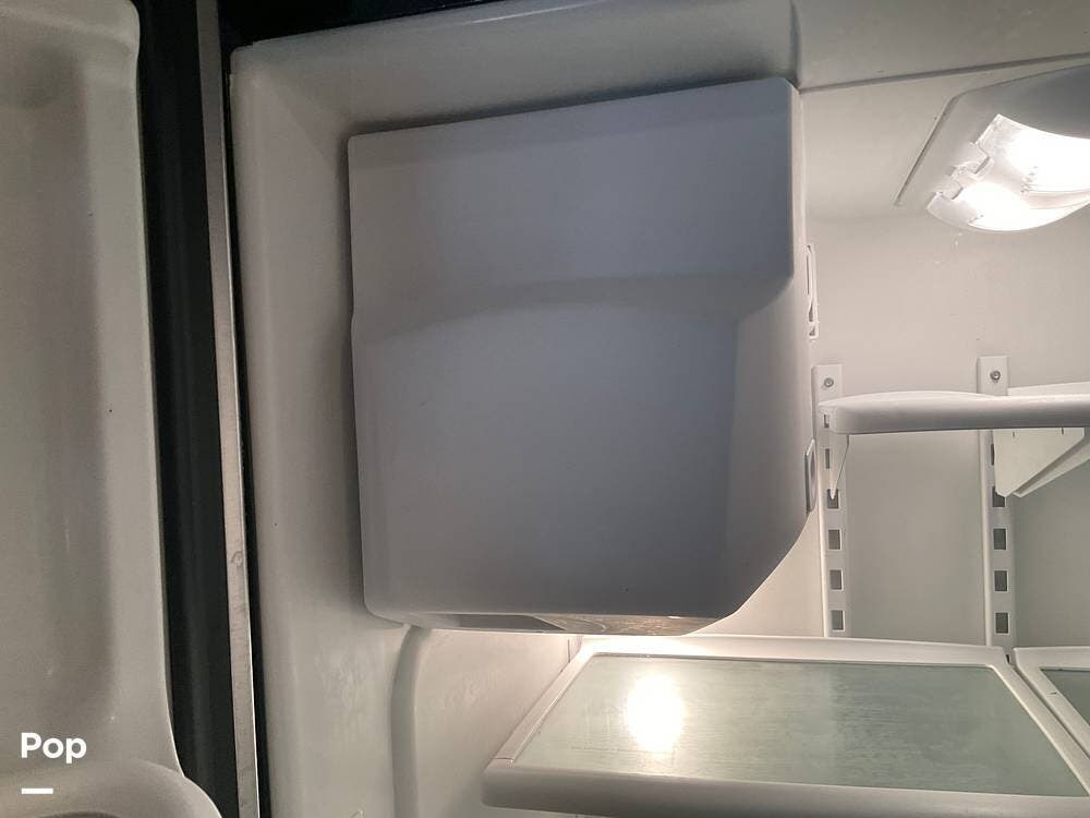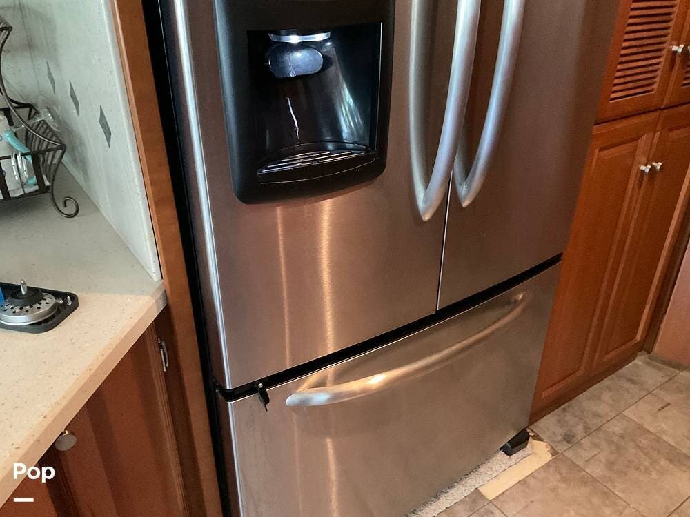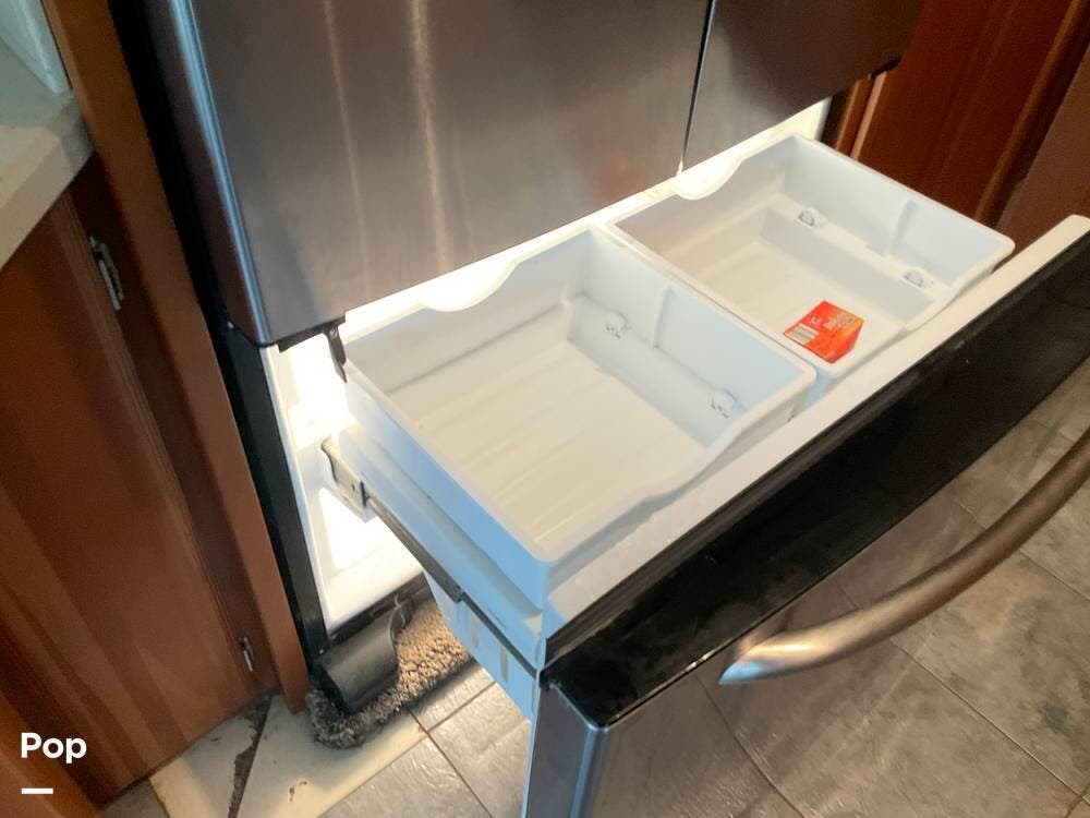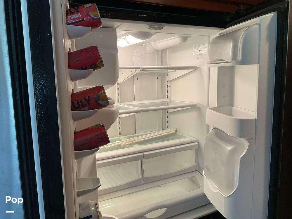 Moving into the kitchen, you'll find a pull-out island ideal for meal prep, alongside a three-burner stove and a double-bowl sink for easy cleanup. A residential-size refrigerator with an ice maker keeps your groceries fresh and your drinks chilled. The expandable dinette provides ample space for dining, working, or playing games.