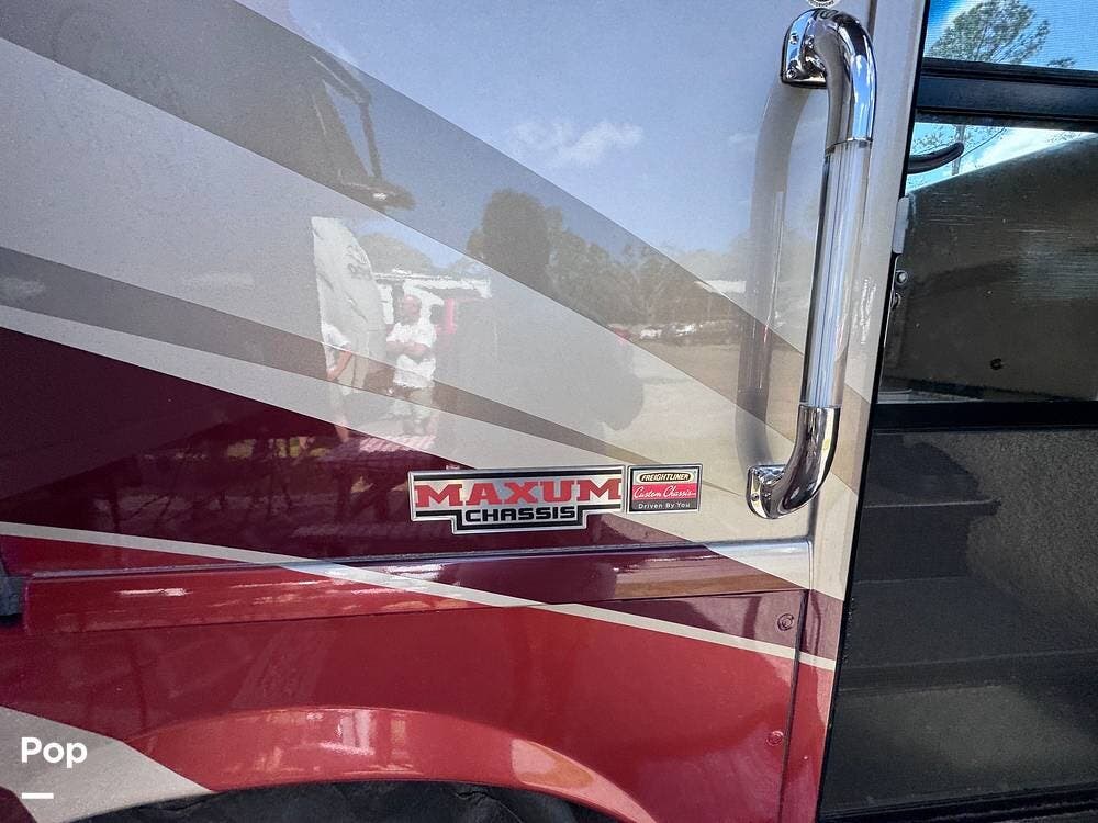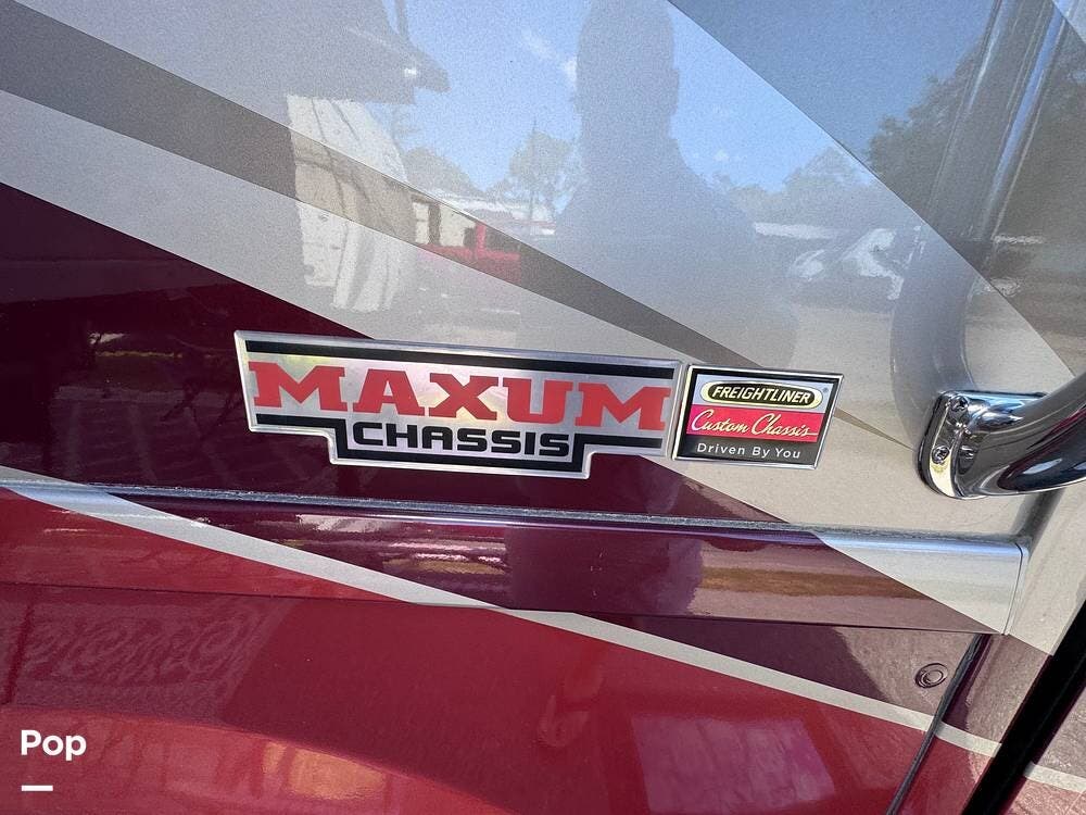 The exterior features the Freightliner Maxum chassis and Cummins ISC 8.3L diesel engine, four slides, a retractable patio awning, a diesel generator, an outdoor shower, tire covers, and storage compartments galore.