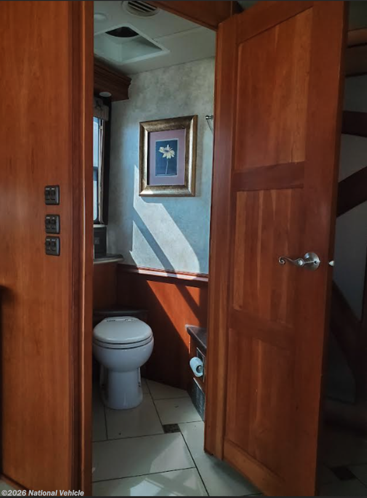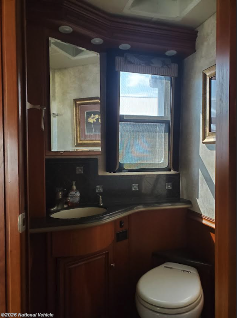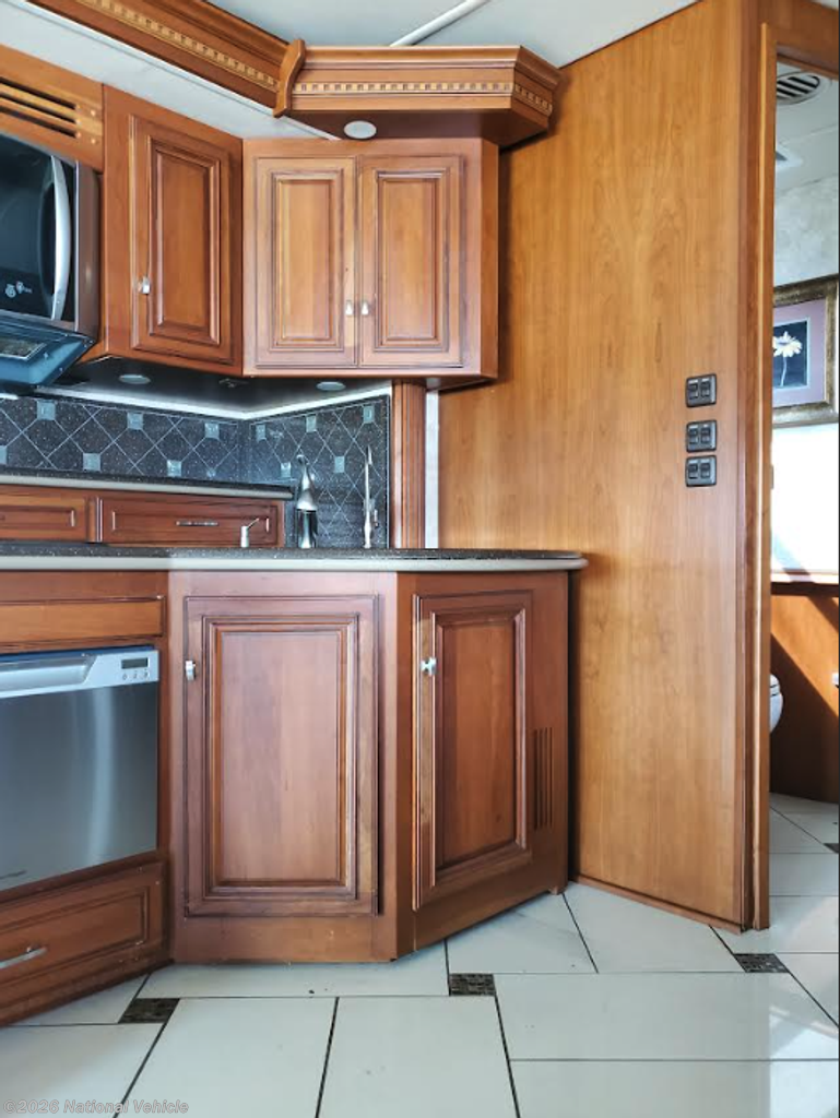 The master suite is a private oasis, complete with a king-size bed, spacious wardrobe, and a rear master bath with dual vanities, a large shower, and washer/dryer for extended travel. A half bath mid-coach ensures convenience for guests. High-end finishes like porcelain tile flooring, rich cabinetry, and designer lighting elevate the interior to a true luxury standard.
