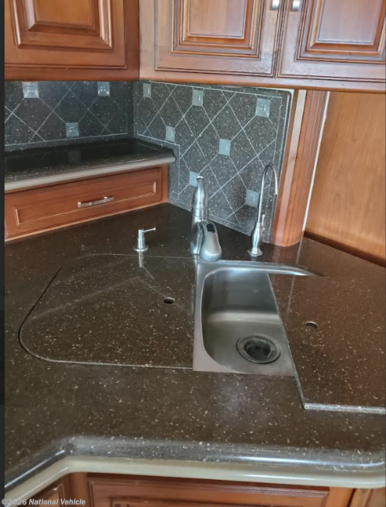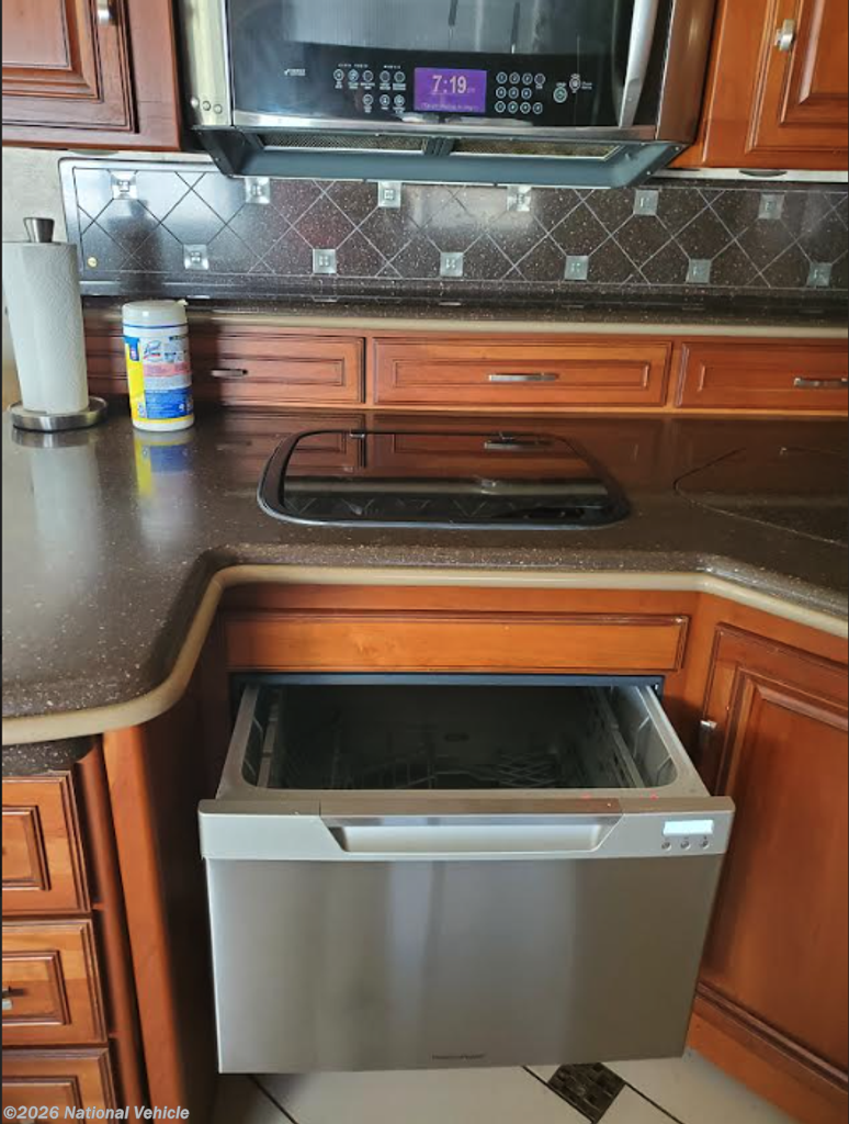 Inside, you?ll find an expansive floorplan enhanced by full-wall and opposing slide-outs, creating a true home-like feel. The beautifully appointed living area features premium furnishings, a fireplace, large HDTV, and a comfortable seating arrangement perfect for relaxing or entertaining guests. The gourmet kitchen includes solid-surface countertops, residential refrigerator, convection microwave, induction cooktop, and abundant storage, making meal preparation a joy.