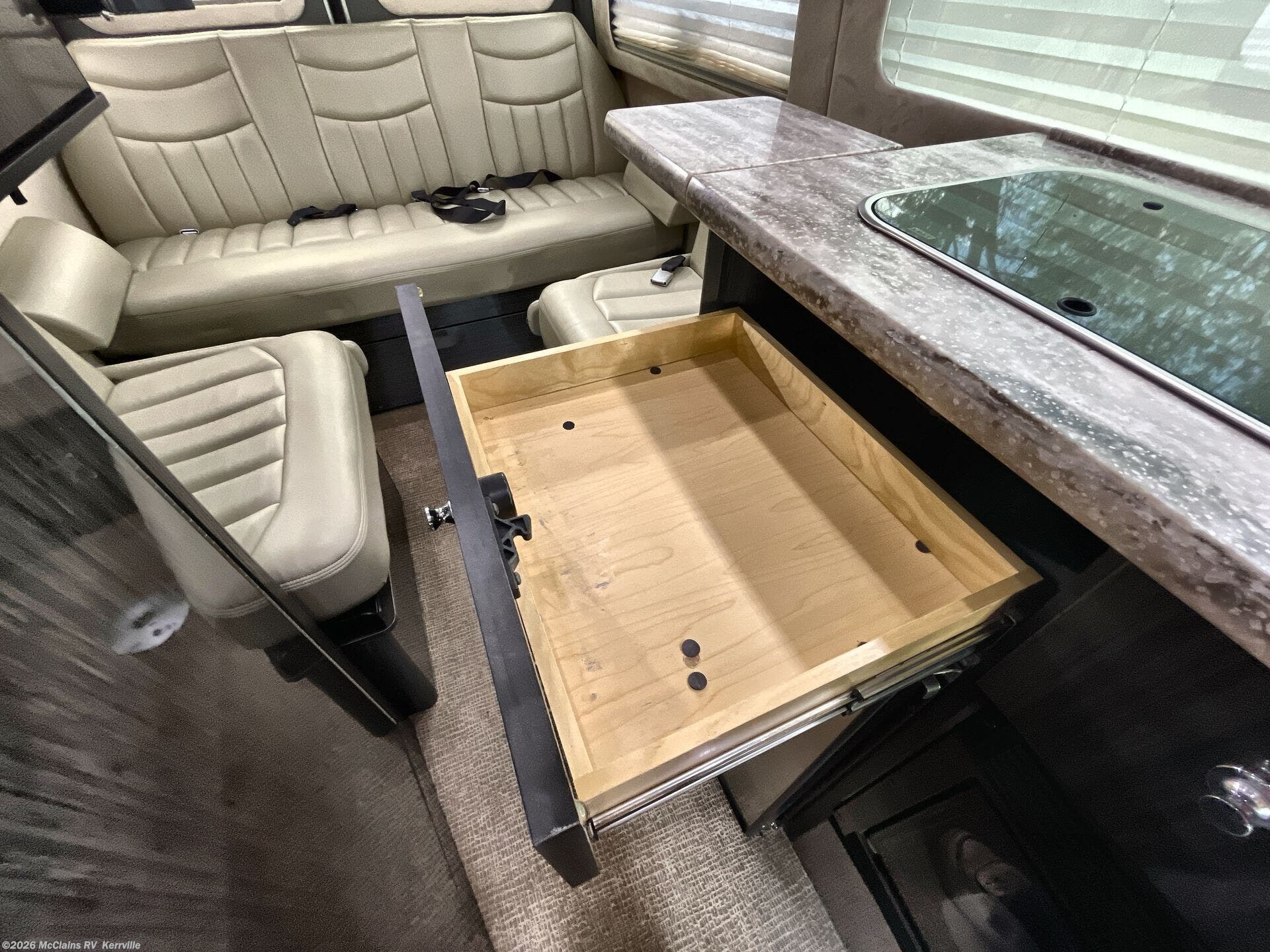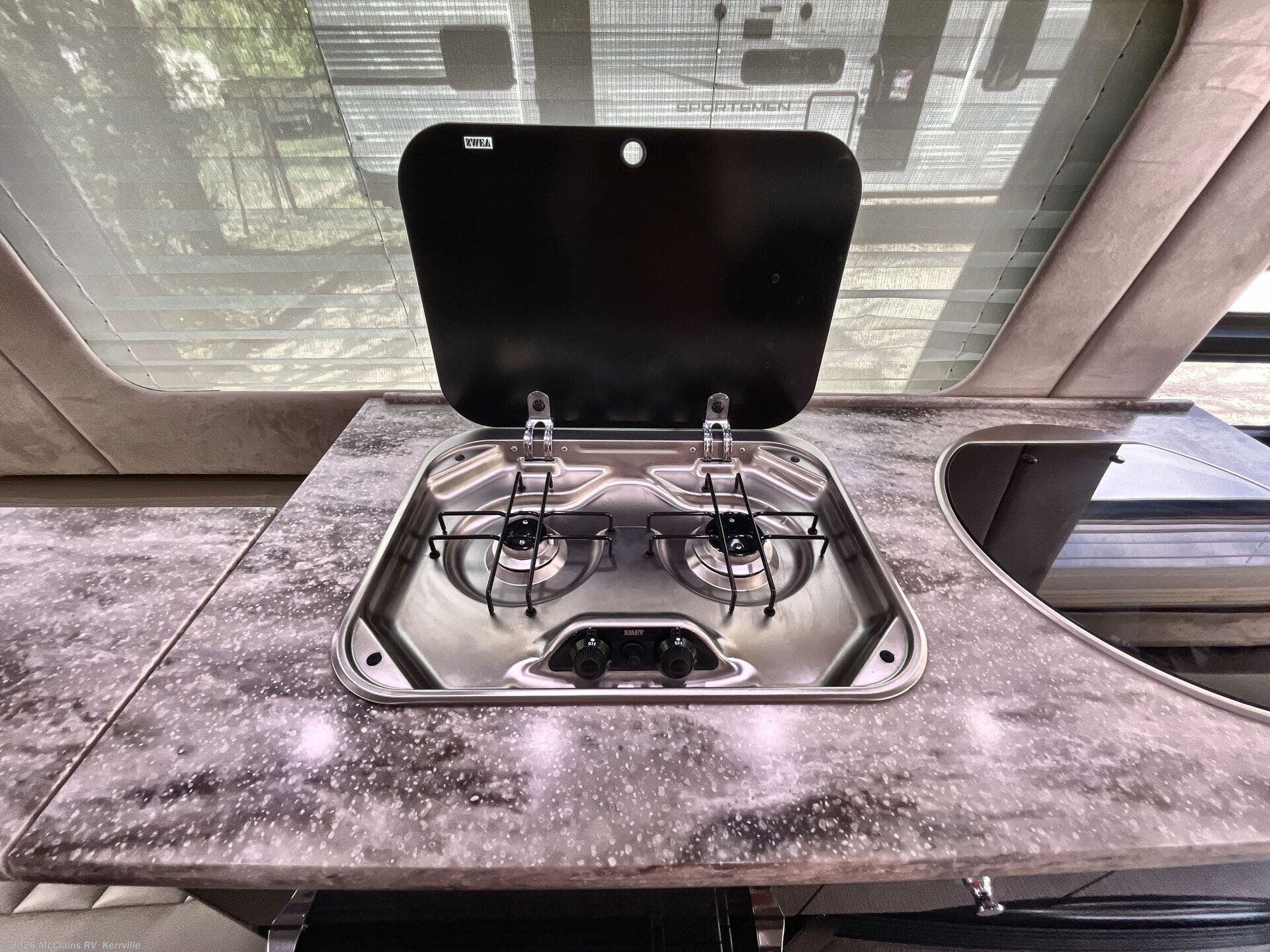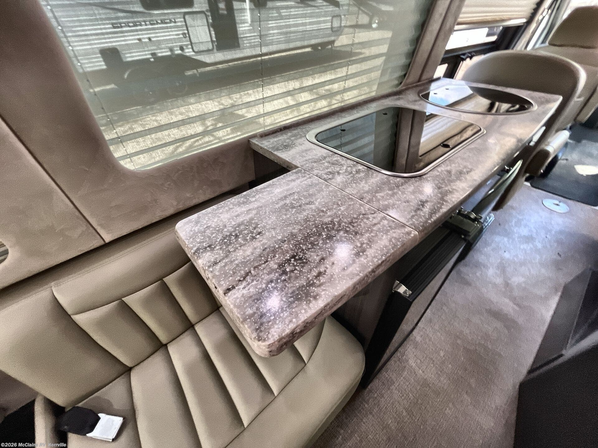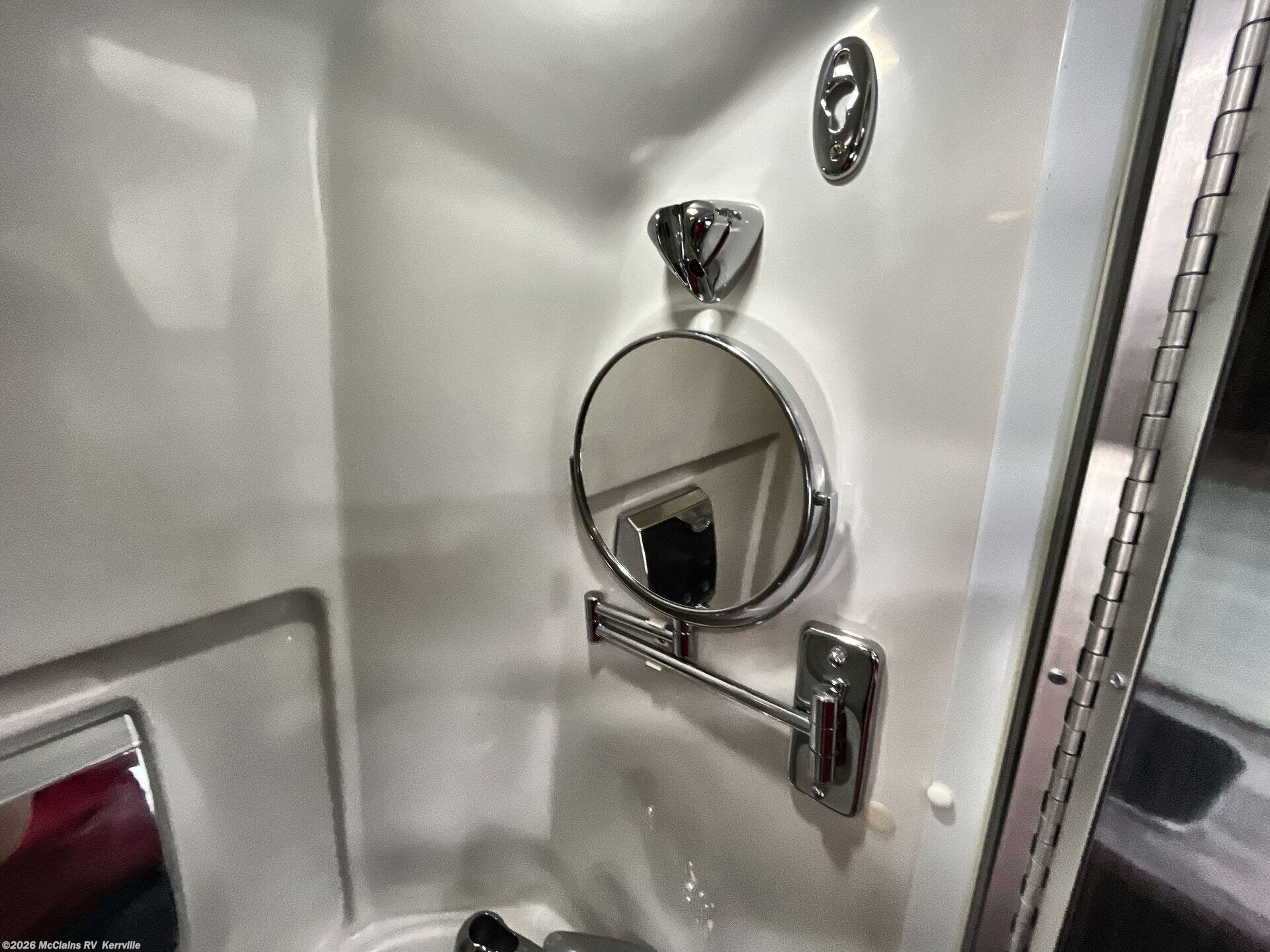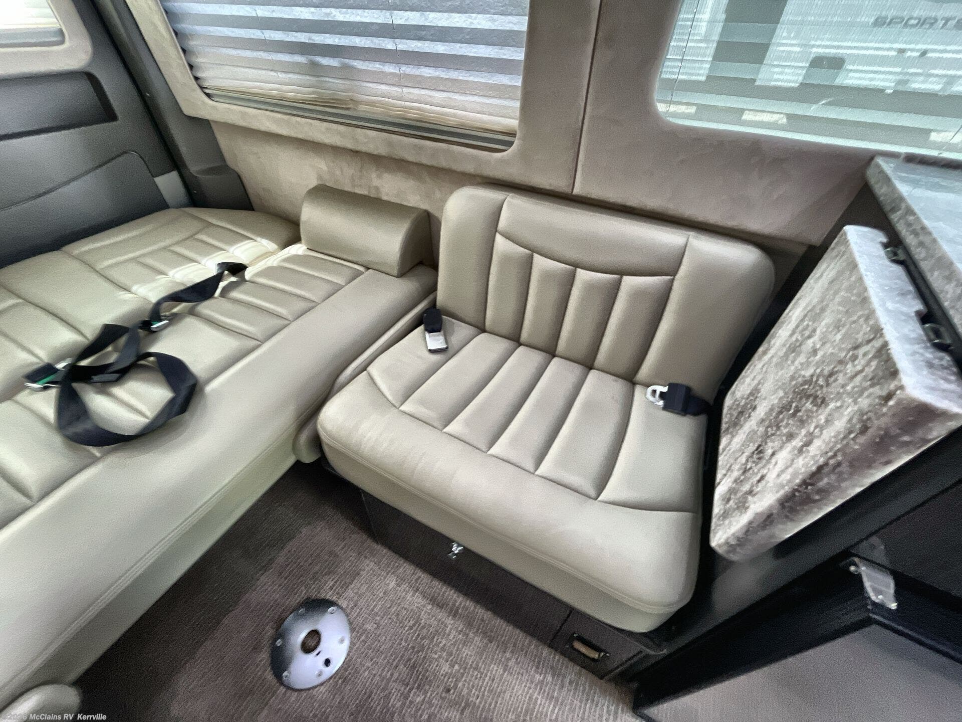 - Interior comforts: Furnaced heating, Microwave, Refrigerator, Stove top burner, Medicine cabinet, Shower, Toilet, Theater seating, TV, Stereo system