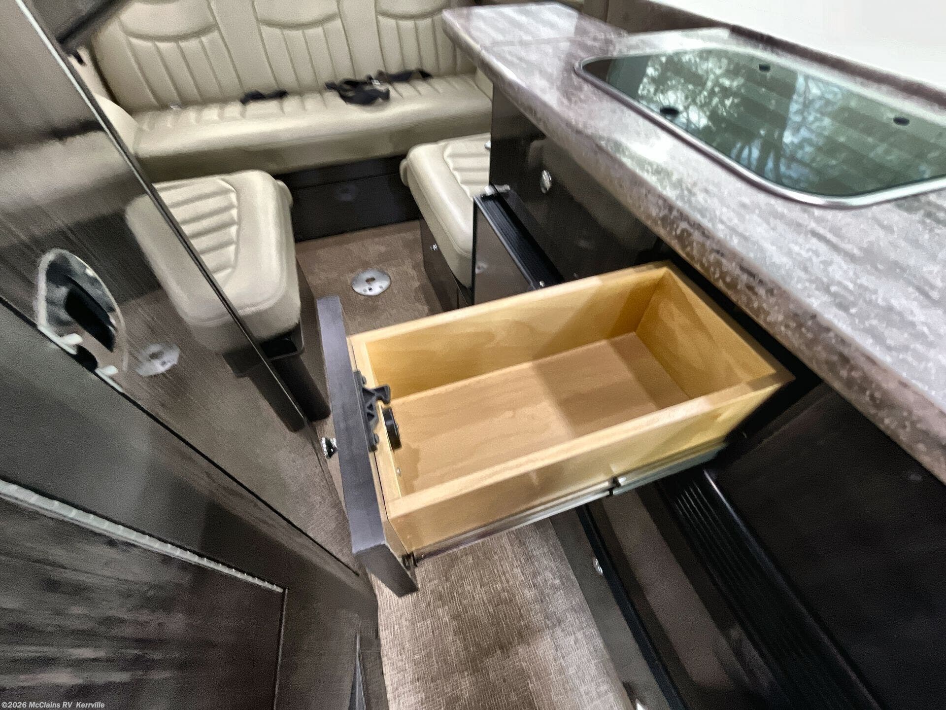 Inside, the LOUNGE floorplan focuses on a refined travel lifestyle. The well-appointed cab and living area feature theater seating, a compact kitchen with a microwave, refrigerator, and stove top burner, and essential conveniences like a furnace for all-season comfort and a shower combined with a toilet for complete self-contained living. The vehicle runs on a diesel-powered 3.0L V6 Turbo Diesel engine delivering 188 HP and 325 lb-ft of torque, paired with a 5-speed automatic transmission for smooth highway cruising. Electrical comfort comes from 50 Amp service, batteries, and a dependable generator, while single-zone air conditioning delivers relief on hot days.